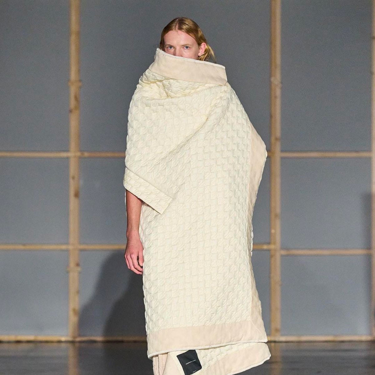 Stagione dopo stagione si diffonde l’amore per il “duvet coat”, giubbotti che nascono dall’incrocio tra una coperta e un piumino, fino ad arrivare al 2019 quando gli stiliti puntano sulla coperta di lana come cappotto, o come sciarpa. L’ultimo in ordine cronologico è il cappotto coperta di Federico Cina, una trapunta soffice e leggera lavorata a mano, che avvolge il corpo fino a coprire il volto. Ricordate Billie Eilish e Jesse Rutherford ai Film Gala 2022? La coppia ha sfilato sul red carpet avvolta dalla stessa coperta firmata Gucci, comprese la sottoveste per lei e il pigiama per lui, e la mascherina per dormire indossata come fascia per capelli. Se uscire in pigiama è un sogno, qui ci troviamo direttamente al livello successivo.