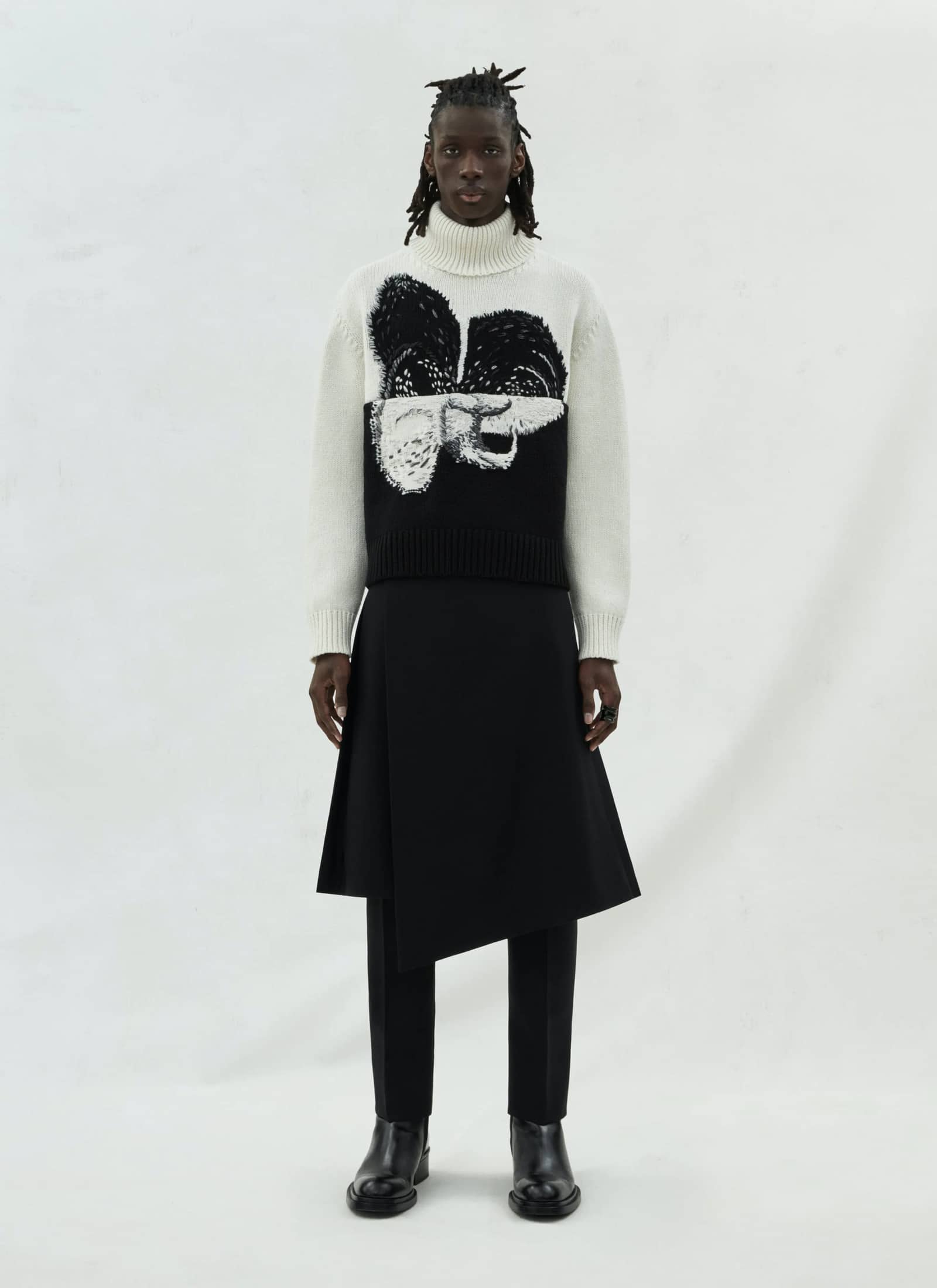 Oltre a ciò vengono inseriti anche specifici riferimenti ai primi anni di operato dello stilista: i kilt in lana nera, asimmetrici e portati sopra pantaloni a sigaretta traducono l’animo avanguardistico della maison, mentre tagli precisi e le silhouette imponenti degli abiti sono diluiti con dettagli più morbidi sbocciando in stampe e ricami. Il motivo dell’orchidea compare in molti capi della collezione sotto forma di delicate serigrafie o in ornamenti di perline.