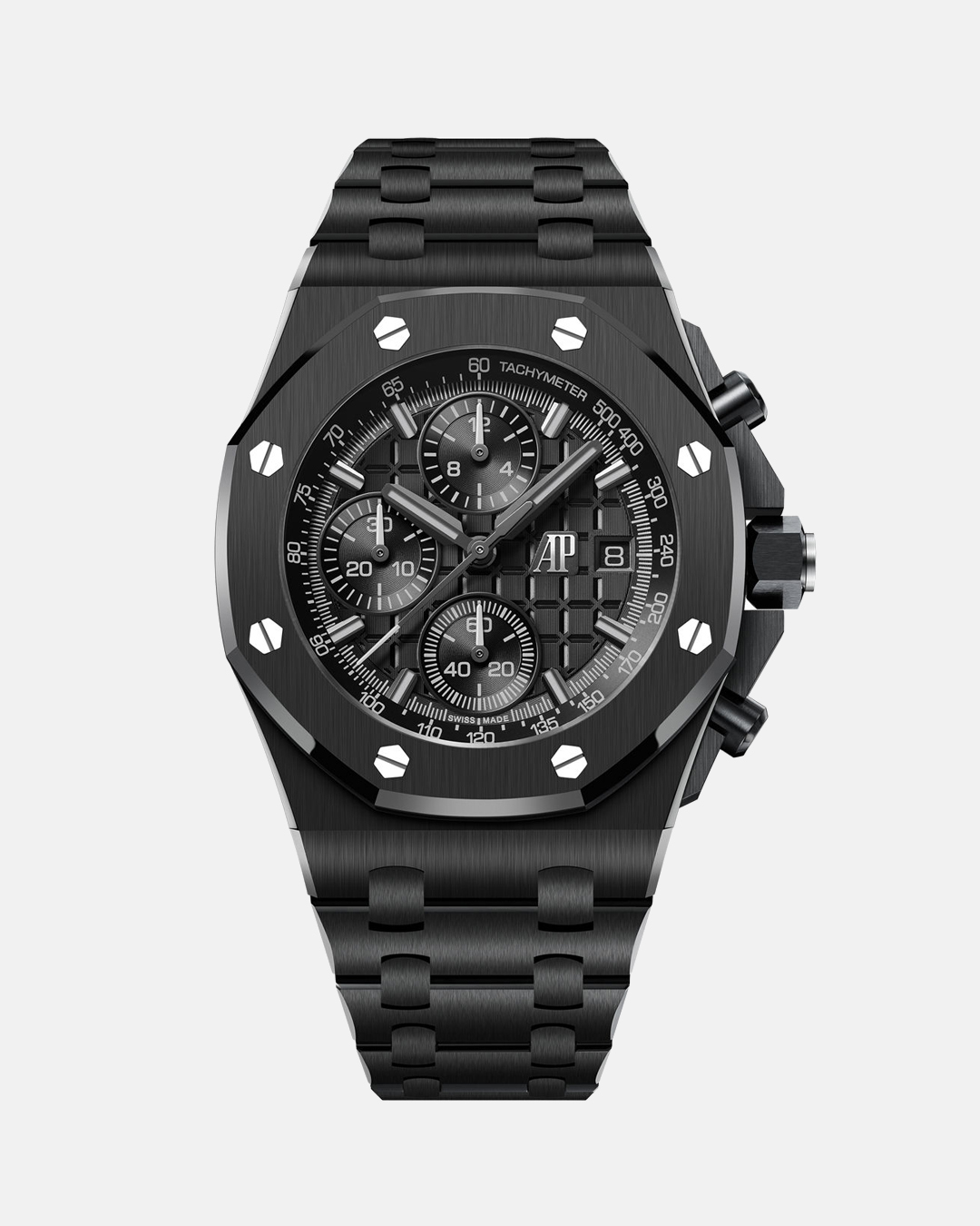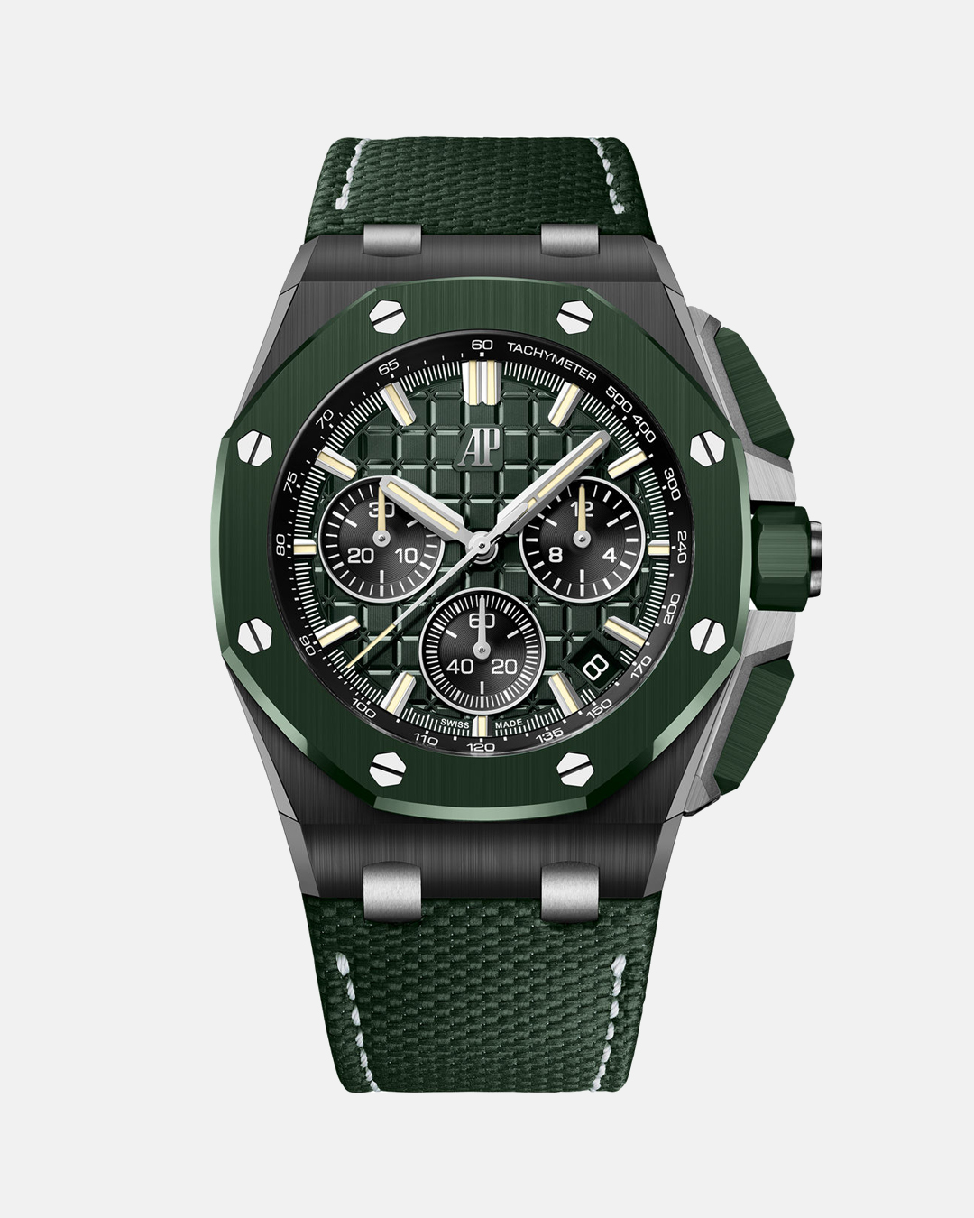Ai festeggiamenti si uniscono anche due Royal Oak Offshore Cronografo Automatico, disponibili in due nuove varianti in ceramica. Il motivo Méga Tapisserie e il logo AP arricchiscono il dial di entrambi gli orologi, che si differenziano tra loro per le dimensioni e per il colore. Nel primo caso (ref. 26420), infatti, troviamo una cassa da 43 mm e un contrasto tra verde, nero e titanio che pervade l’intero accessorio, dotato di cinturino in pelle testurizzata. Il secondo segnatempo (ref. 26238), invece, presenta un intramontabile look total-black, che pervade sia la cassa da 42 mm che il bracciale integrato in ceramica. I prezzi sono di 59.100€ per il Royal Oak verde e di 88.100€ per quello nero.