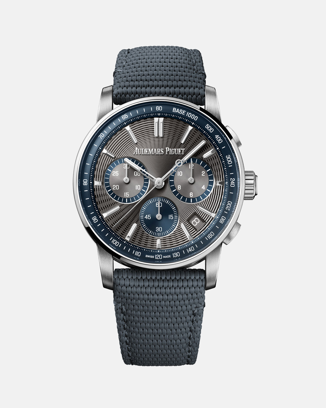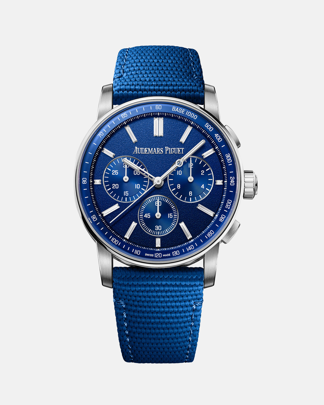 I due Royal Oak (ref. 26674), dal carattere più sportivo, si distinguono per il leggendario quadrante Tapisserie, tono su tono nella versione in oro rosa e blu in quella in acciaio, mentre sul quadrante del Code 11.59 ( ref. 26494) spicca un raffinato azzurro con effetto fumé, che conferisce un tocco di eleganza in più.