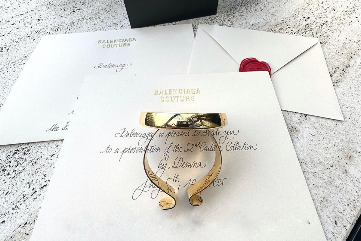 Per quanto riguarda gli inviti alla 52esima sfilata Couture, il brand del gruppo Kering ha optato per la creazione di un vero e proprio accessorio ad-hoc. Si parla più precisamente di un braccialetto dorato con incisione del branding Balenciaga, che si ispira ai polsi magnetici tipicamente indossati dal personale dell’atelier come contenitore per spilli e aghi sciolti.