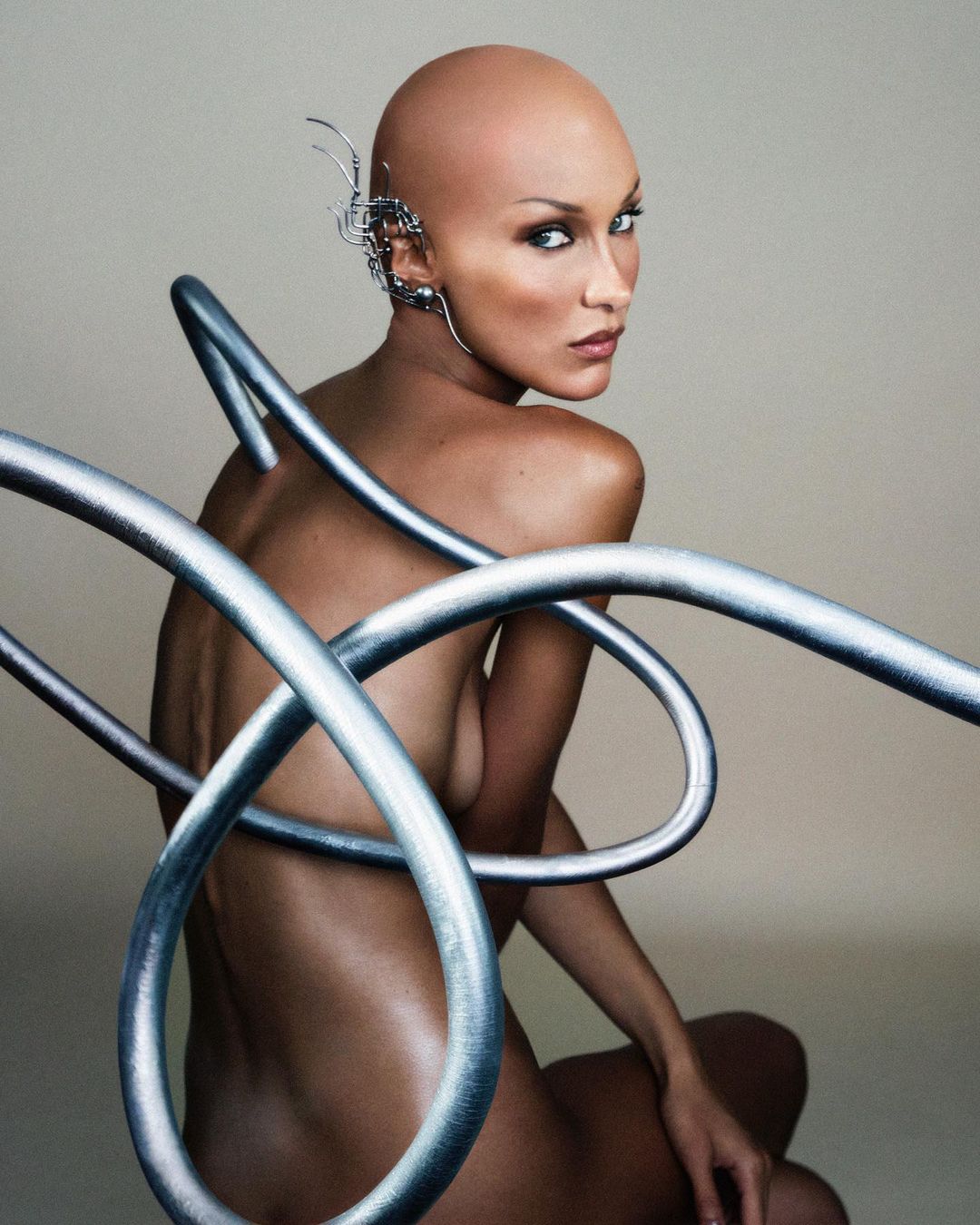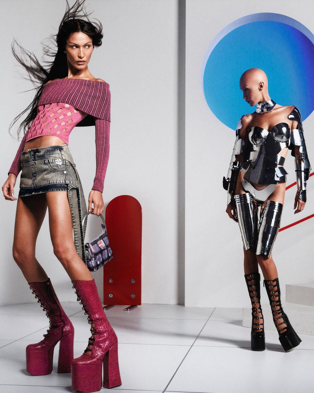 La supermodella rappresenta l’incontro tra alta moda e tecnologia in una serie di scatti ad opera di Carlijn Jacobs, incentrati su elementi IA che aggiungono un bagliore futuristico all’estetica del marchio dei primi anni 2000. Nel progetto, ispirato all’impatto che l’intelligenza artificiale potrà avere sulle nostre abitudini, Bella incarna l’idea di un cyborg, sfoggiando un look futuristico composto da stivali, lingerie metallica, e una miniskirt in denim. A molti utenti del web, le sue fattezze hanno ricordato alcune delle sculture più celebri di Hajime Sorayama.