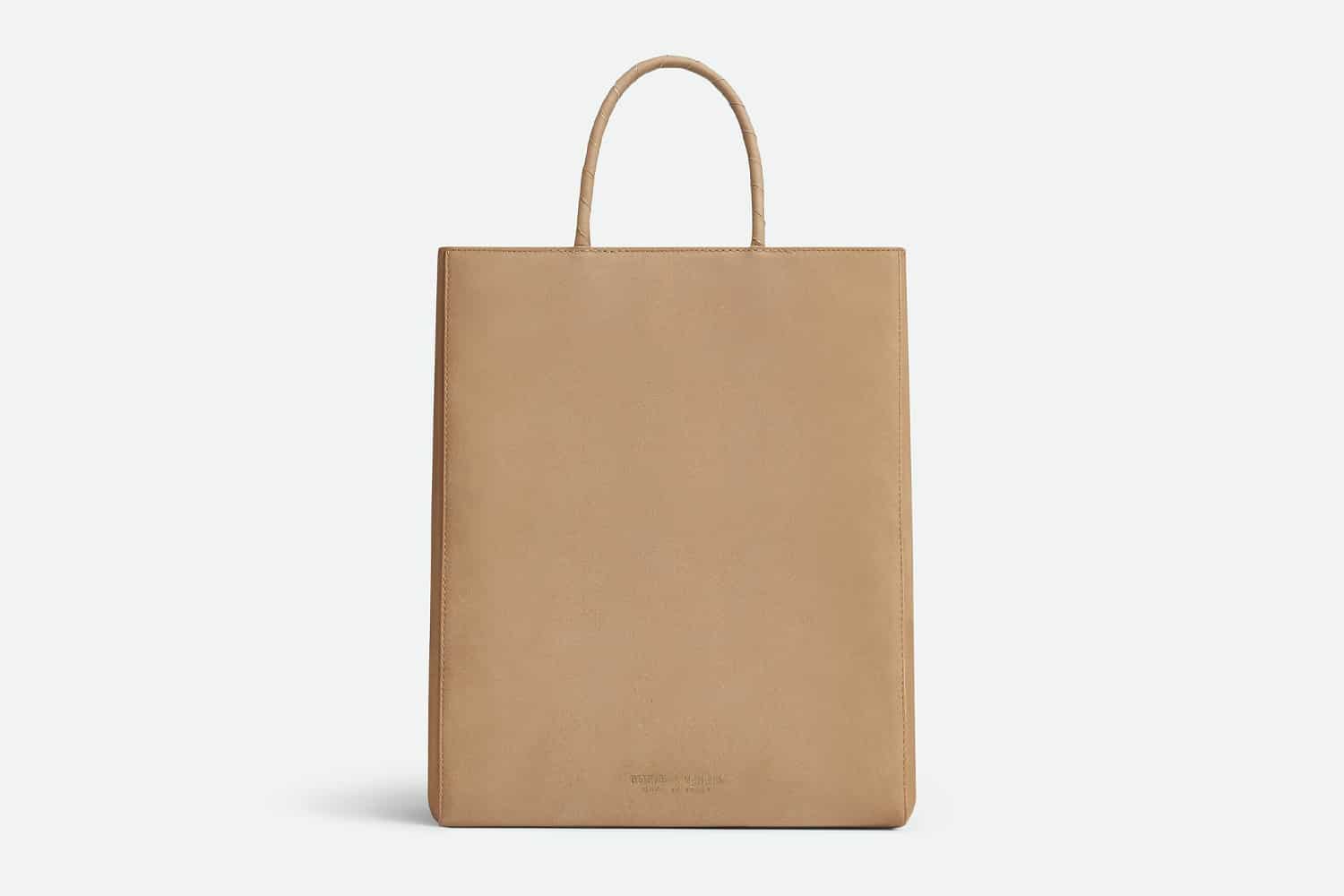 La costruzione esterna è in pelle “simile alla carta”, come descrive il brand stesso, mentre all’interno la borsa risulta rivestita in pelle scamosciata. La borsa è poi accompagnata da un manico a goccia progettato per assomigliare ai manici che sostengono i tradizionali sacchetti di carta marrone.