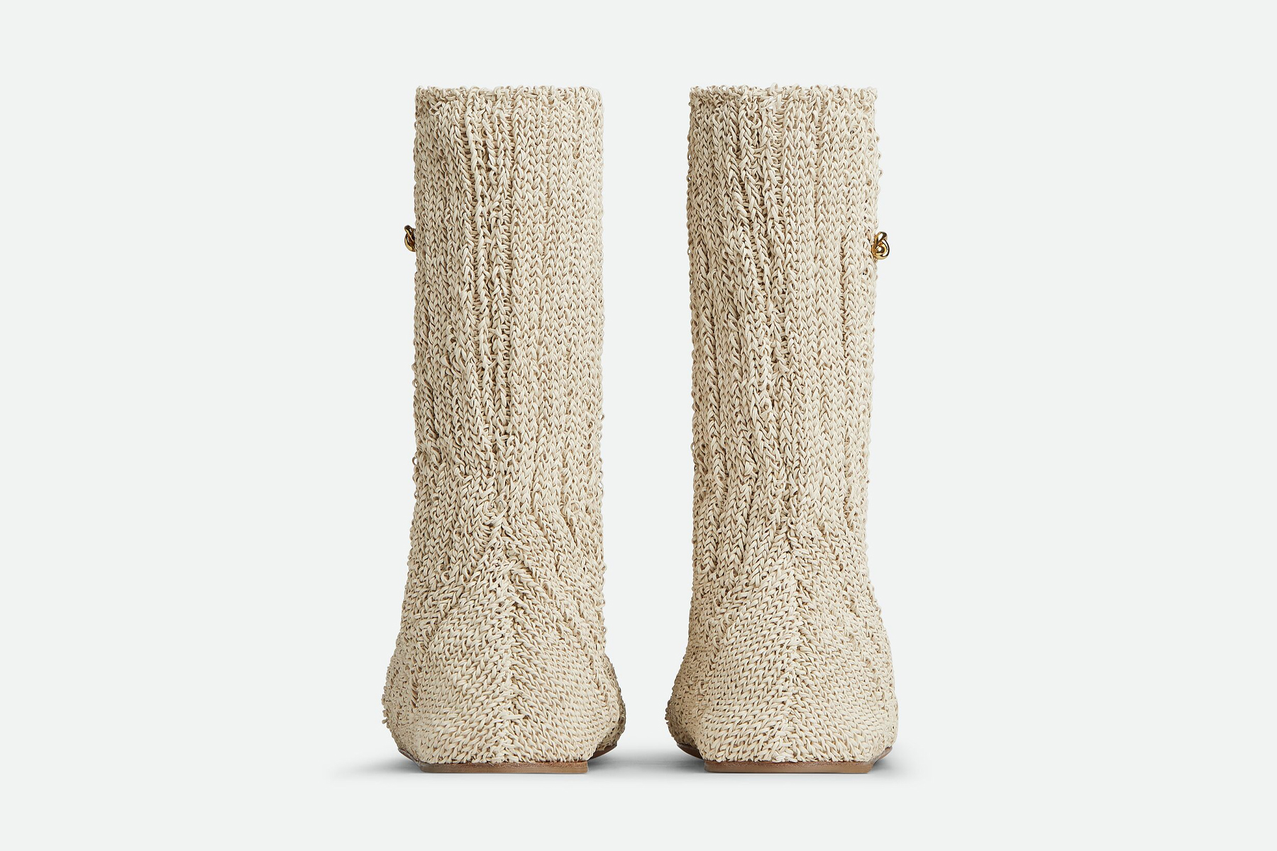 L’assenza della pelle consente di far emergere il protagonismo del tessuto lavorato a maglia, che impreziosisce l’intera struttura dello stivale costituendo in tutto e per tutto la forma a collo alto della calzatura. A ciò viene affiancata una spilla in corrispondenza della calzata.