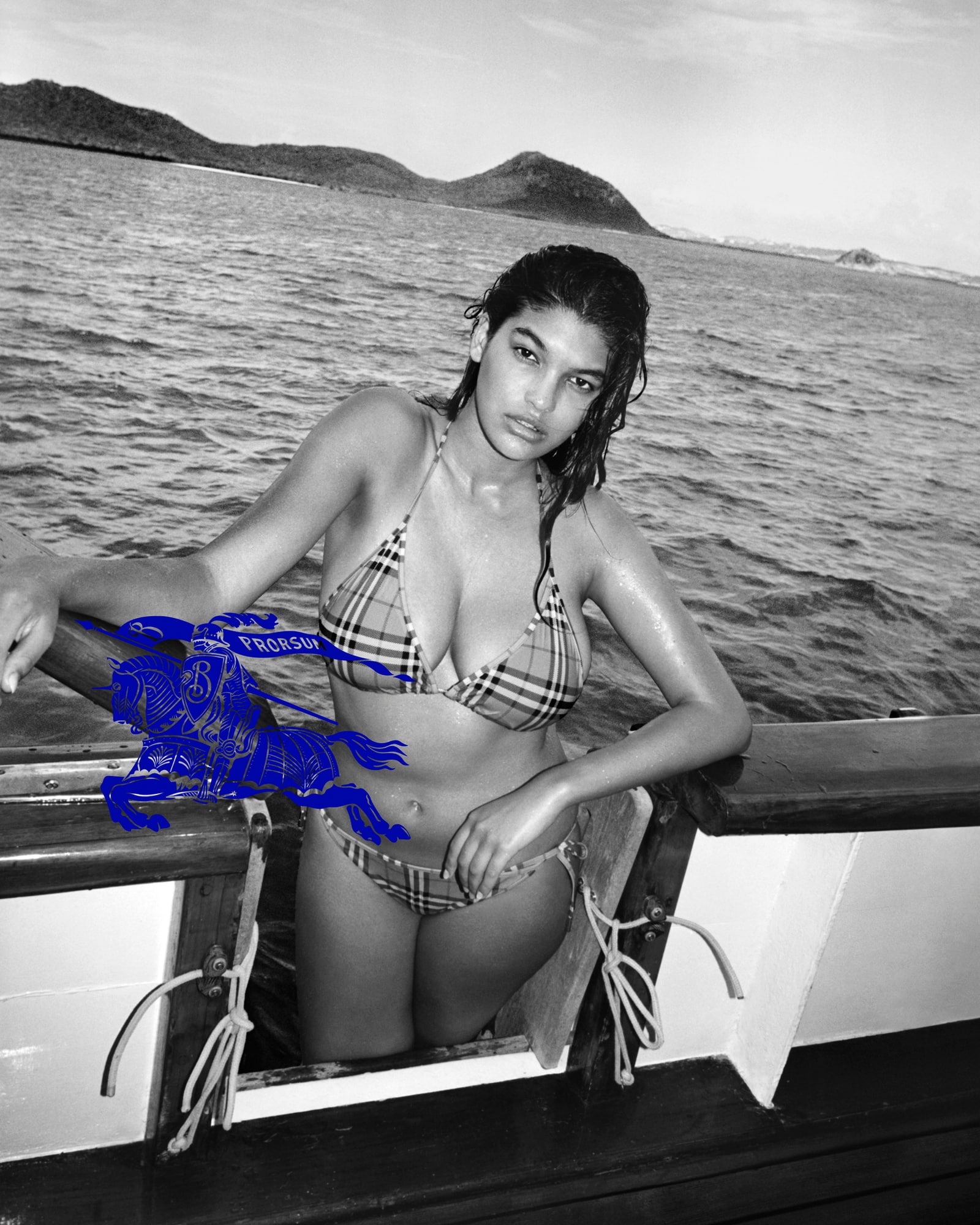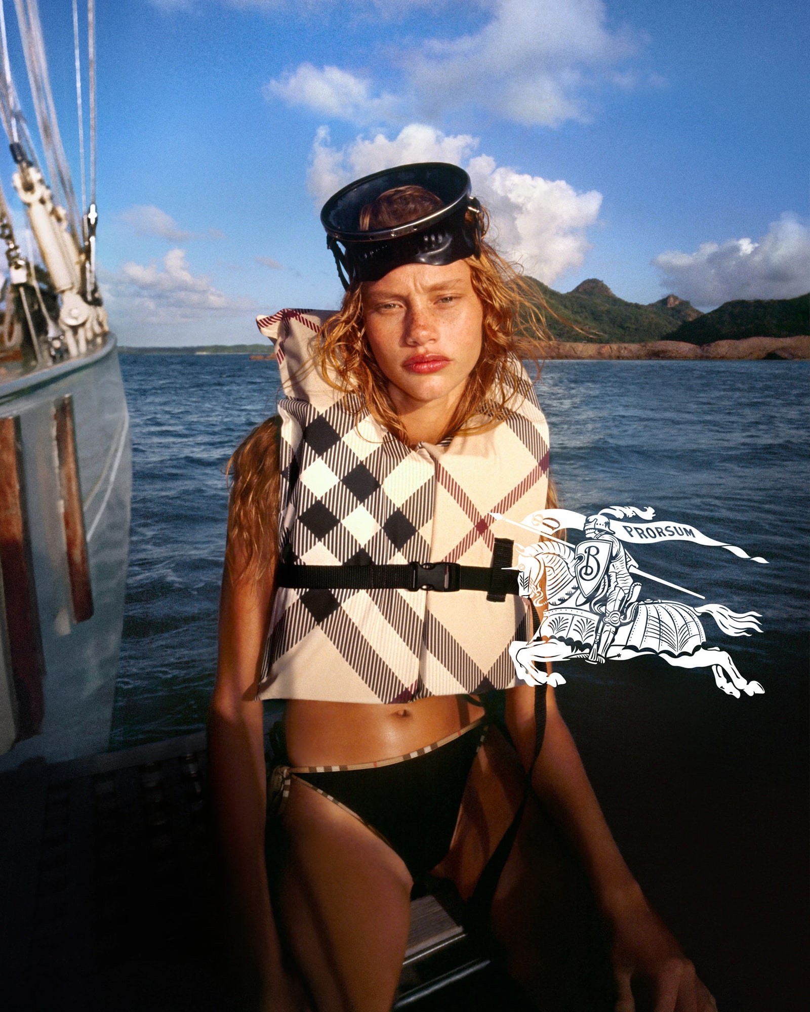 Gli scatti dal forte sapore estivo mettono in evidenza bikini, costumi a taglio corto, bucket hat, tote bag, asciugamani, vestaglie e persino un giubbotto di salvataggio, tutti rigorosamente pervasi dall’iconografia della maison britannica. Il Burberry Check è stato introdotto per la prima volta negli anni ’20 come fodera per i trench caratteristici della casa, ed è stato rianimato dall’ex direttore creativo Christopher Bailey nei Duemila.