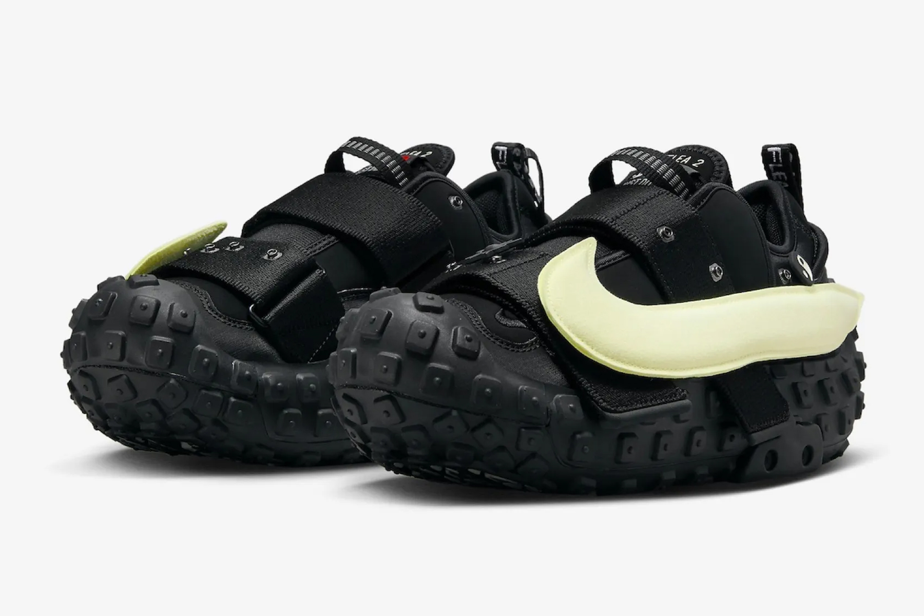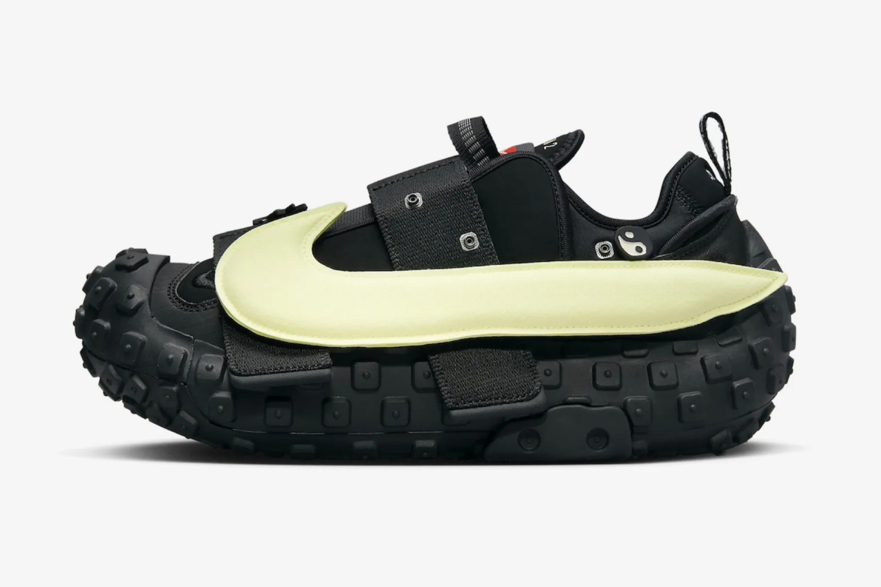 Anche lo Swoosh è sovradimensionato, e ugualmente rimovibile, svelando così due cinghie che tengono saldo il piede e si sostituiscono al tradizionale sistema di allacciatura. Altre feature riguardano l’intersuola, che si presenta in tonalità arcobaleno, così come le linguette posizionate all’altezza del tallone, e infine una sagoma anatomica fluorescente che compare sull’outsole.