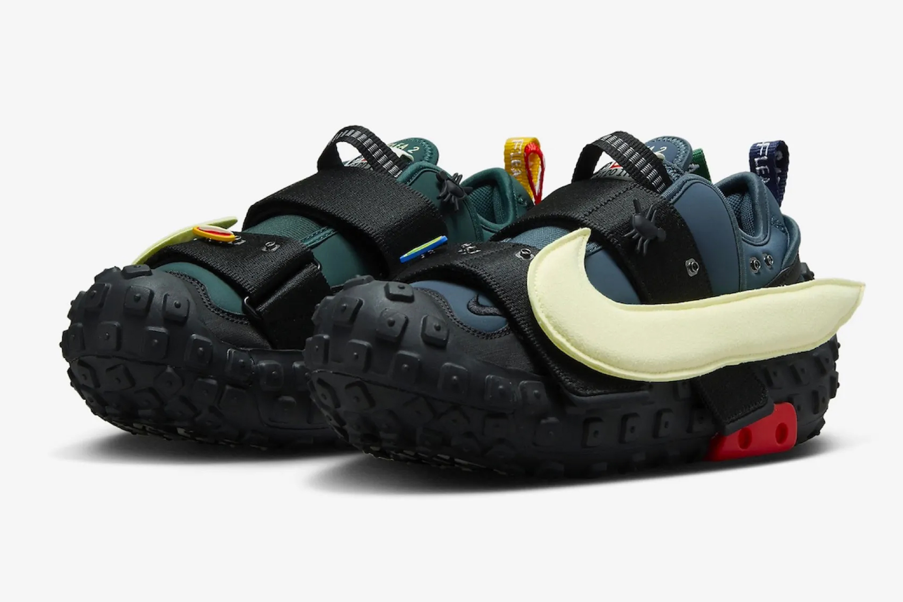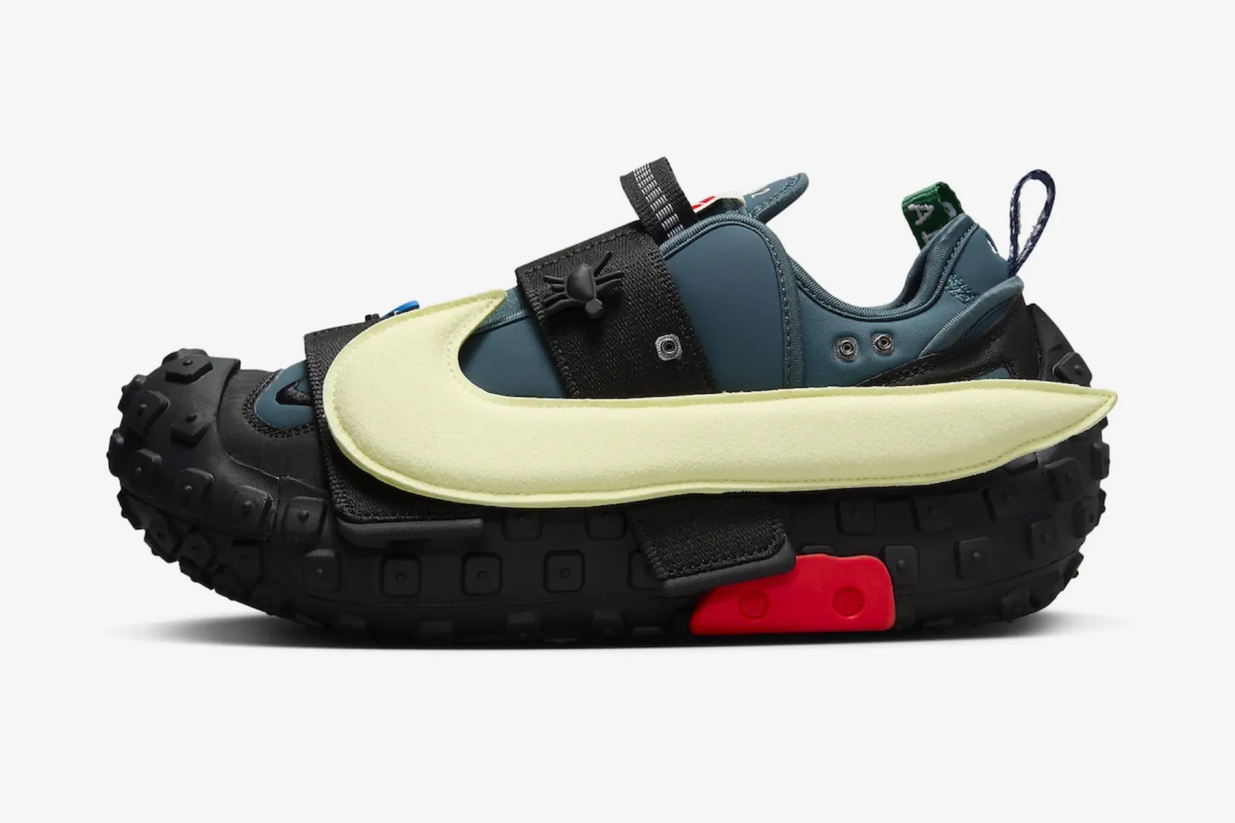 Due saranno le varianti disponibili: una con upper nero, e l’altra che presenta tonalità alternate di blue navy e verde. Tutta la struttura della scarpa si presenta con proporzioni esagerate, ed è costituita da una tomaia in neoprene, su cui spiccano i rilievi dell’outsole, che si estendono oltre la suola stessa. Per poter concedere ampia personalizzabilità alla silhouette sono presenti una serie di bottoni a clip che permettono di aggiungere charm decorativi rilasciati insieme alla scarpa.