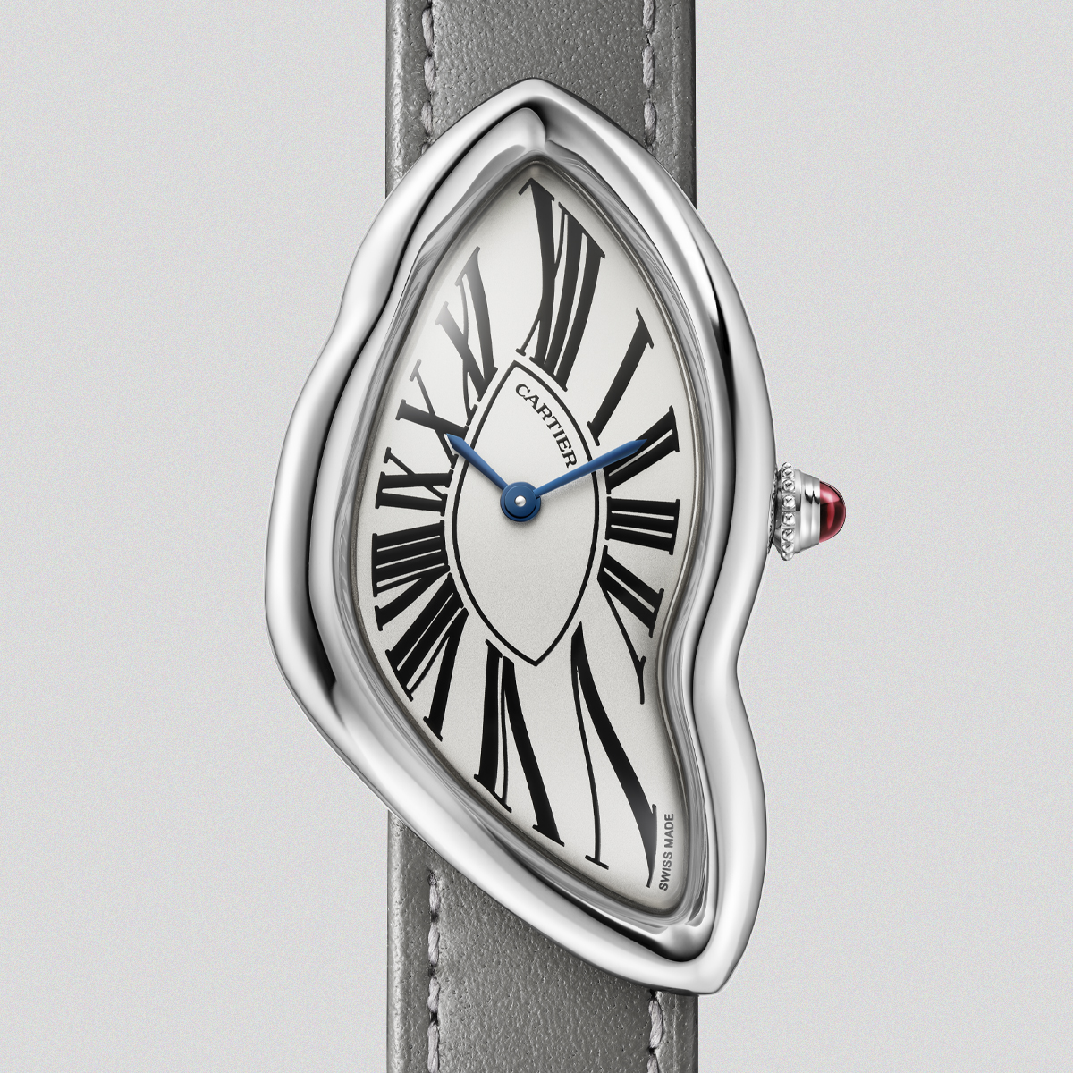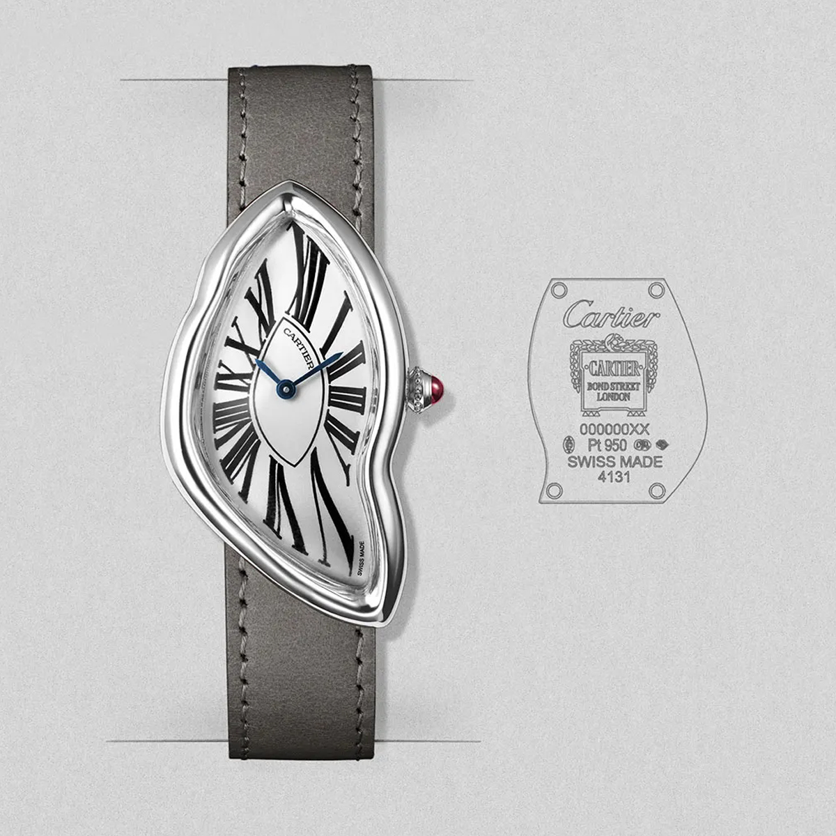L’attenzione ai dettagli è evidente nel quadrante, che rimane fedele al design originale Cartier Crash del 1967. Oltre a ciò, la nuova edizione in platino vanta una speciale incisione sul retro ed è completata da un elegante cinturino in pelle di vitello grigio, che aggiunge un tocco di lusso e raffinatezza.