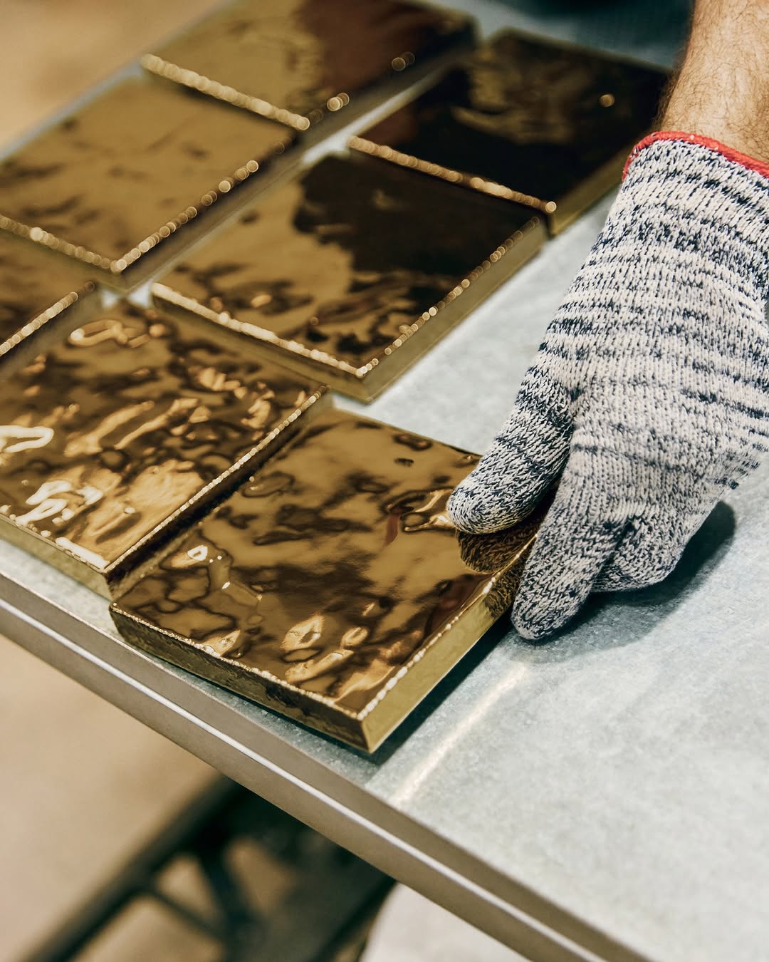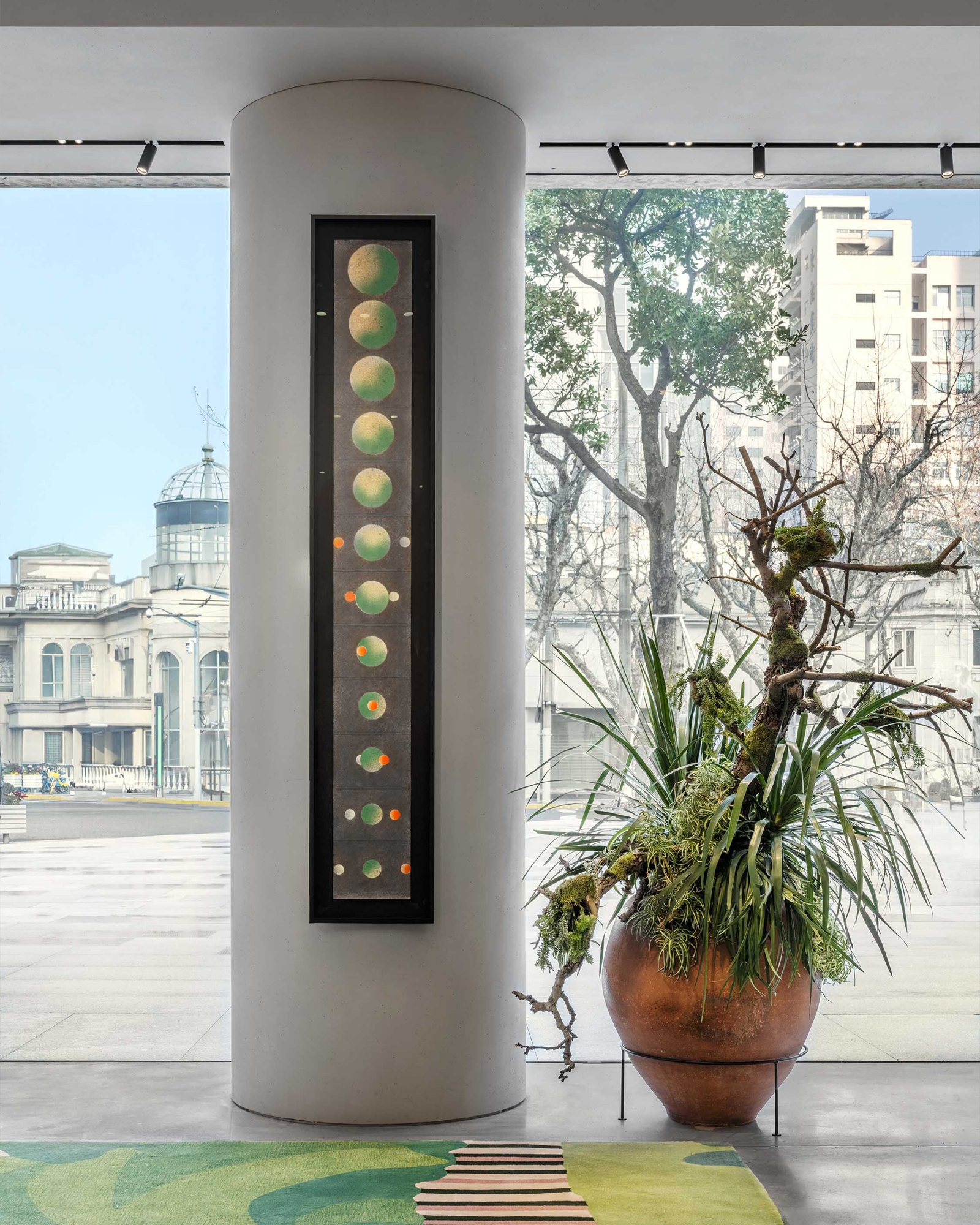 Il complesso rivestimento è stato ottenuto affiancando circa 35.536 piastrelle in ceramica dorata, realizzate a mano dagli artigiani dello Studio Cumella utilizzando materiali provenienti esclusivamente dalla zona orientale del Paese iberico. Il risultato è un’elegante superficie riflettente, che interagendo con la luce solare trasforma il negozio in un vero e proprio faro tanto per la maison quanto per il distretto, richiamando con i suoi bagliori i tetti dorati del Tempio di Jing’an poco distante.