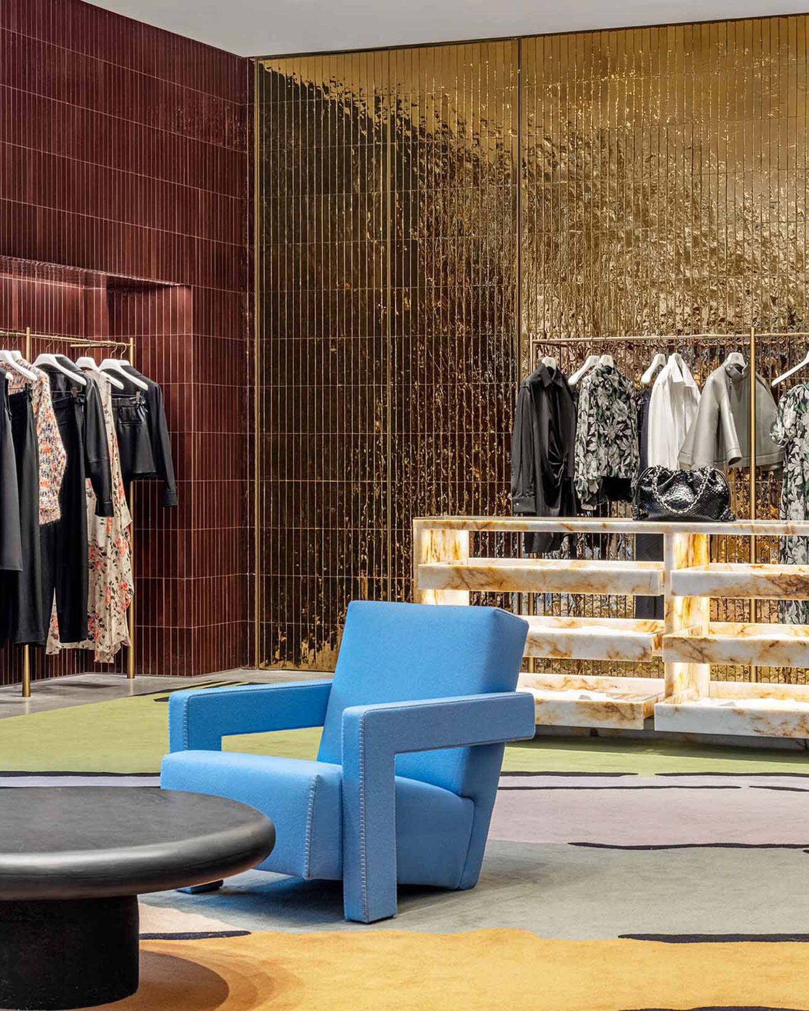 All’interno della boutique, che vanta una superficie di 625 metri quadrati distribuita su due piani, le pareti colorate danno continuità all’estetica intrapresa all’esterno, anche in questo caso grazie alle pregiate mattonelle artigianali dello Studio Cumella. Gli ambienti sono arricchiti da una selezione di opere d’arte provenienti direttamente dalla collezione del brand, che elevano l’esperienza di acquisto. Tra gli articoli in vendita troviamo un’ampia selezione di capi e accessori tra prêt-à-porter maschile e femminile, borse, pelletteria, scarpe, occhiali, gioielli, profumi per la casa e altri prodotti.