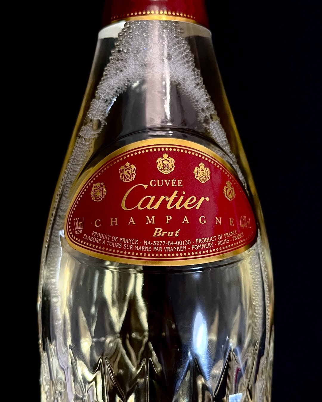 La bottiglia realizzata per Cartier si distingue già nella forma. È realizzata in cristallo finissimo da 750 ml e concepita come oggetto da collezione, più vicino all’universo della gioielleria che a quello del consumo quotidiano, con una presentazione curata fino al dettaglio del cofanetto originale, rigorosamente rosso come il packaging della maison. Non è un caso che venga spesso conservata sigillata, nel suo involucro in plastica arancione; in molti casi viene trattata come un pezzo da esposizione, al pari di un oggetto di design.