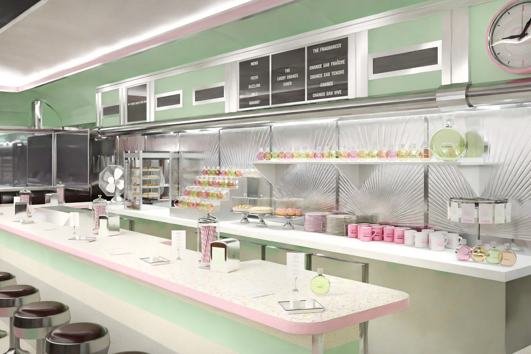 Dentro il Lucky Charm Diner sarà quindi ampiamente percepita l’ispirazione all’iconica linea di profumi Chance, in particolar modo per quanto riguarda la palette colori, dominata dalle pallide tonalità di rosa e verde menta che contraddistinguono le boccette della collezione.