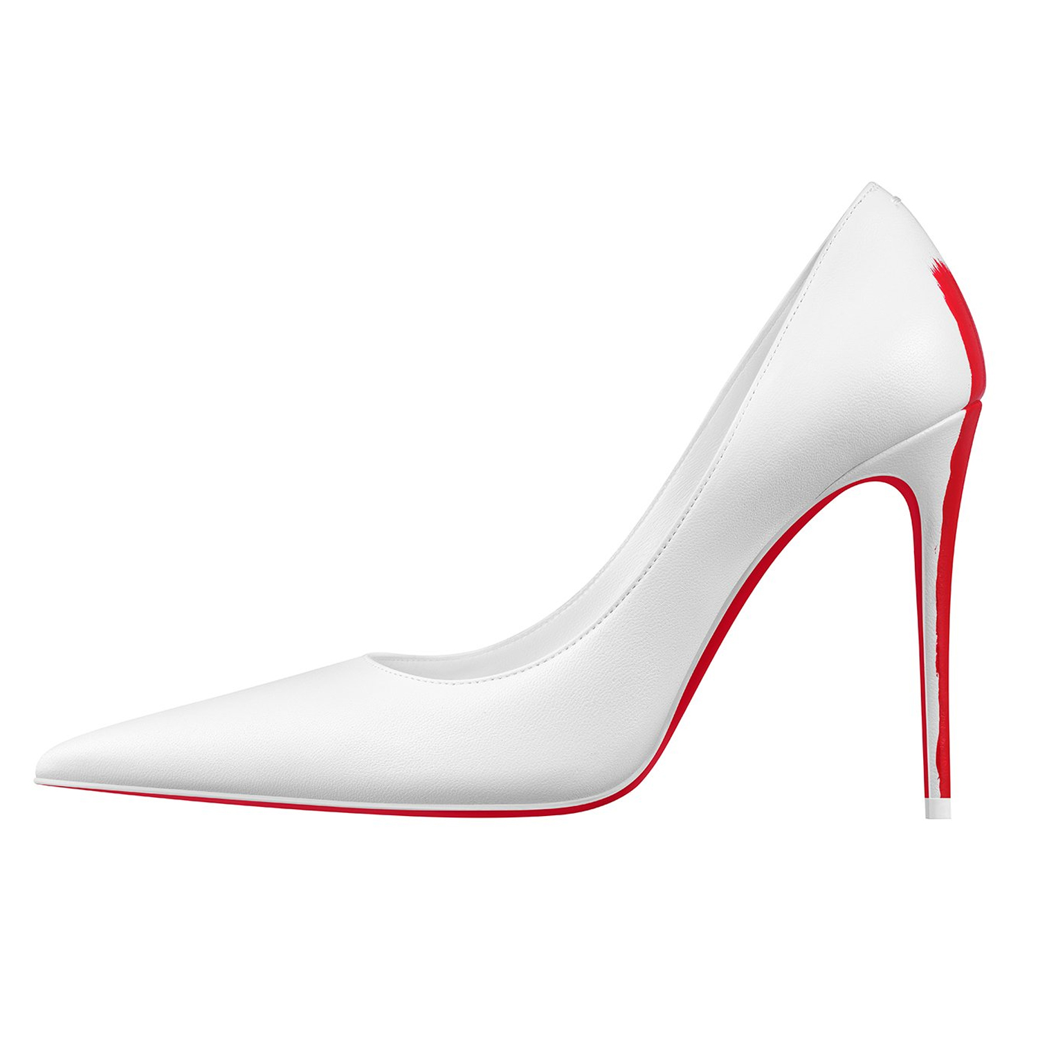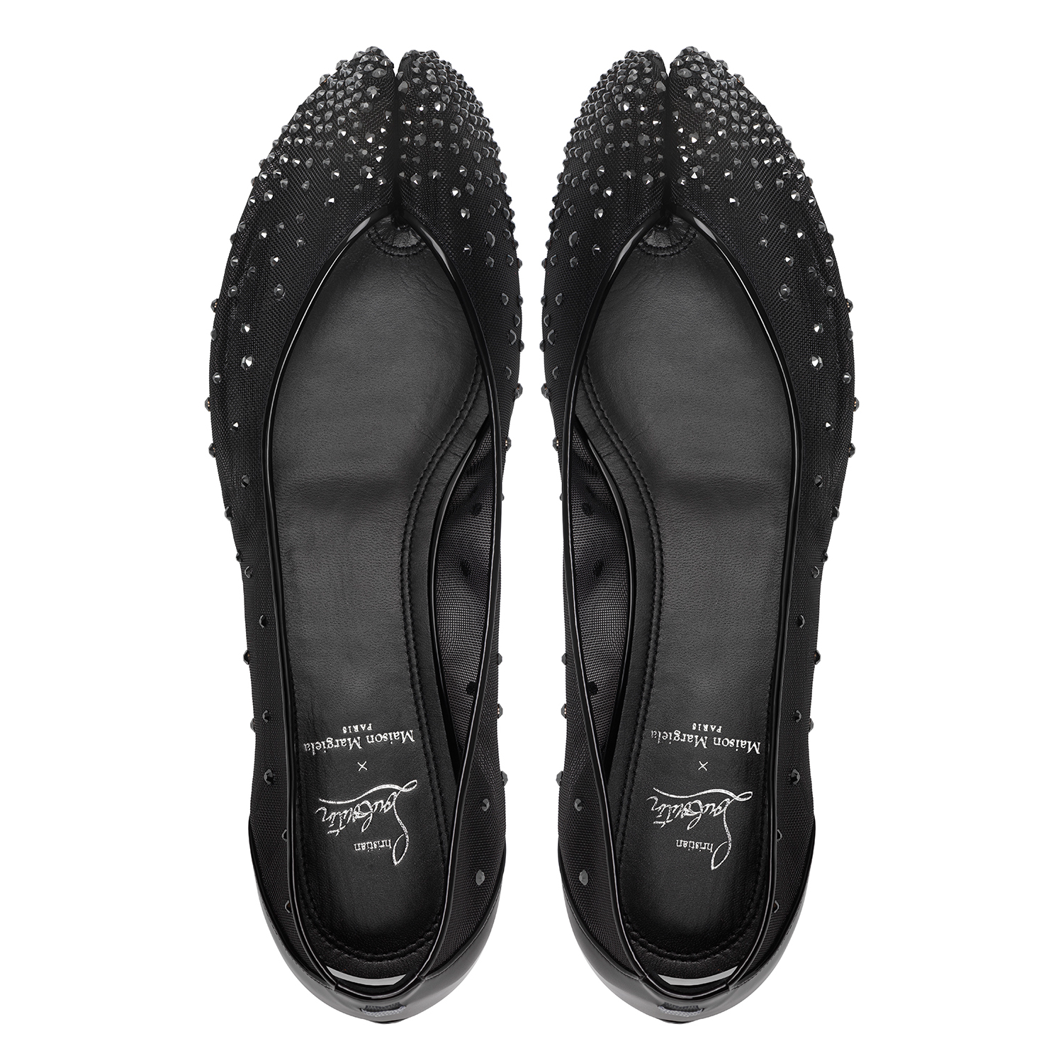 Louboutin ha voluto unire i loro universi creativi immaginando una versione delle Tabi classicamente femminile. Così la silhouette si fa più sottile, la scollatura è più profonda rispetto alla versione originale e alcune sono ricoperte da una pioggia di strass. Galliano, invece, rielabora i modelli classici di Louboutin, immergendoli nel DNA di Maison Margiela. Come la décolleté Martinloula, ispirata alla tecnica del décortiqué, o la décolleté Martoubi, che, secondo Louboutin, racchiude alla perfezione le anime delle due case di moda. Una “semplice” pennellata rossa sul dorso di una Kate, se se ne riconosce l’identità, può trasformare l’immaginario che racconta una scarpa.