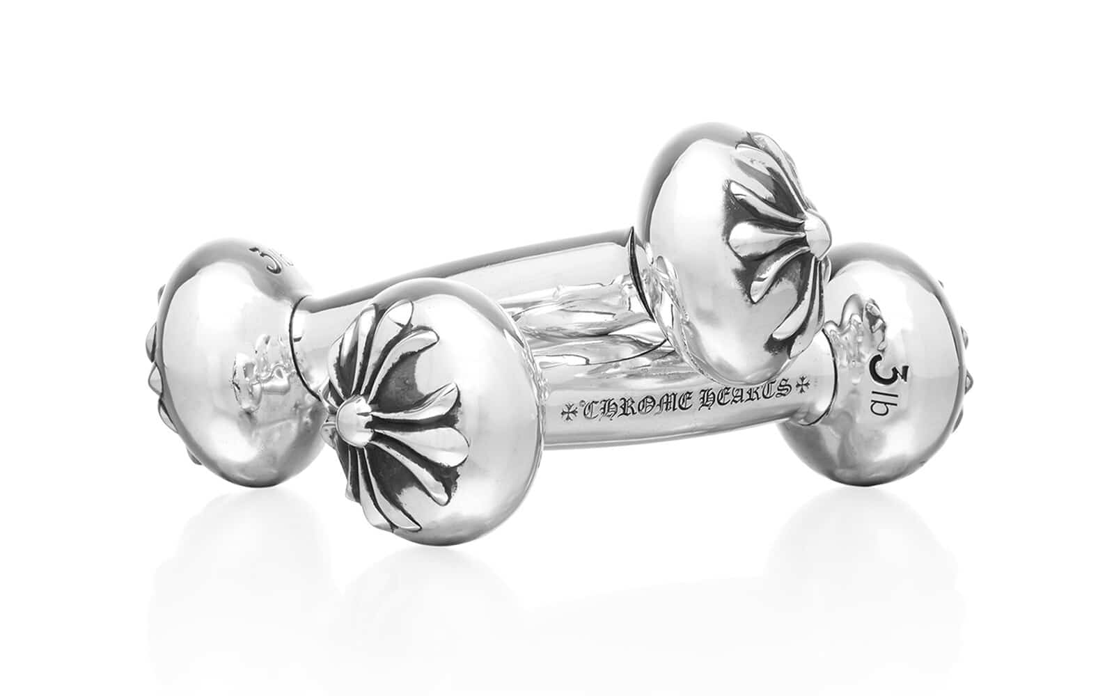 Avendo acquisito specialmente negli ultimi anni una fama sempre più importante all'interno del fashion system, Chrome Hearts si sta dedicando recentemente anche alla produzione di accessori lifestyle che possano andare a integrare le proprie considerevoli vendite in termini di gioielleria e di abbigliamento.I capi e i gioielli del marchio californiano hanno conquistato un successo sempre più dilagante specialmente grazie all'aiuto di alcune figure appartenenti all'emisfero rap internazionale: sulla base del proprio incredibile grado di esclusività infatti, Chrome Hearts ha voluto adottare una politica di prezzo ben definita per ridurre al minimo l'accessibilità in termini di general release.Queste rilevanti pricing policies vengono applicate pertanto anche agli oggetti lifestyle prodotti dal marchio: nelle ultime ore infatti il brand ha presentato tramite i propri canali social l'arrivo di un esclusivo set di manubri da allenamento. L'item in questione è realizzato in argento sterling massiccio e viene venduto in coppia per gli appassionati di Chrome Hearts che desiderano arricchire ulteriormente la propria gamma di attrezzature da palestra; i manubri sono dotati di estremità decorate contrassegnate dalla presenza delle tipiche croci CH e della scritta “Chrome Hearts” incisa nella parte del manico. A completare il design interviene infine l'indicazione “3lb” formulata nel classico carattere di Chrome Heart (il peso corrispondente è di poco meno di 1,5kg).In vendita al prezzo di 5000 dollari (circa 4.300€), i Chrome Hearts 3lb Silver Dumbbells sono disponibili esclusivamente sul sito web del brand.