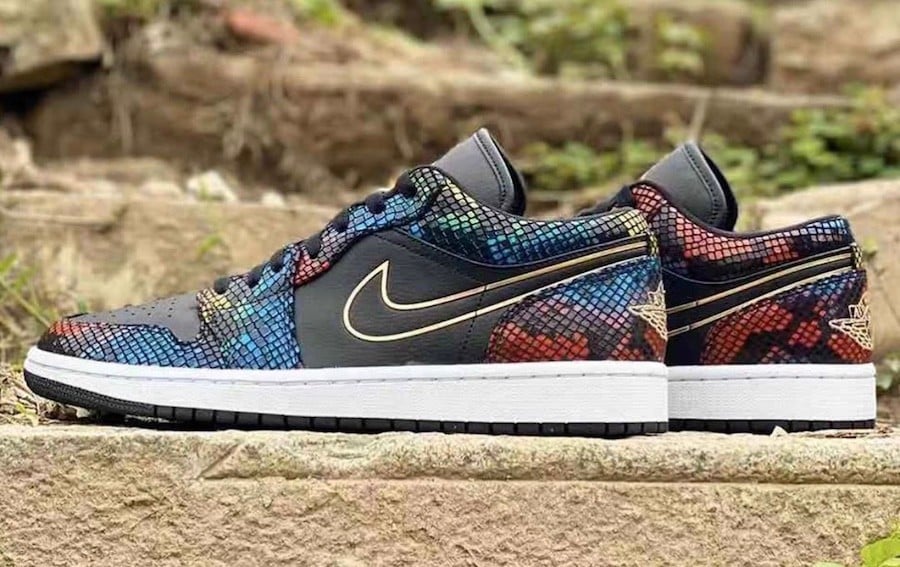 Realizzate in onore dell'eredità Afro-Americana, queste sneakers presentano alcuni elementi che le rendono a dir poco uniche. La tomaia, di base nera, accoglie pannelli realizzati con un pattern "snakeskin", le cui scaglie assumono una varietà di colori davvero ampia. Ad arricchire ulteriormente il look contribuiscono gli Swoosh, delineati da un contorno color oro, in tinta con il Jumpman presente sulla tongue, accompagnato dalla scitta "AIR". Una outsole nera e una midsole bianca bilanciano alla perfezione l'abbondanza di colori sfruttati per questa Air Jordan 1 Low. Infine, realizzato in un color "bianco panna", ritroviamo il classico "Wings Logo", cucito sull'heel.