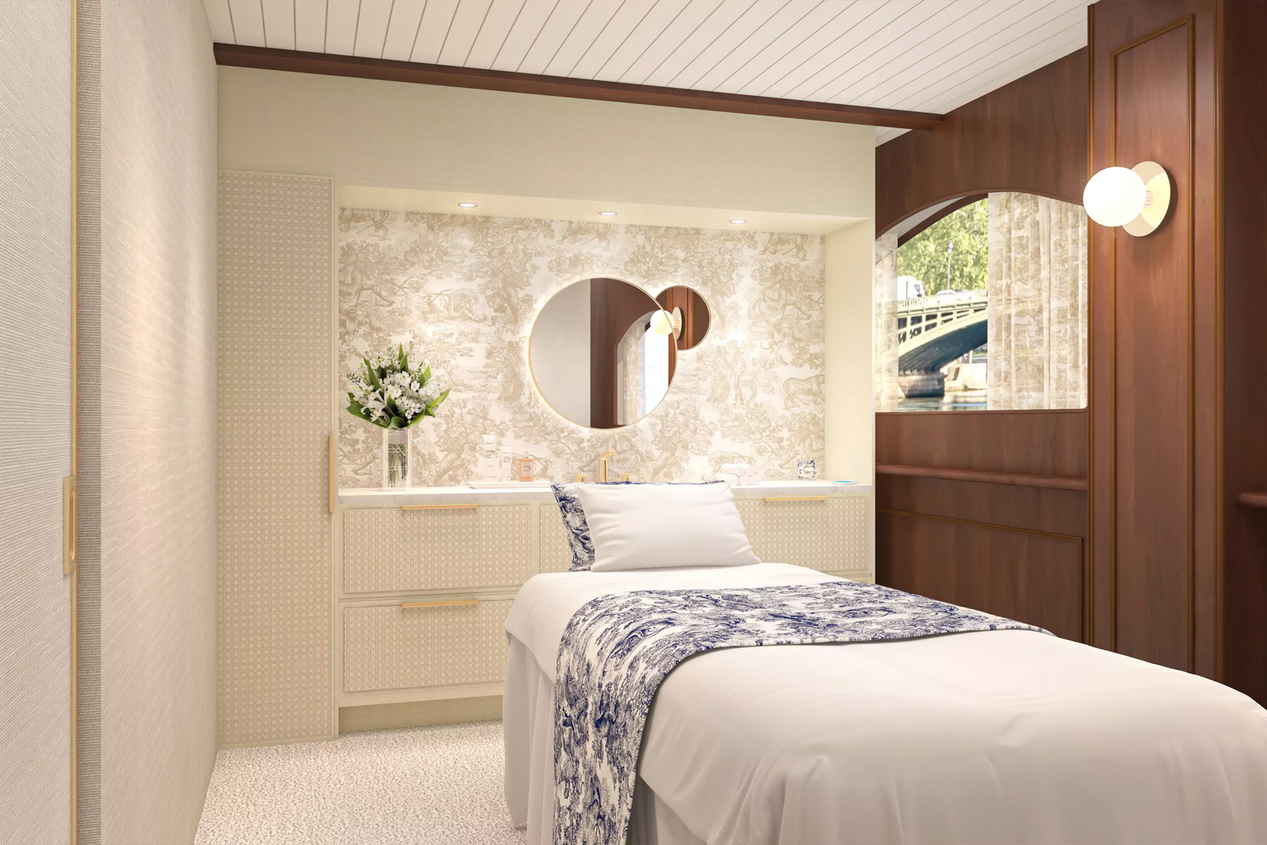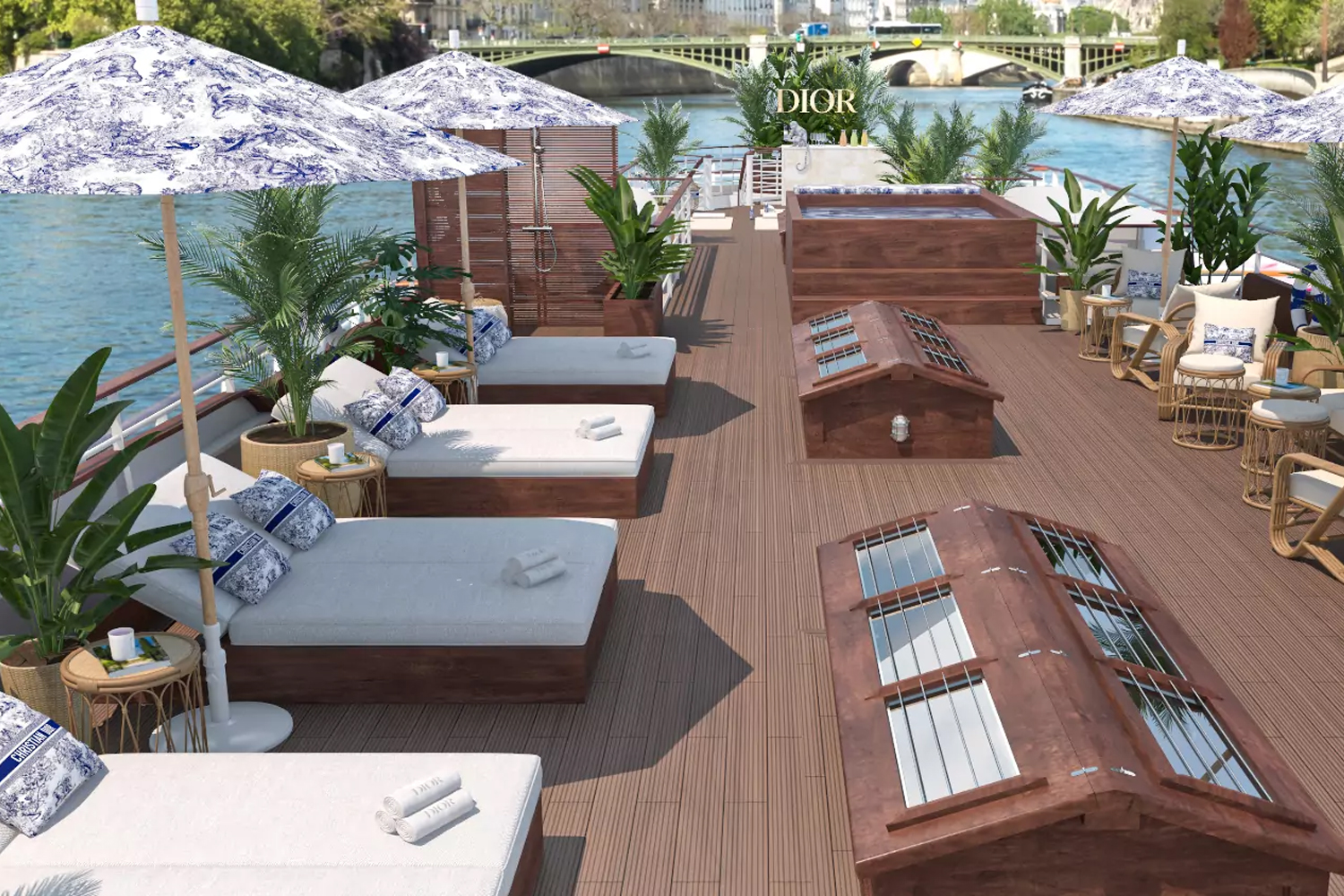 L’elegantissimo ponte superiore della Dior Cruise ospita inoltre una piattaforma sportiva all’aperto, un juice bar e una piscina con sedie a sdraio da cui è possibile vedere i monumenti di Parigi, come la cattedrale di Notre-Dame, il Musée d’Orsay e il Grand Palais.