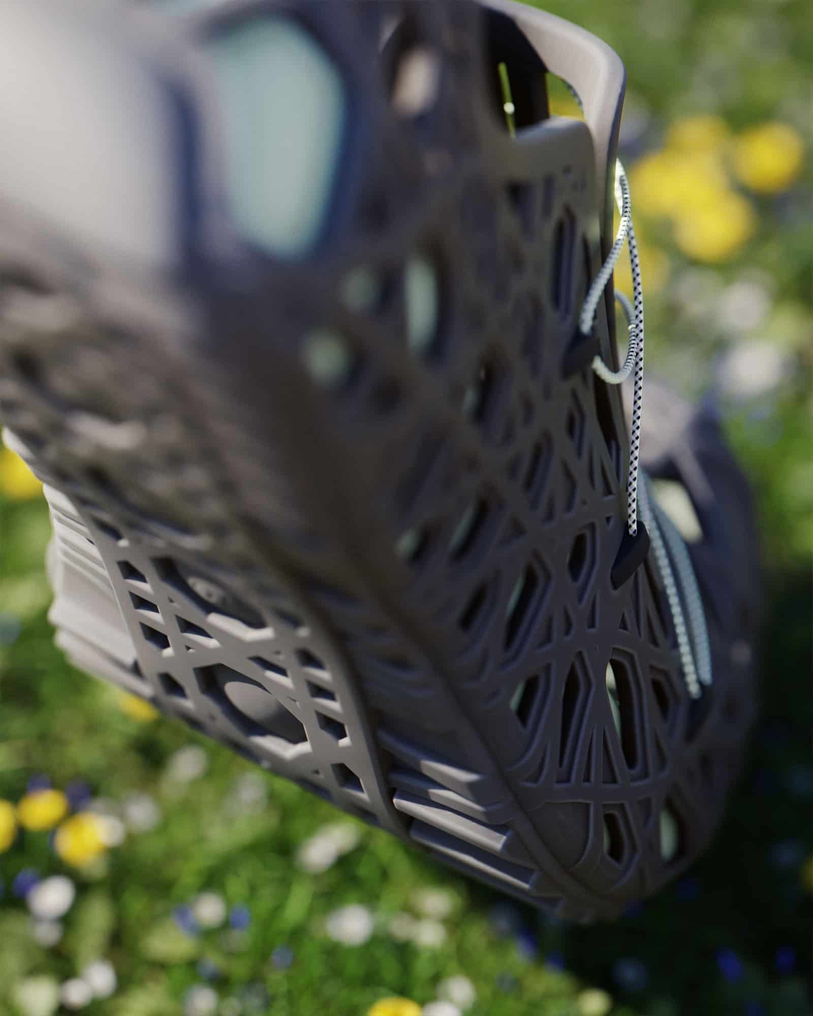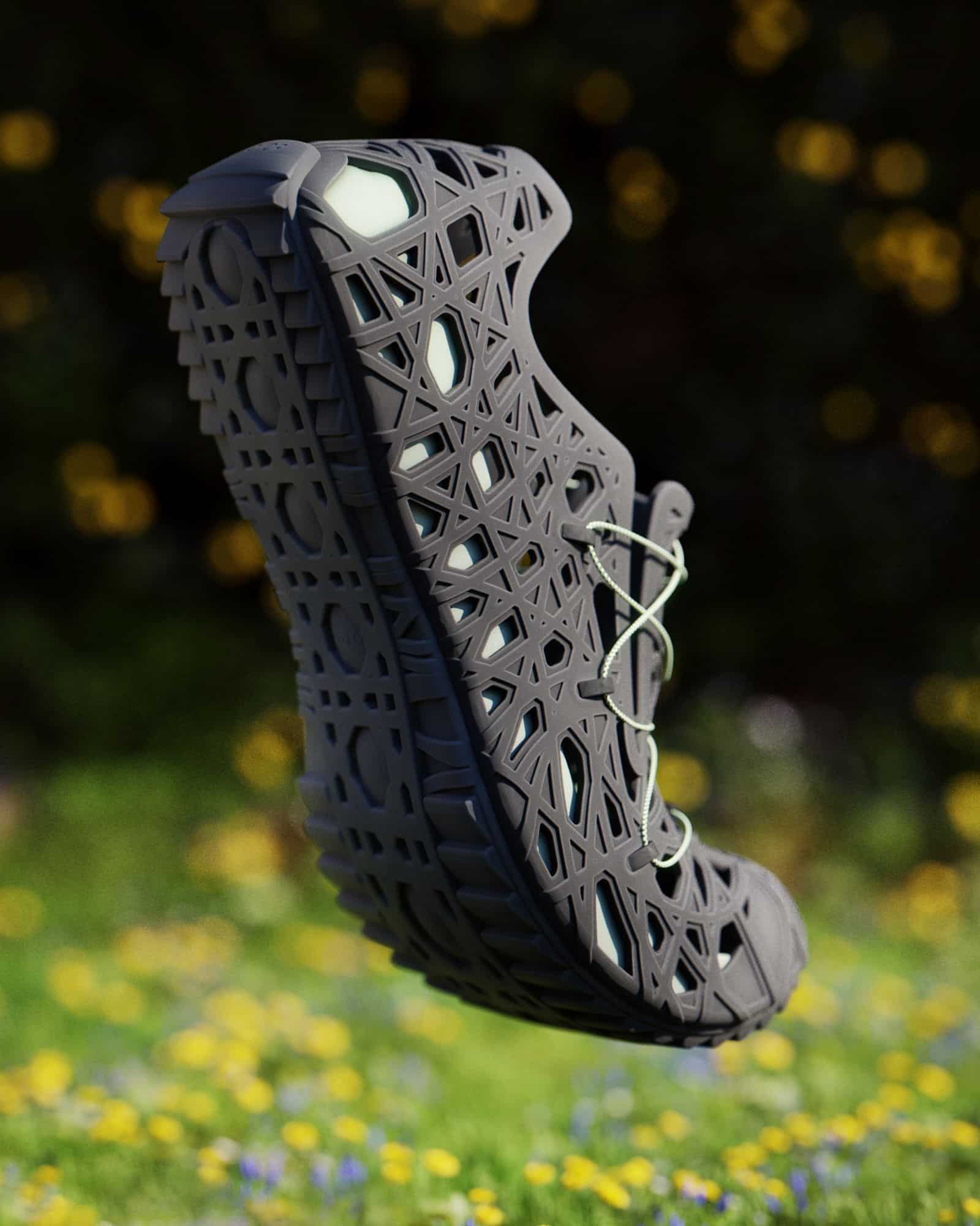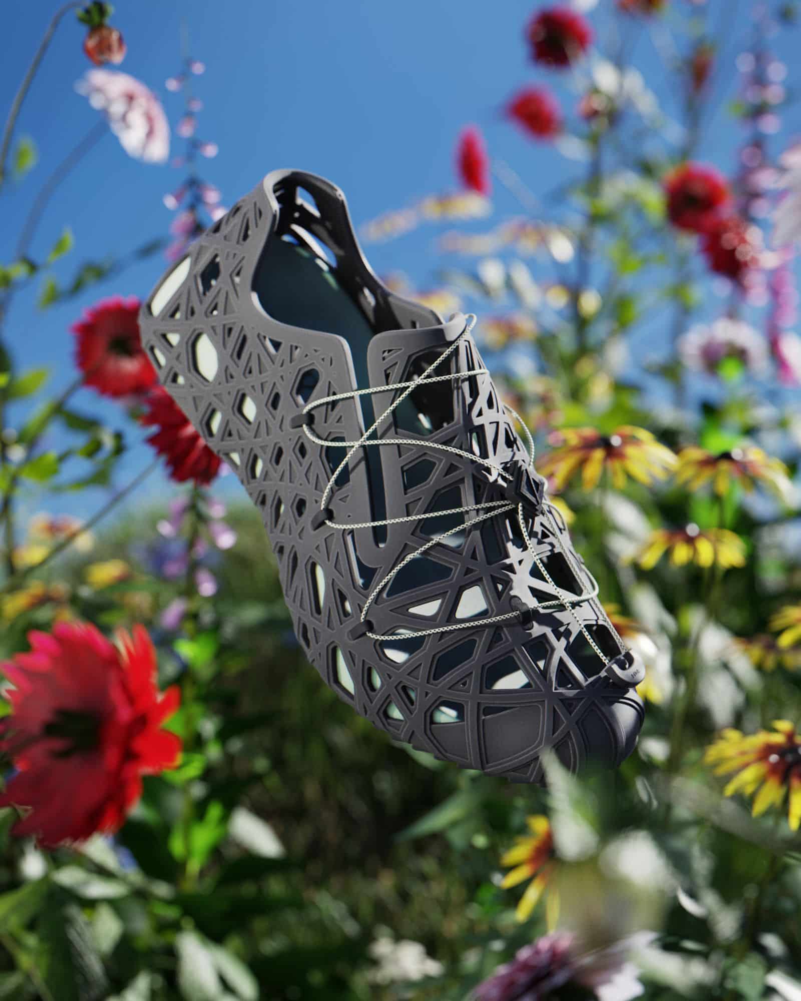 La silhouette è estremamente flessibile e leggera, donando comfort e libertà di falcata, nonostante l’essenzialità dell’upper, il cui tocco gorpcore è dato da una struttura in corda che ne garantisce l’allacciatura, con un lace-lock a riportare il lettering della maison.