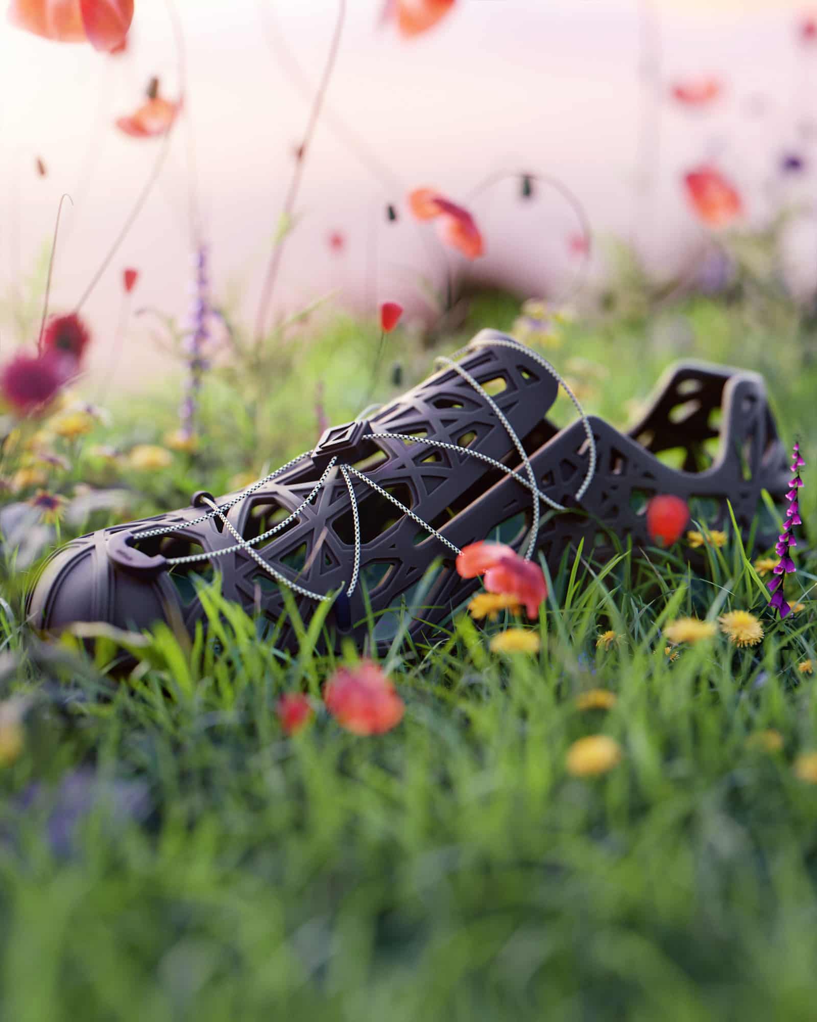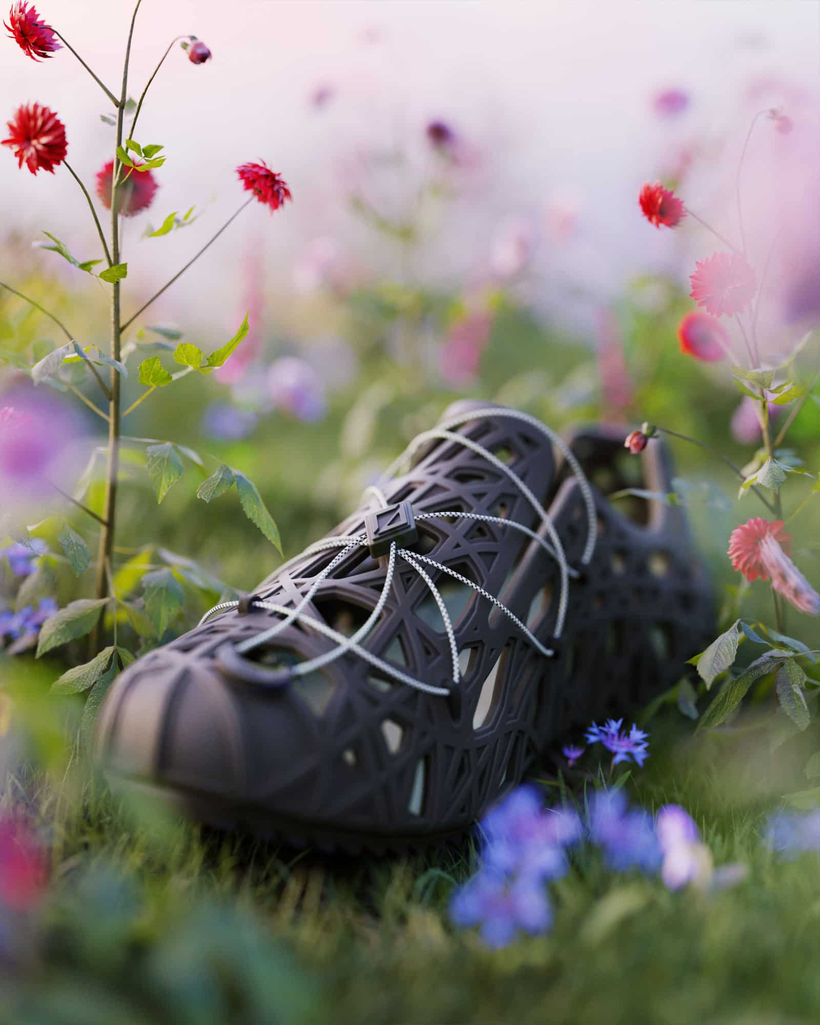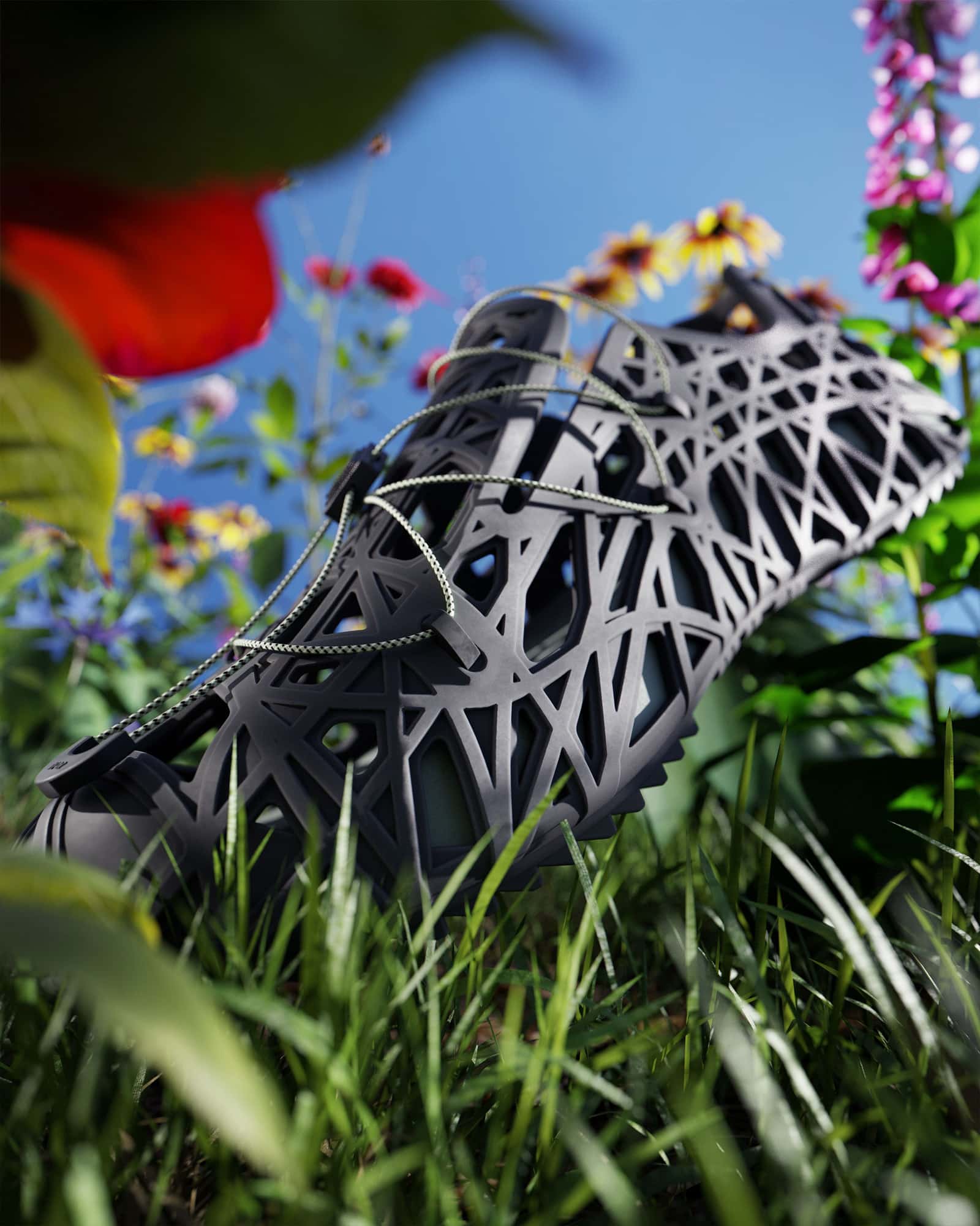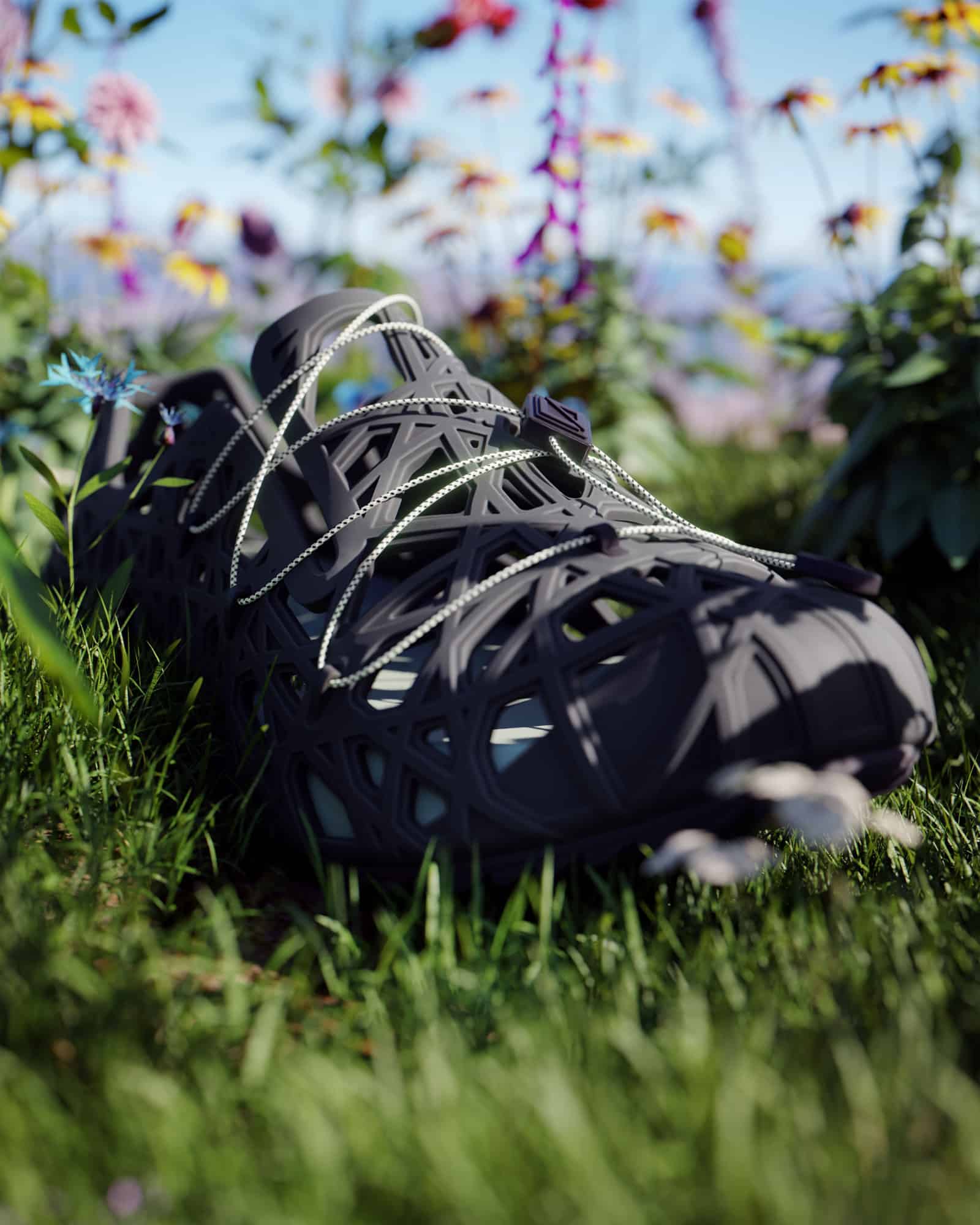 La silhouette è estremamente flessibile e leggera, donando comfort e libertà di falcata, nonostante l’essenzialità dell’upper, il cui tocco gorpcore è dato da una struttura in corda che ne garantisce l’allacciatura, con un lace-lock a riportare il lettering della maison.