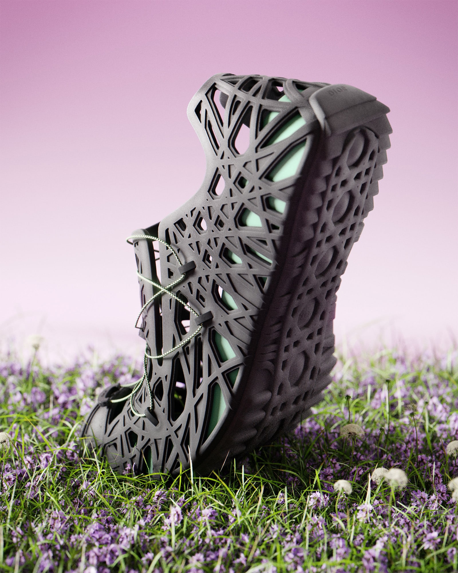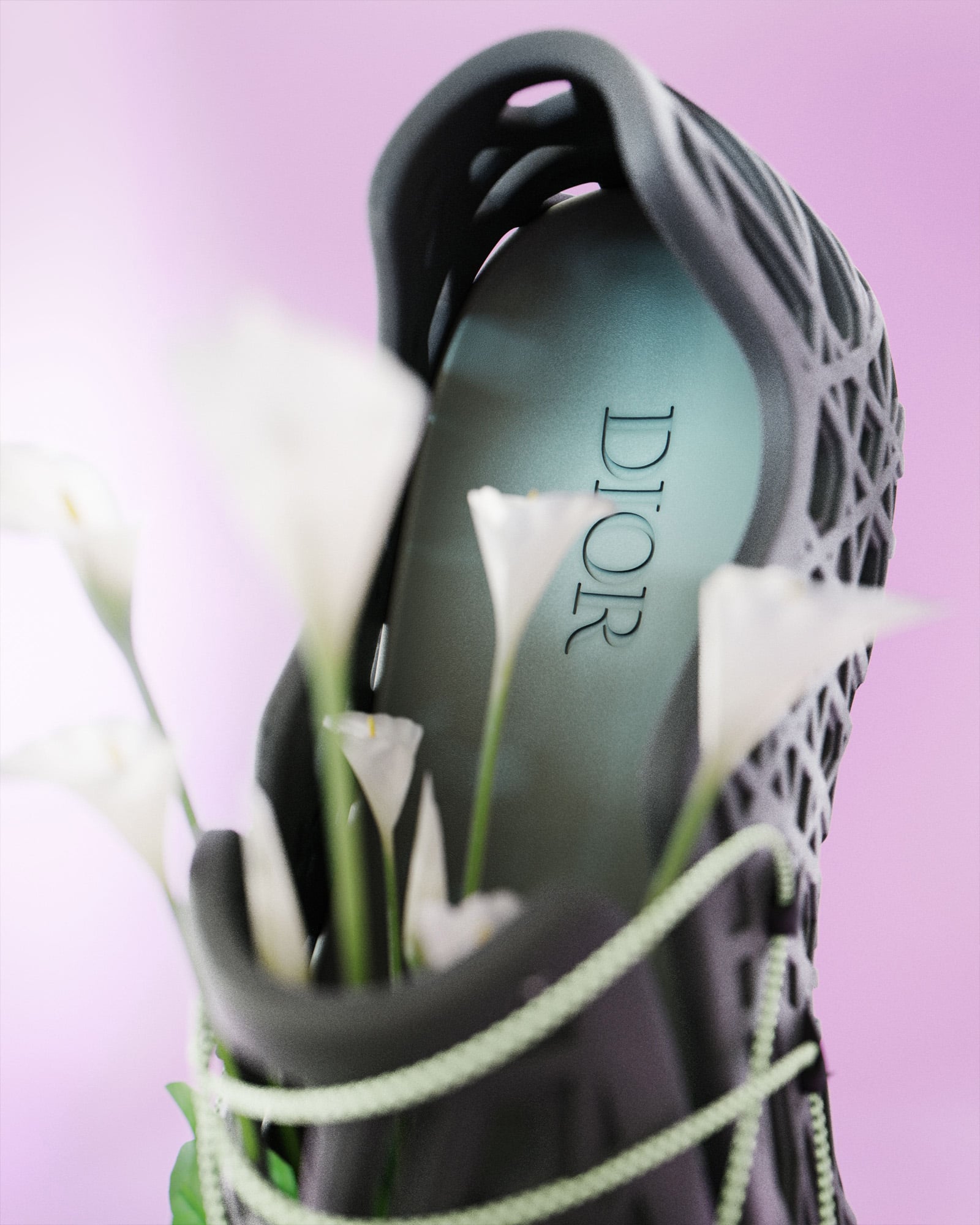 Sguardo al futuro, dunque, ma riconoscenza alle radici della maison fondata da Christian Dior, un’ambivalenza perfettamente incarnata dal design: un richiamo al “Cannage“, delle sedie in vimini nell’atelier Dior, che si fonda ad un esoscheletro dal look audace e d’avanguardia. Questa struttura fa sì che si possa intravedere l’insole, che arriva in 4 diverse nuance a contrasto: verde menta, rosa, bianco o nero.