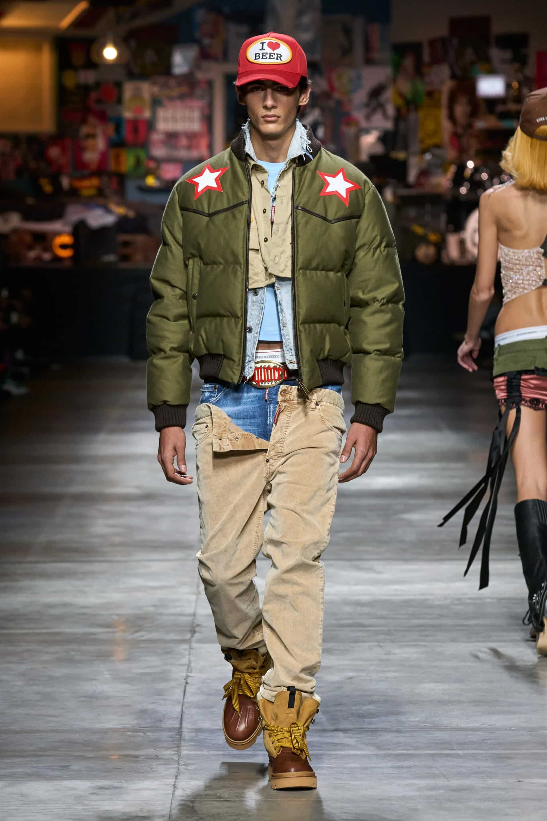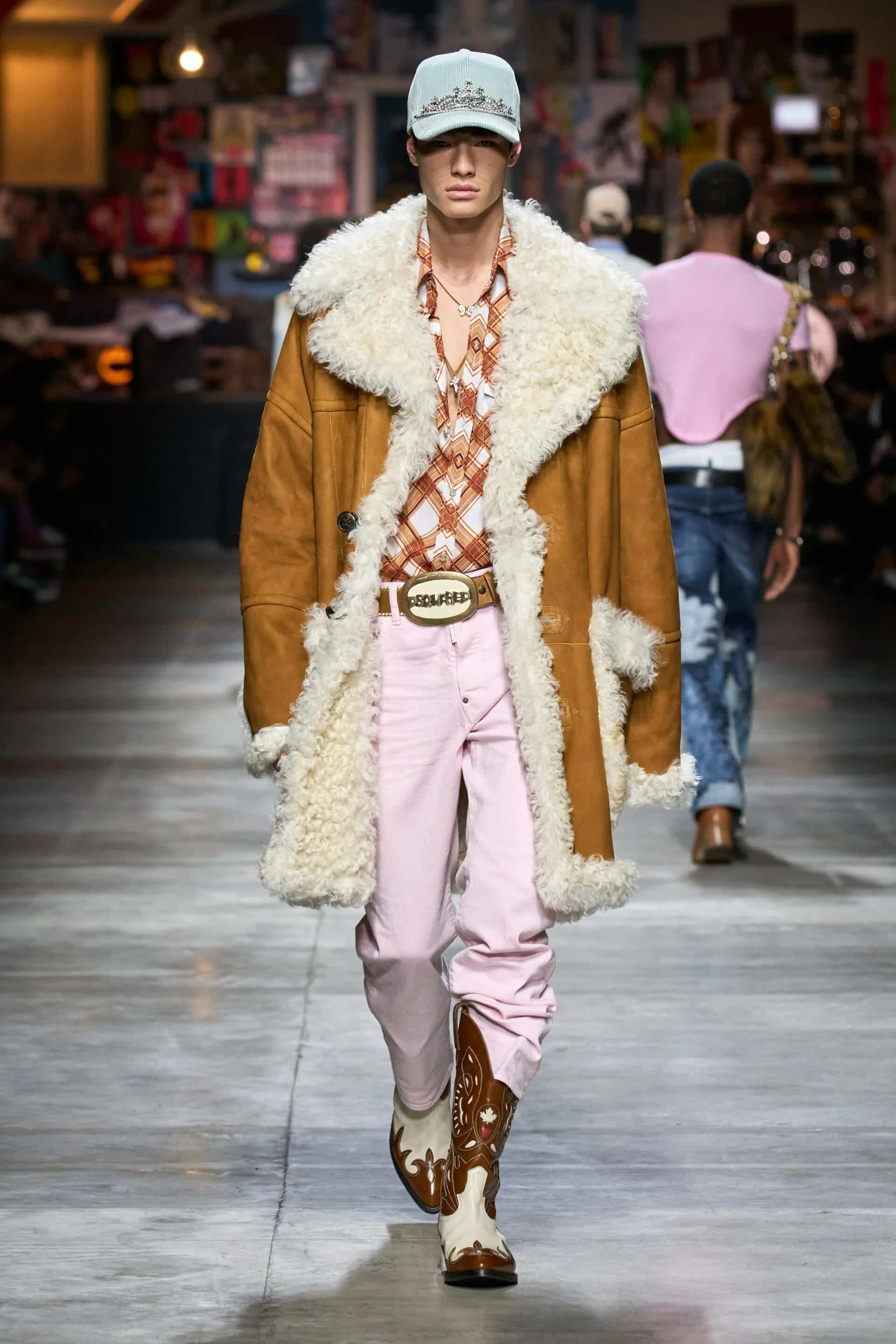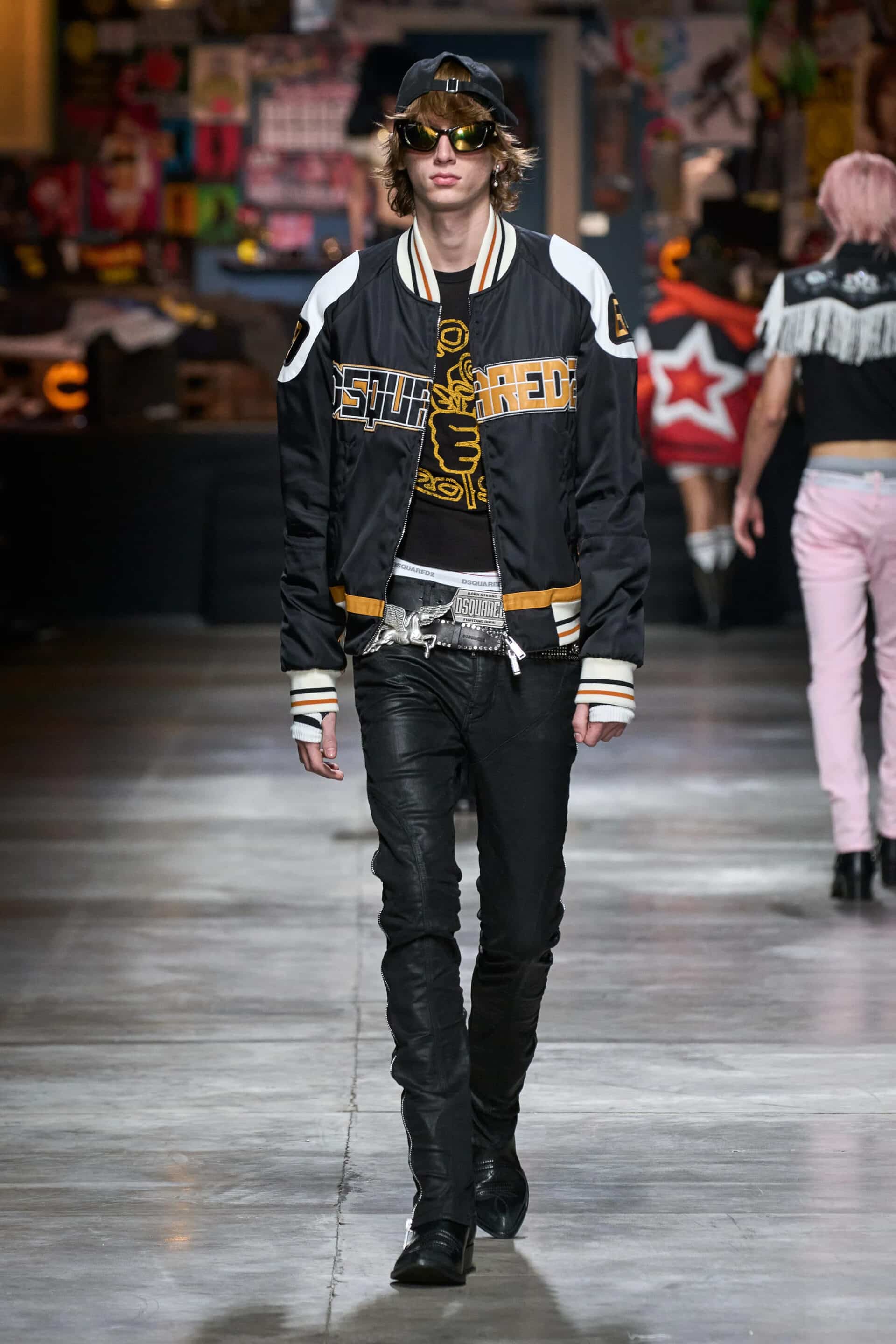 In aggiunta a ciò, le tradizionali varsity jacket vengono inglobate all’interno dell’ottica western di Dsquared2 riportando dettagli come nastri e frange, che appaiono anche su giacche di jeans, camicie button-down a righe e cappotti di pelle.