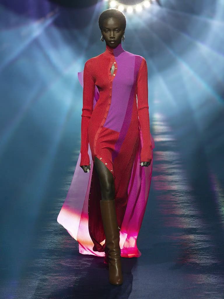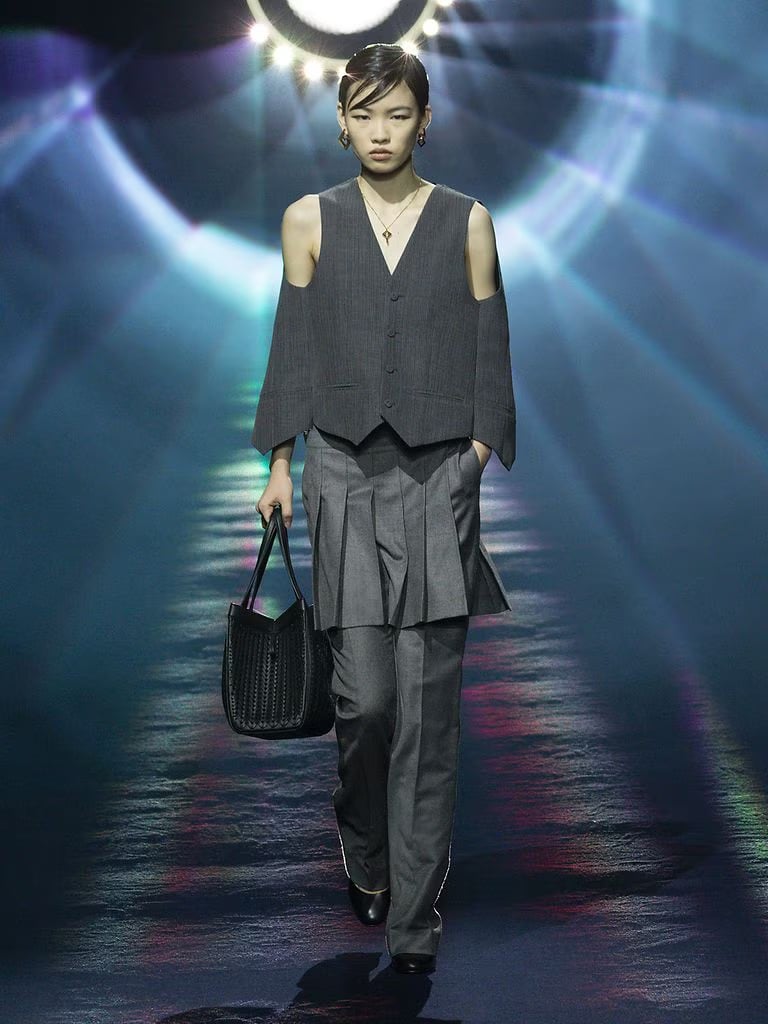 Nasce così una perfetta fusione tra tradizione e avanguardia, che si traduce nella presenza di abiti drappeggiati con forme libere e leggere, affiancati da mantelle in tessuto pregiato, gilet con maniche e addirittura gonne a frange abbinate a pantaloni sottostanti. Il risultato è un capolavoro di complessità in grado di offrire una chiave di lettura completamente inedita in materia di operato stilistico, senza sacrificare il grande senso di raffinatezza che contraddistingue l’approccio Fendi sin dalla sua fondazione.