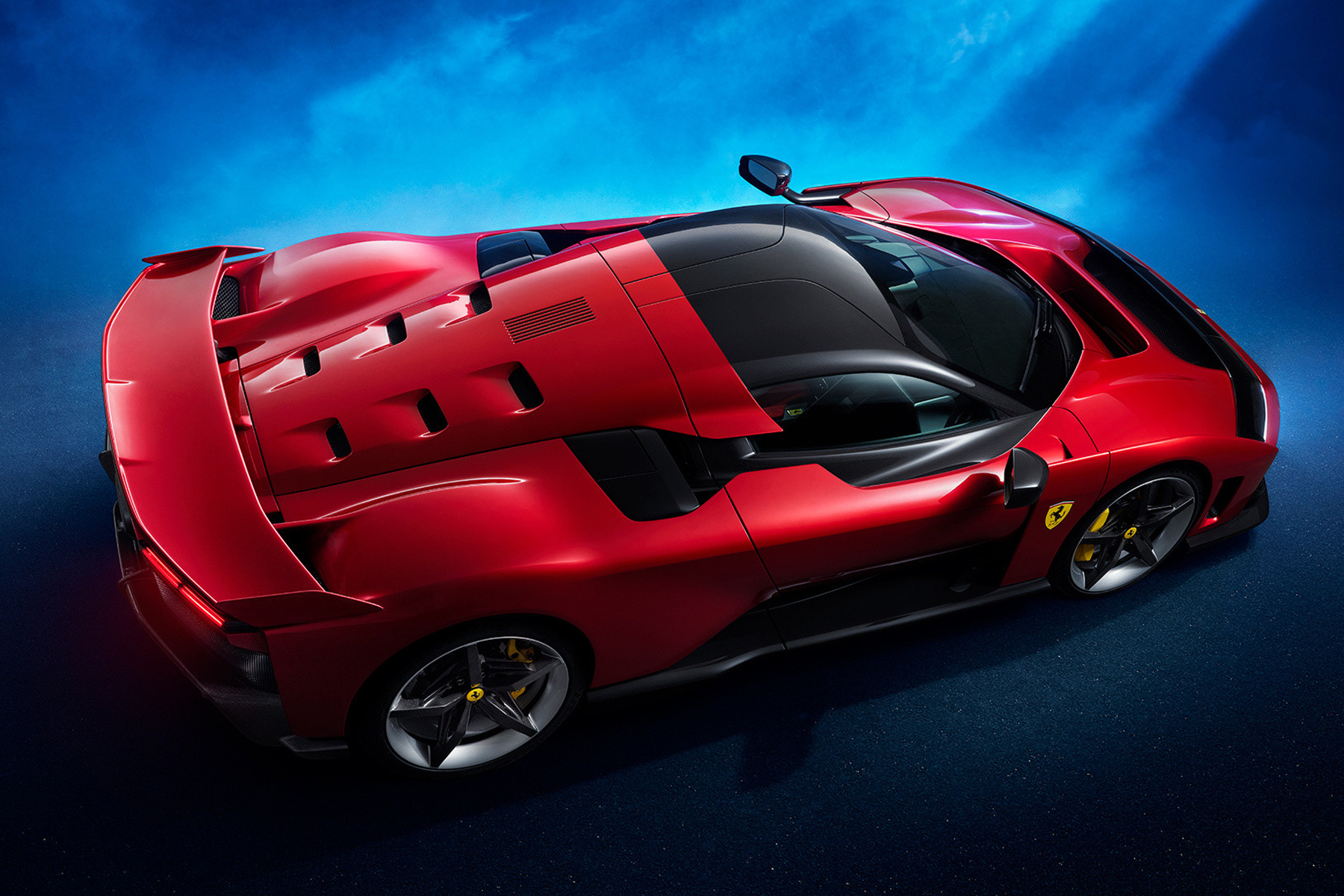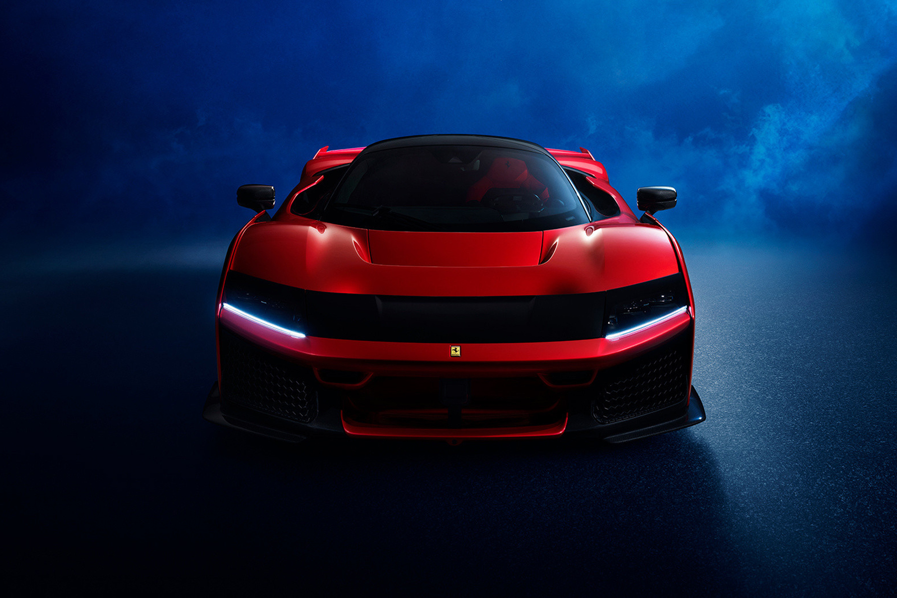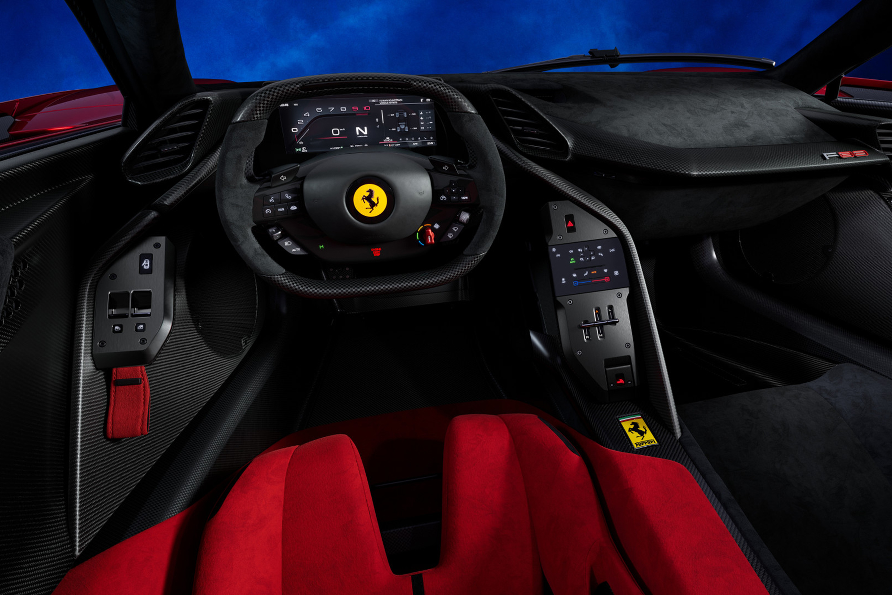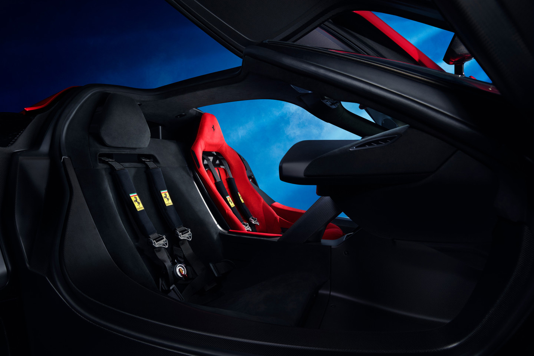 Inizialmente pensata come una monoposto, la Ferrari F80 è diventata in seguito una biposto con sedili sfalsati – il passeggero si trova in secondo piano, nascosto praticamente in una parte rivestita della scocca in carbonio – rendendola così accattivante e unica nel suo design anche per via della combinazione cromatica scelta per gli interni. Questo meccanismo permette inoltre di controllare in maniera particolarmente efficace i flussi aerodinamici. L’auto è infine dotata di portiere con apertura a farfalla.