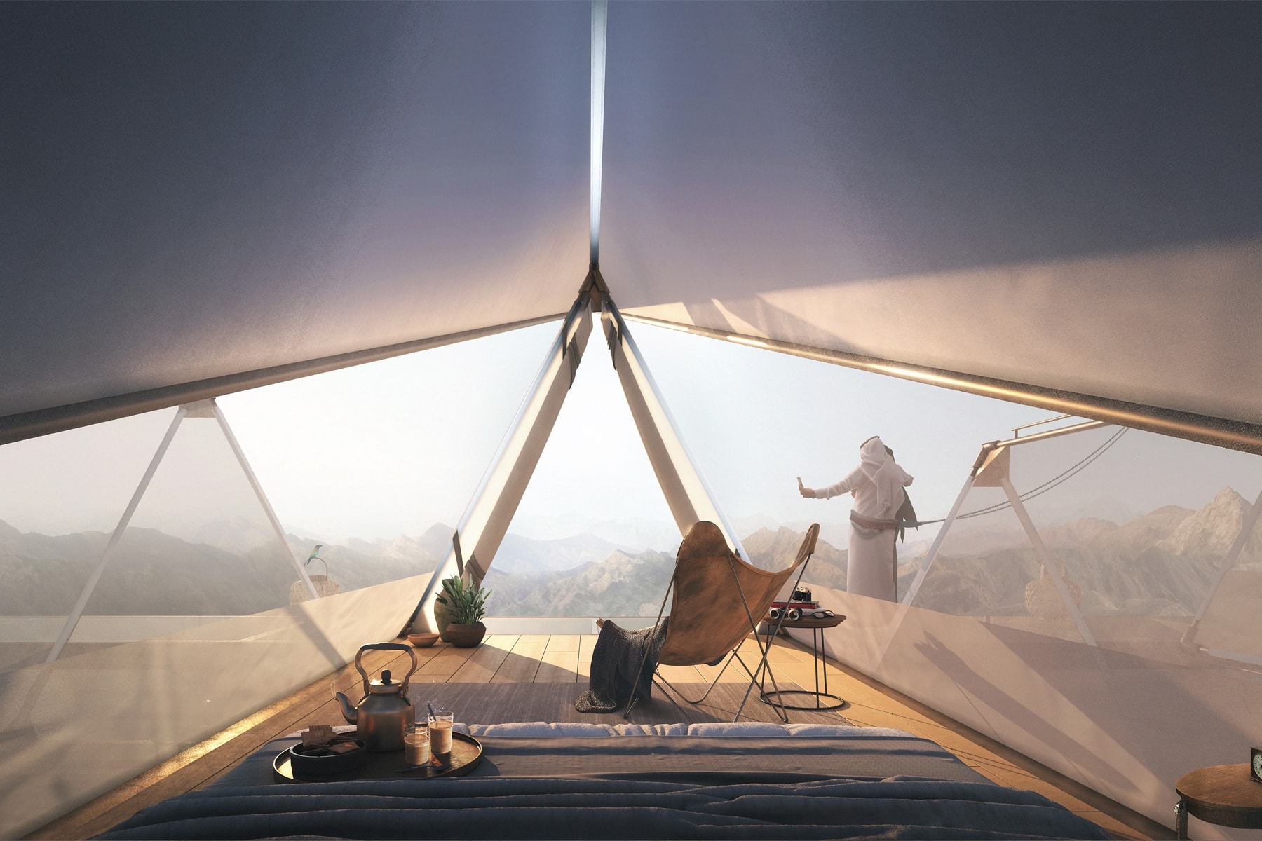 All’interno dell’eccezionale resort, che sfida i confini dell’immaginazione e consente di dormire sospesi su una valle a qualche centinaio di metri di altezza, ci saranno 10 tende posizionate su una piattaforma, raggiungibile tramite una di esse che fungerà da ascensore. Ciascuna tenda sarà in grado di ospitare fino a due persone e la sospensione potrà essere “regolata” grazie a dei comandi, in modo da tutelare la privacy di ciascun ospite, essendo progettate per evitare la sovrapposizione o la vicinanza con le altre in modo da tutelare la privacy di ciascun ospite. Per un progetto del genere la sicurezza è la priorità e quindi il personale della struttura comprende anche un team di ingegneri sempre presente sul posto in modo da risolvere qualsiasi inconveniente. “Le tende”, afferma il capo architetto del progetto, “sono dotate di doppi cavi sospesi come misura di sicurezza. Nel caso in cui una tenda si blocchi, i cavi permettono alla capsula di oscillare verso il lato della montagna, dove gli ospiti possono essere recuperati in sicurezza dalla squadra di alpinisti e portati in salvo”.