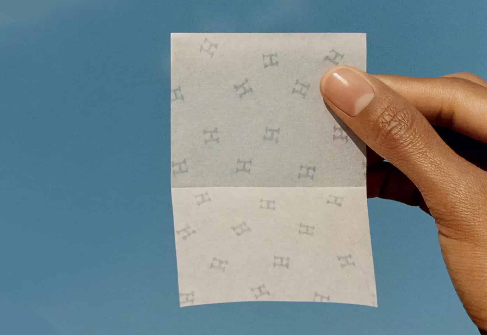 Si tratta nello specifico di una confezione contenente 100 salviette impreziosite da un monogram impresso in filigrana e composto da piccole H: esse consentono di eseguire ritocchi sul colorito in qualsiasi momento della giornata, permettendo di tamponare la pelle senza scomporre il fondotinta.