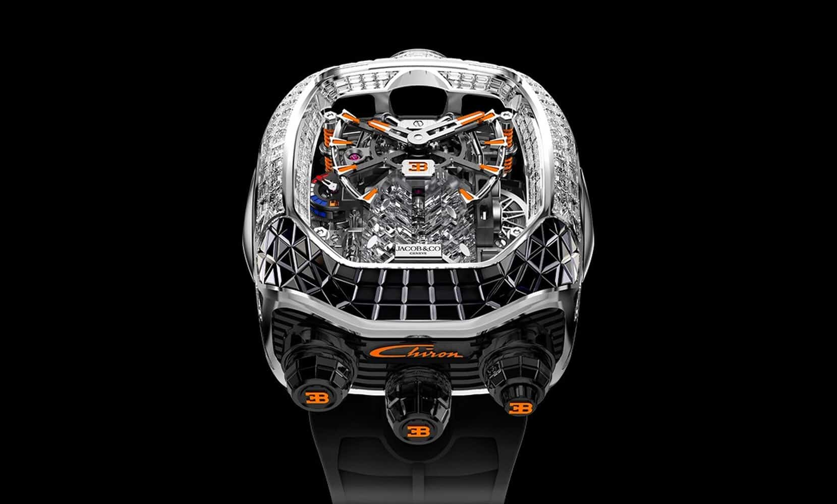 Il rinomato marchio di gioielleria Jacob & Co. continua la sua partnership con Bugatti rilasciando un altro orologio ispirato al modello di punta Chiron, automobile supersportiva prodotta dalla casa automobilistica francese dal 2016, nonchè una coupè con motore centrale, due posti e alte prestazioni concepita per sostituire la Bugatti Veyron. A differenza delle prime iterazioni in carbonio, questa nuova cassa in oro bianco 18 carati viene impreziosita dal protagonismo di 190 diamanti bianchi baguette, 109 zaffiri neri baguette e 42 zaffiri arancioni baguette, incastonati in maniera esemplare per una resa finale eccellente, come da tradizione Jacob & Co.L'orologio è dotato di un movimento JCAM3 a carica manuale che presenta un'animazione a 16 pistoni e due “turbocompressori” (rispetto ai quattro dell'attuale motore Bugatti Chiron) che girano quando attivati. Il movimento centrale ospita anche un tourbillon inclinato di 30 gradi, una riserva di carica di 60 ore, un indicatore della riserva di carica e un indicatore del reale assorbimento degli urti delle sospensioni.