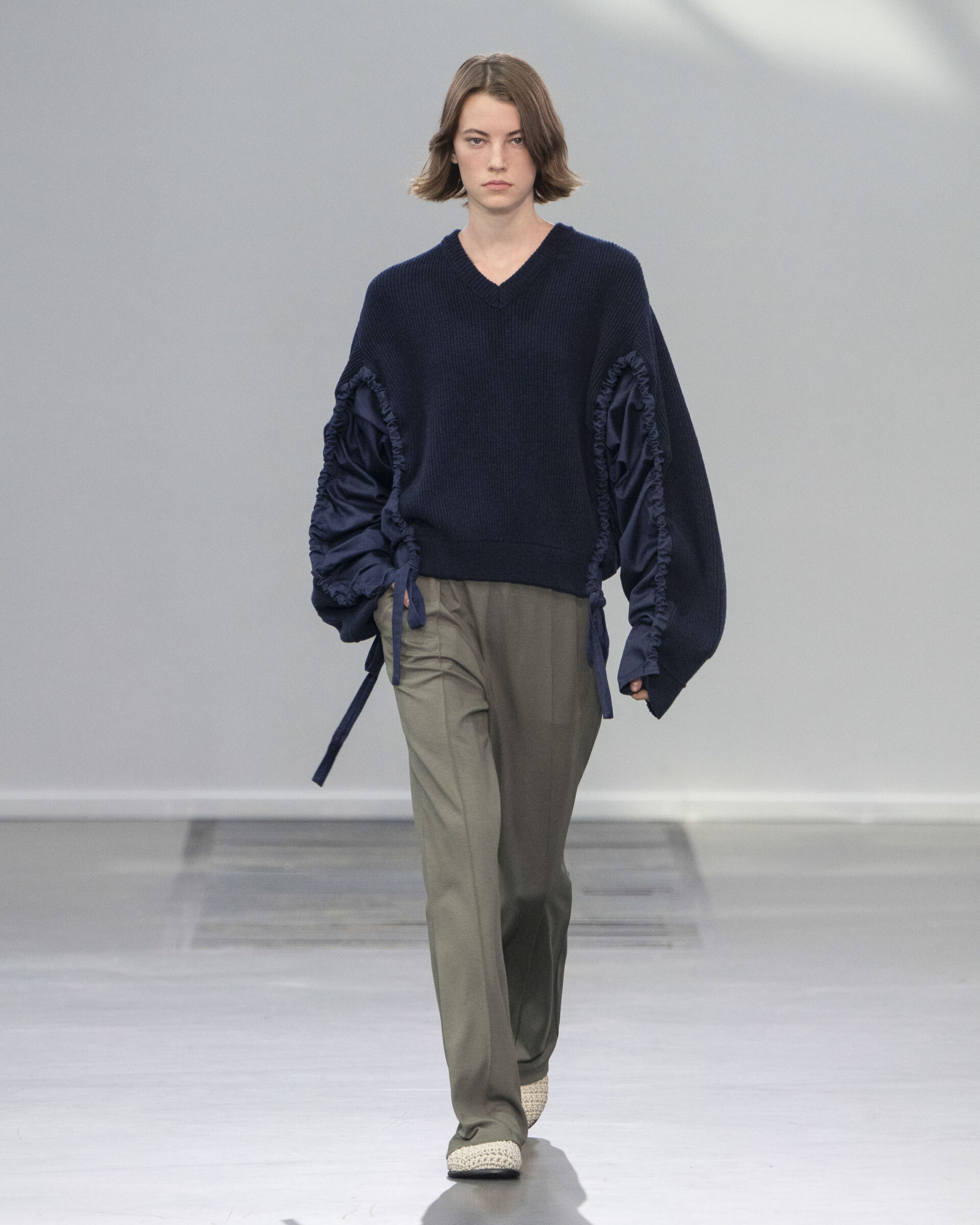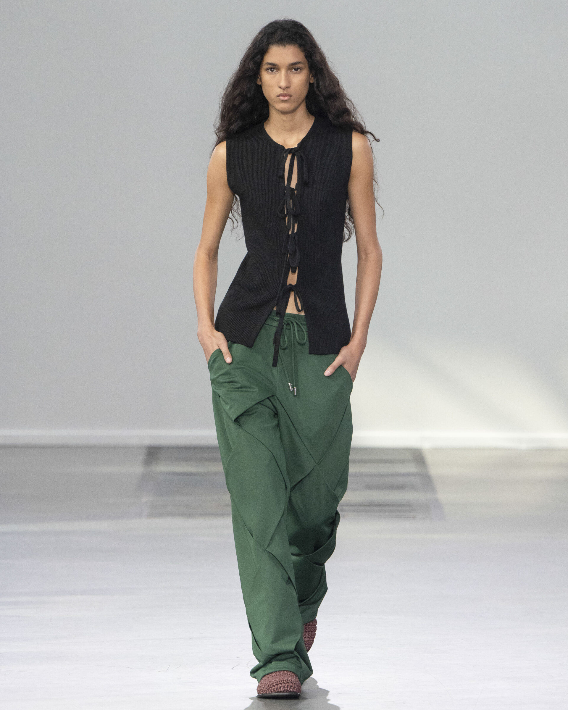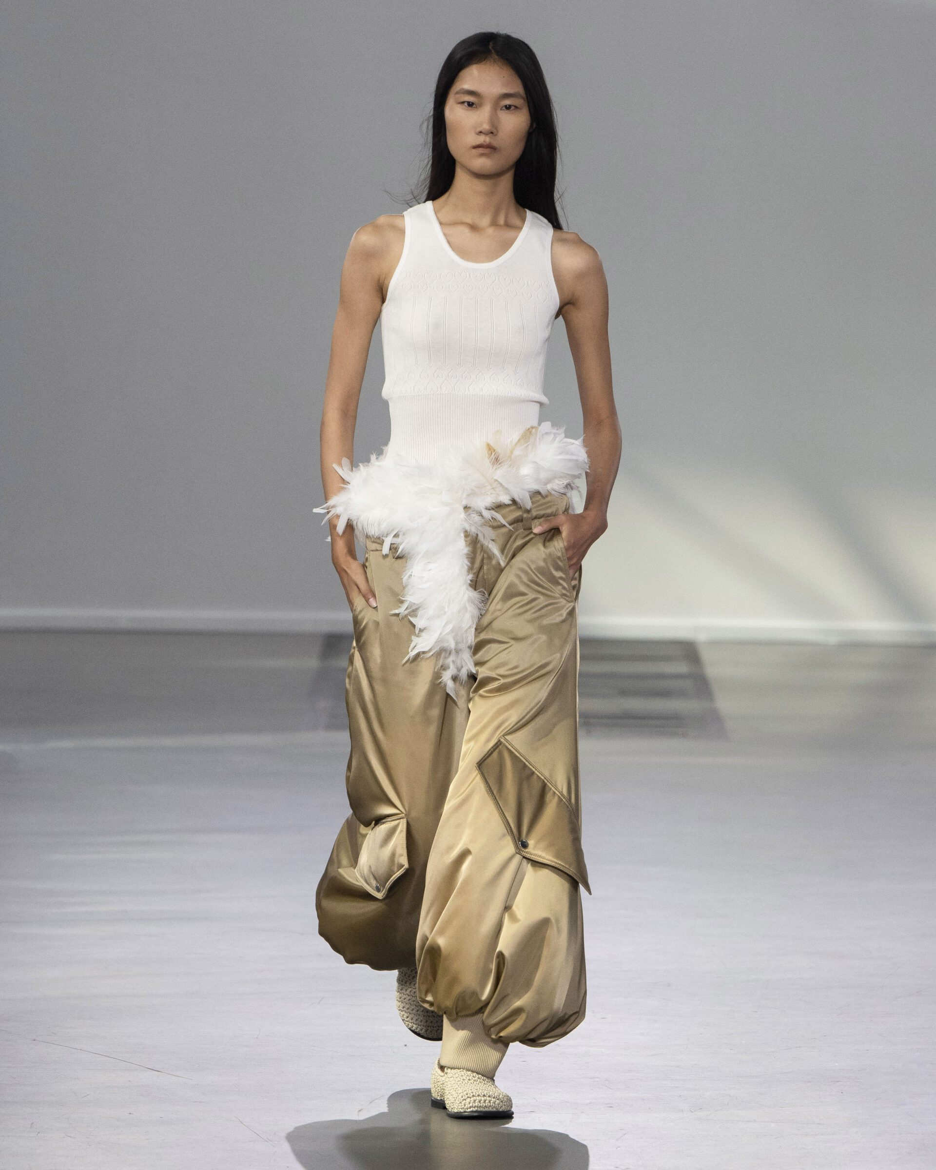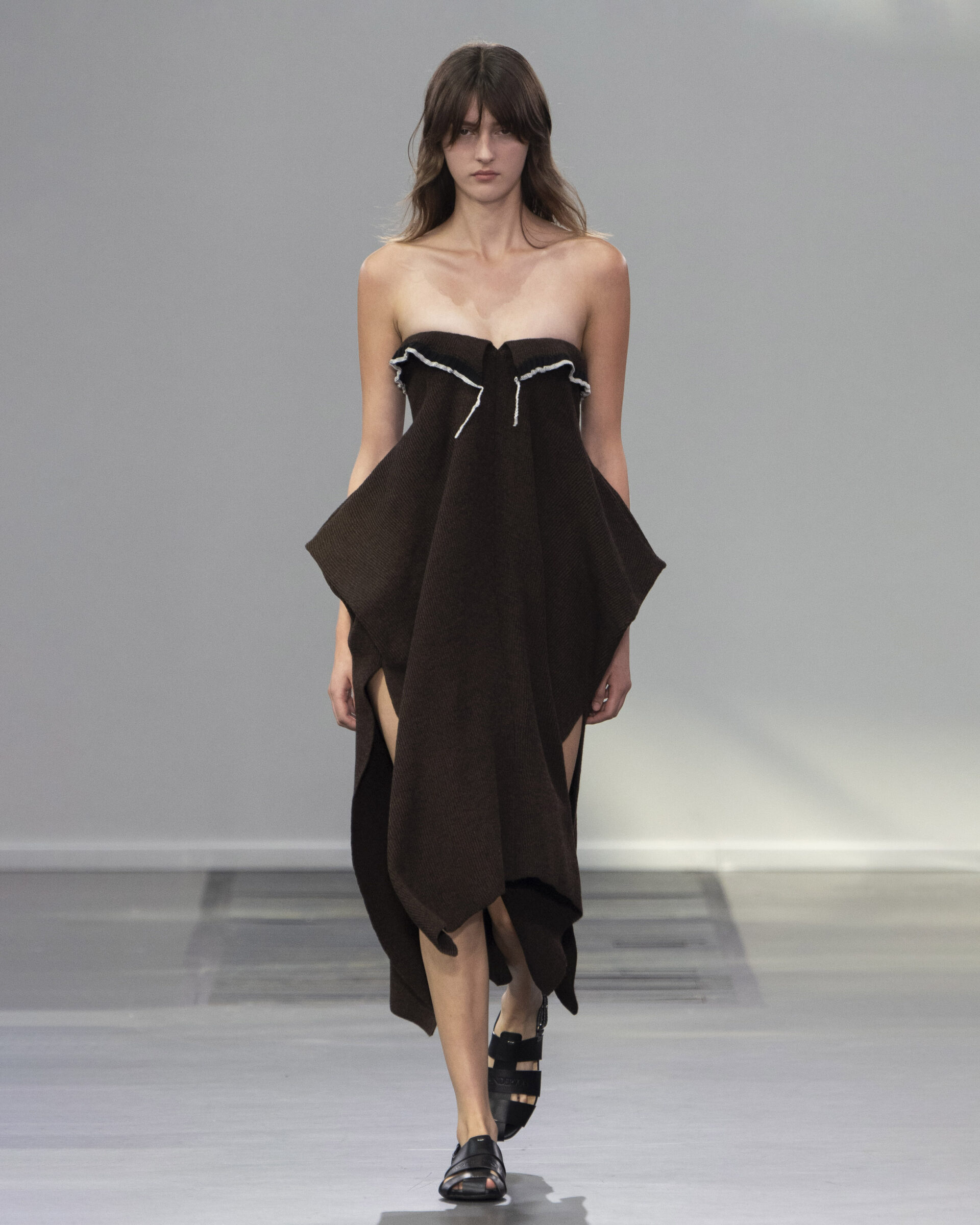 Tutti i capi portati in scena danzano e giocano, su sé stessi, si intrecciano, si imbottiscono, si riavvolgono e cadono in drappeggi morbidi e stravolti nelle forme, ma fedeli nell’essenza della propria funzionalità. La collezione SS24 quindi si pone in continuità con quanto già presentato, sulla scia dello sperimentalismo già osservato con la presentazione della FW23, dove i cartamodelli hanno assunto dimensioni favolistiche, fortemente strutturate, tanto da sembrare finti.