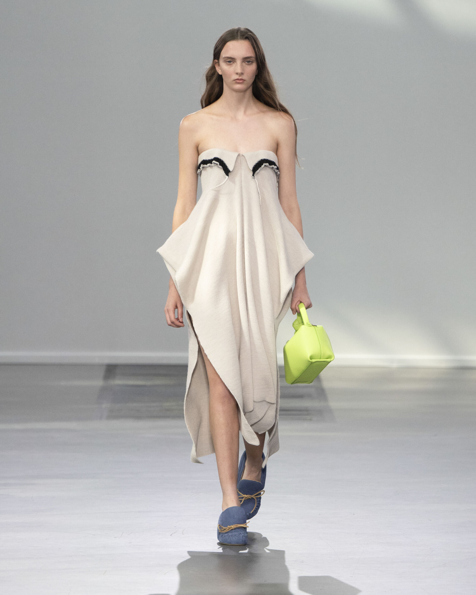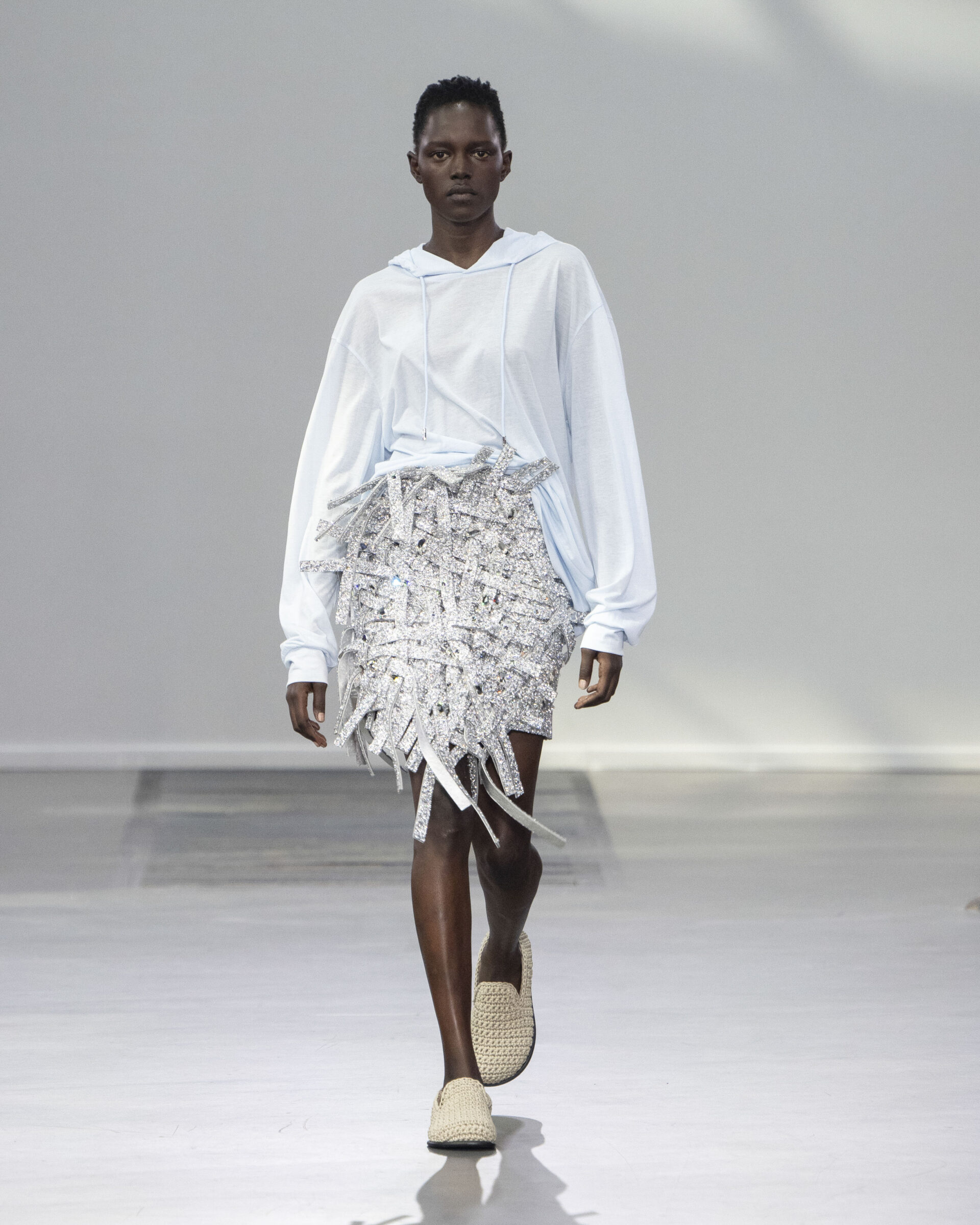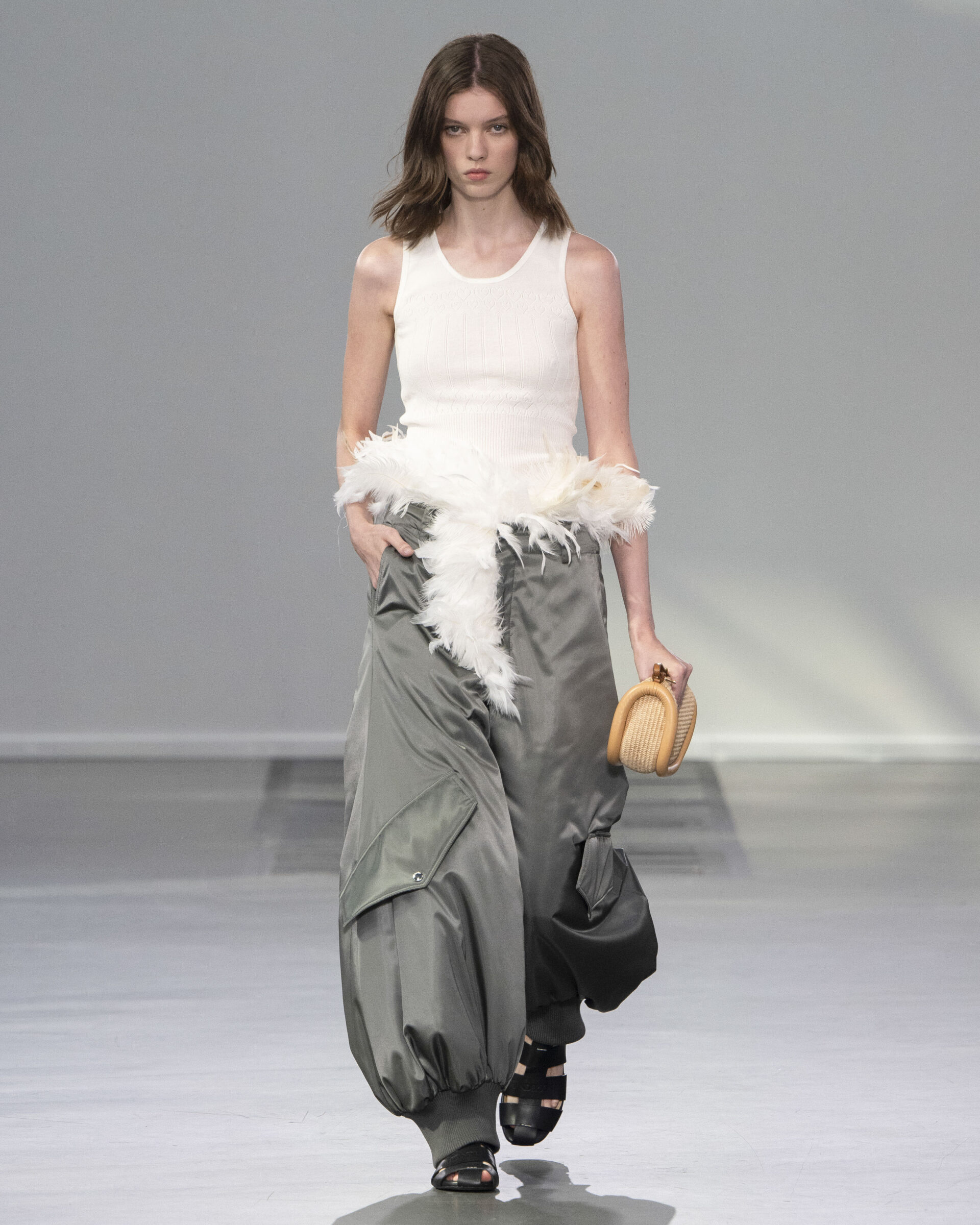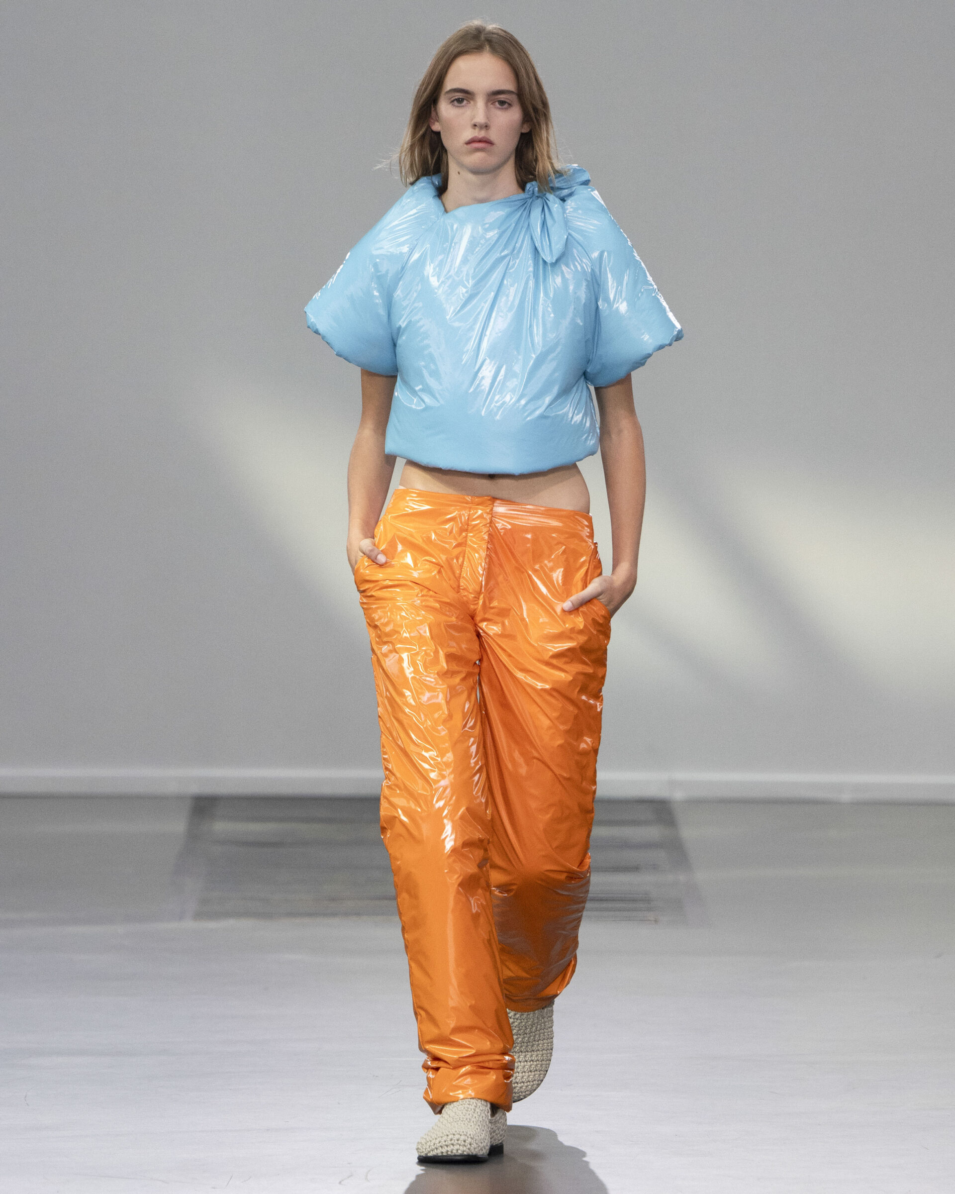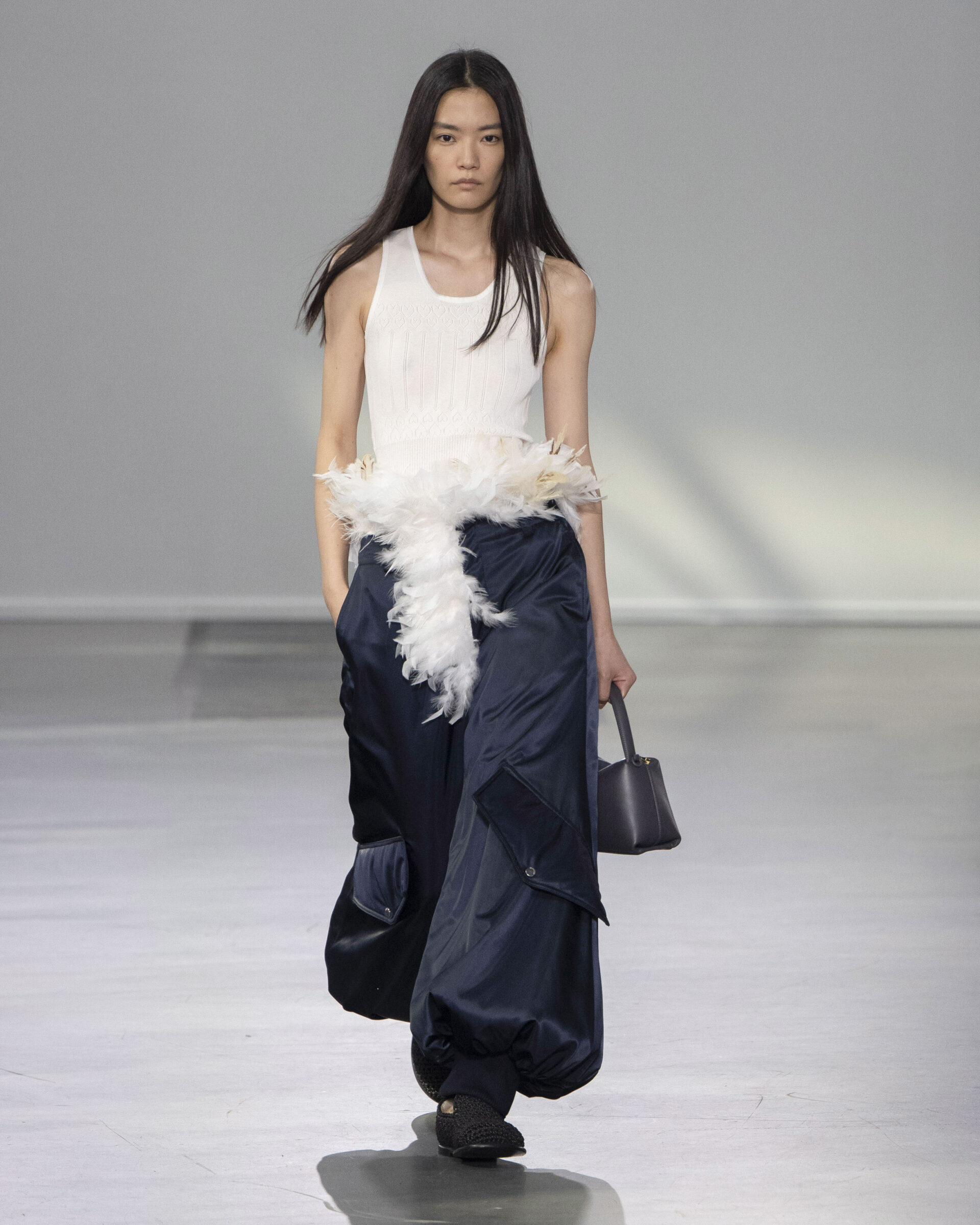 Tutti i capi portati in scena danzano e giocano, su sé stessi, si intrecciano, si imbottiscono, si riavvolgono e cadono in drappeggi morbidi e stravolti nelle forme, ma fedeli nell’essenza della propria funzionalità. La collezione SS24 quindi si pone in continuità con quanto già presentato, sulla scia dello sperimentalismo già osservato con la presentazione della FW23, dove i cartamodelli hanno assunto dimensioni favolistiche, fortemente strutturate, tanto da sembrare finti.