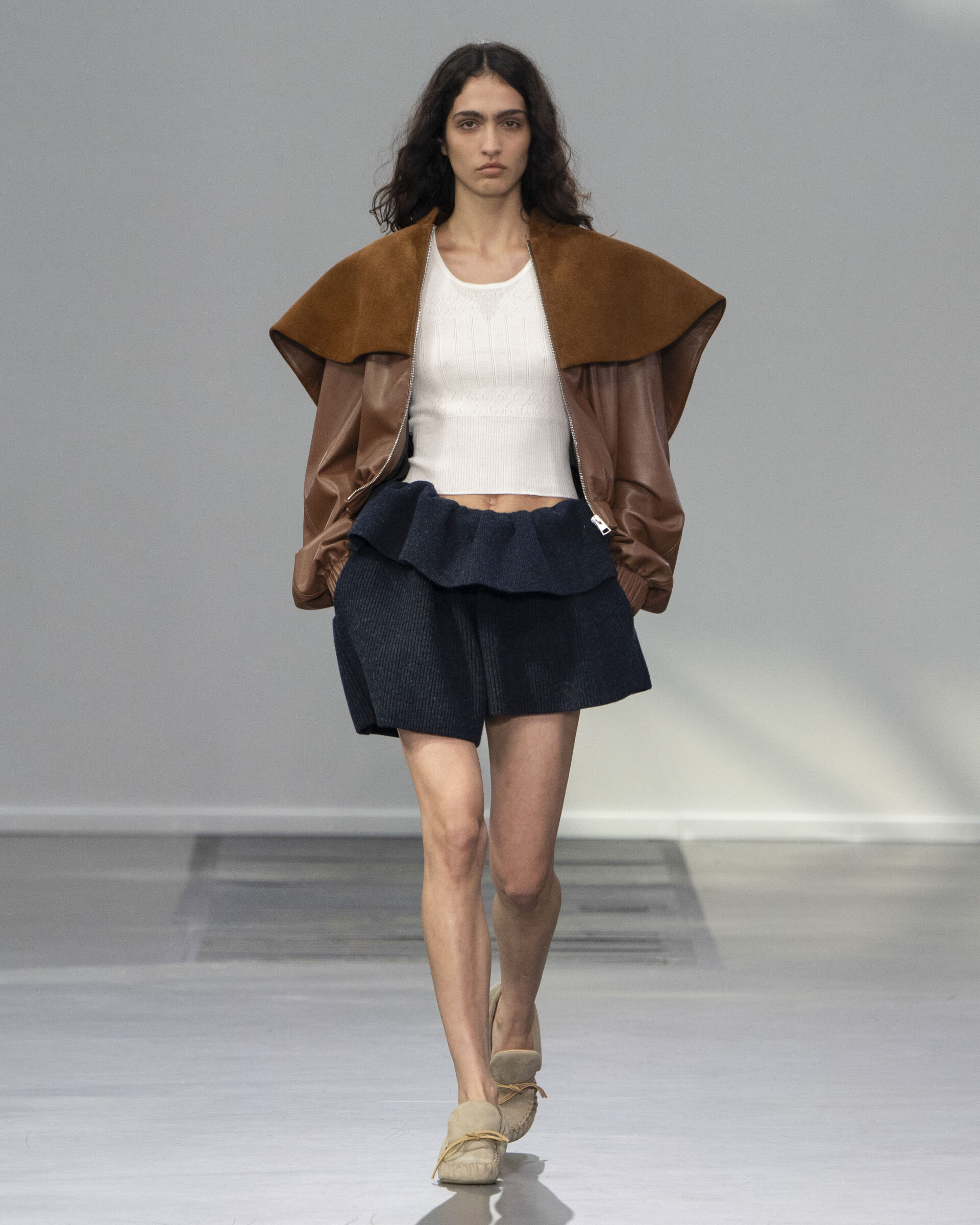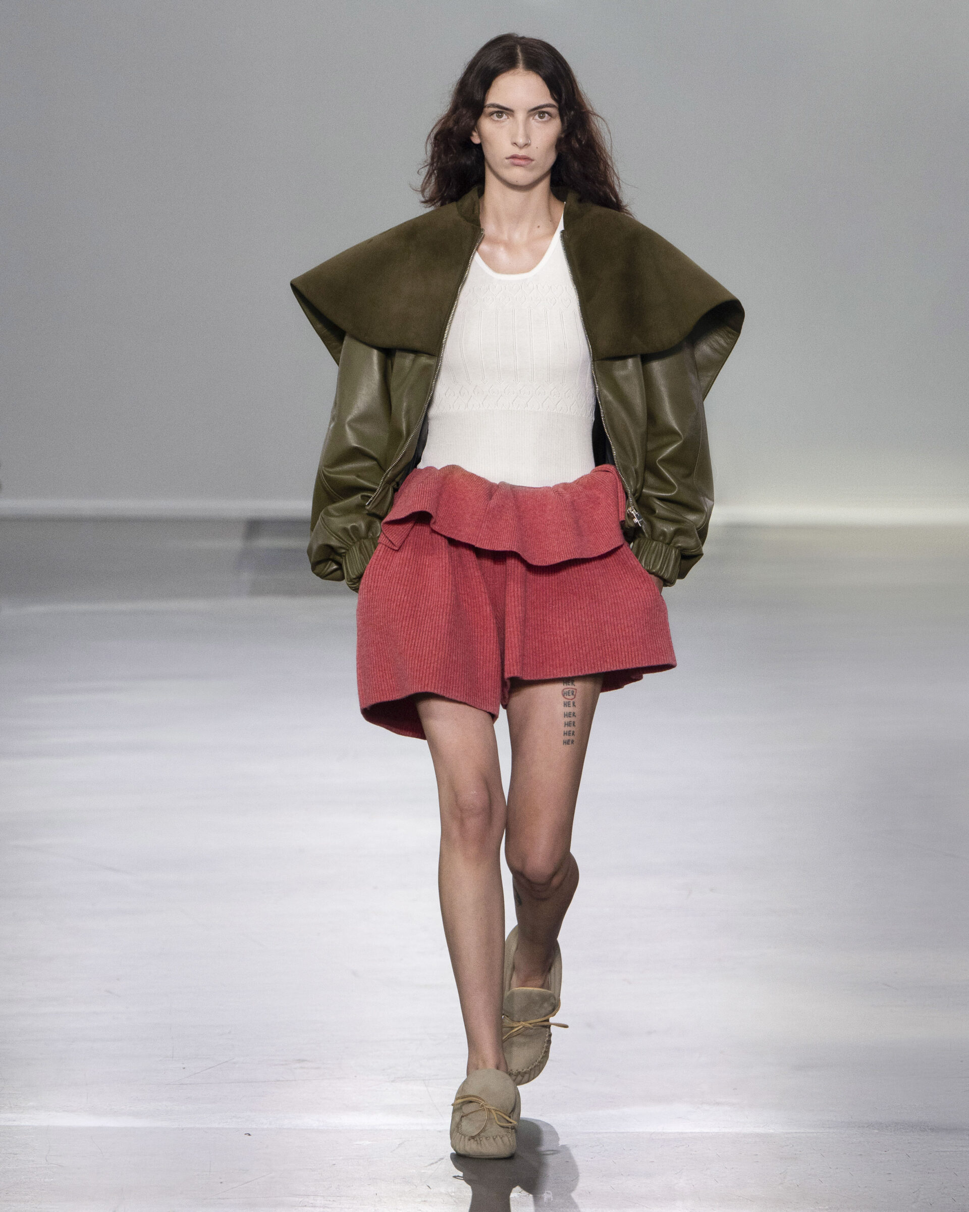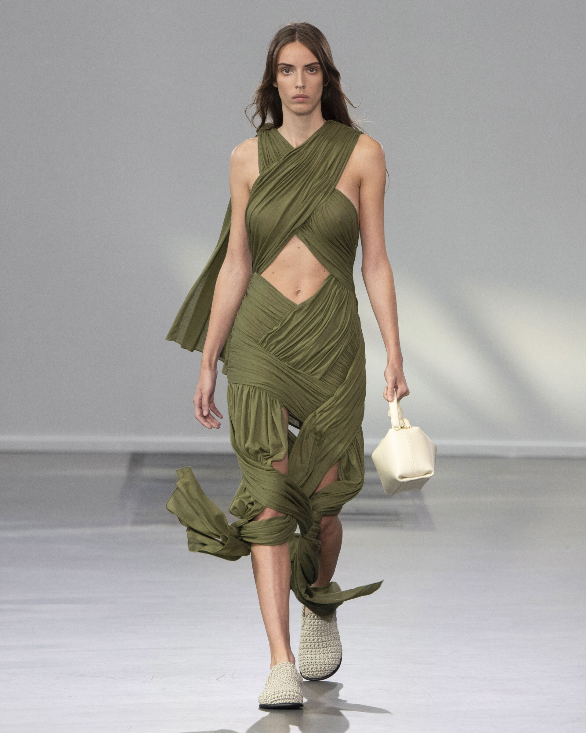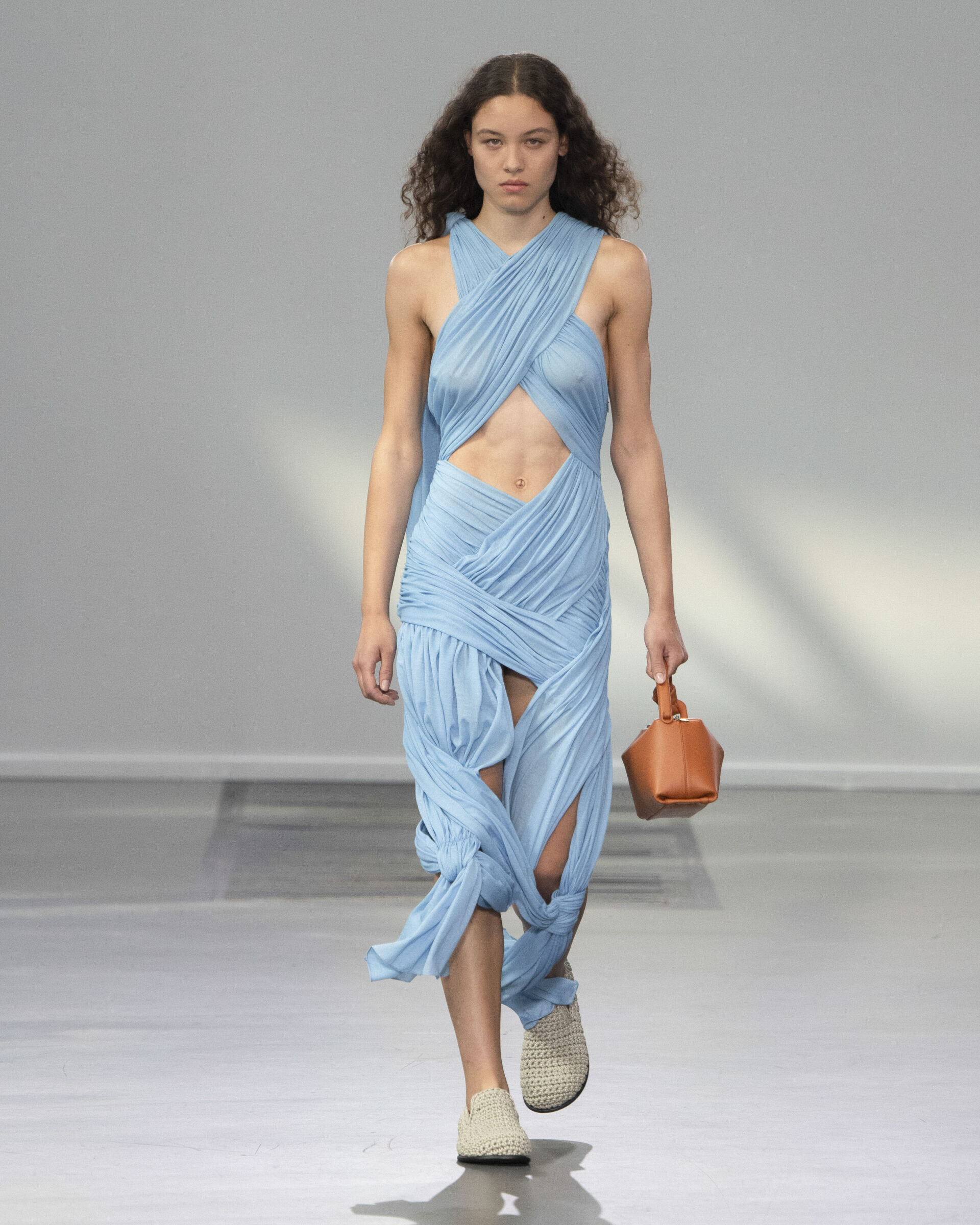 Tutti i capi portati in scena danzano e giocano, su sé stessi, si intrecciano, si imbottiscono, si riavvolgono e cadono in drappeggi morbidi e stravolti nelle forme, ma fedeli nell’essenza della propria funzionalità. La collezione SS24 quindi si pone in continuità con quanto già presentato, sulla scia dello sperimentalismo già osservato con la presentazione della FW23, dove i cartamodelli hanno assunto dimensioni favolistiche, fortemente strutturate, tanto da sembrare finti.