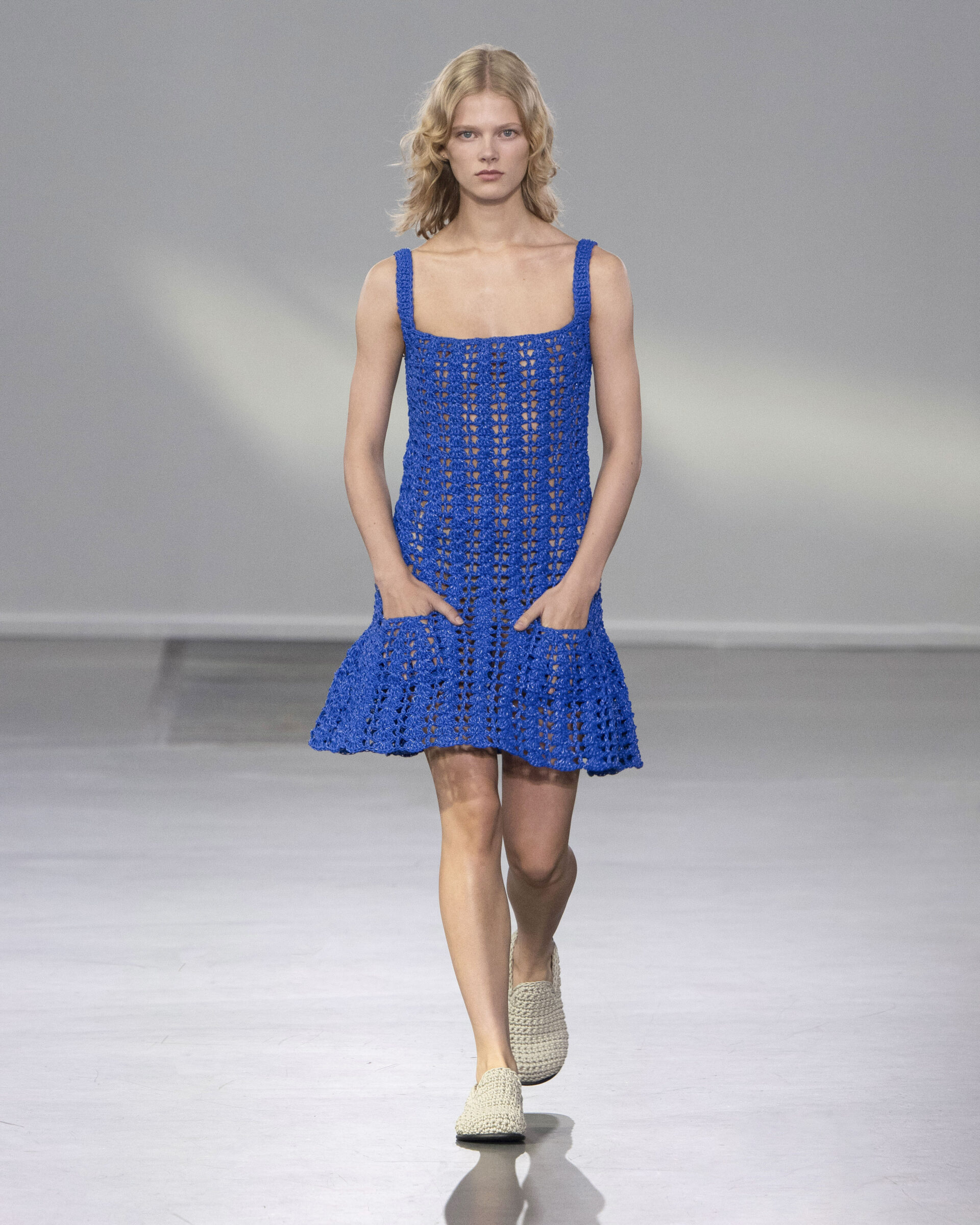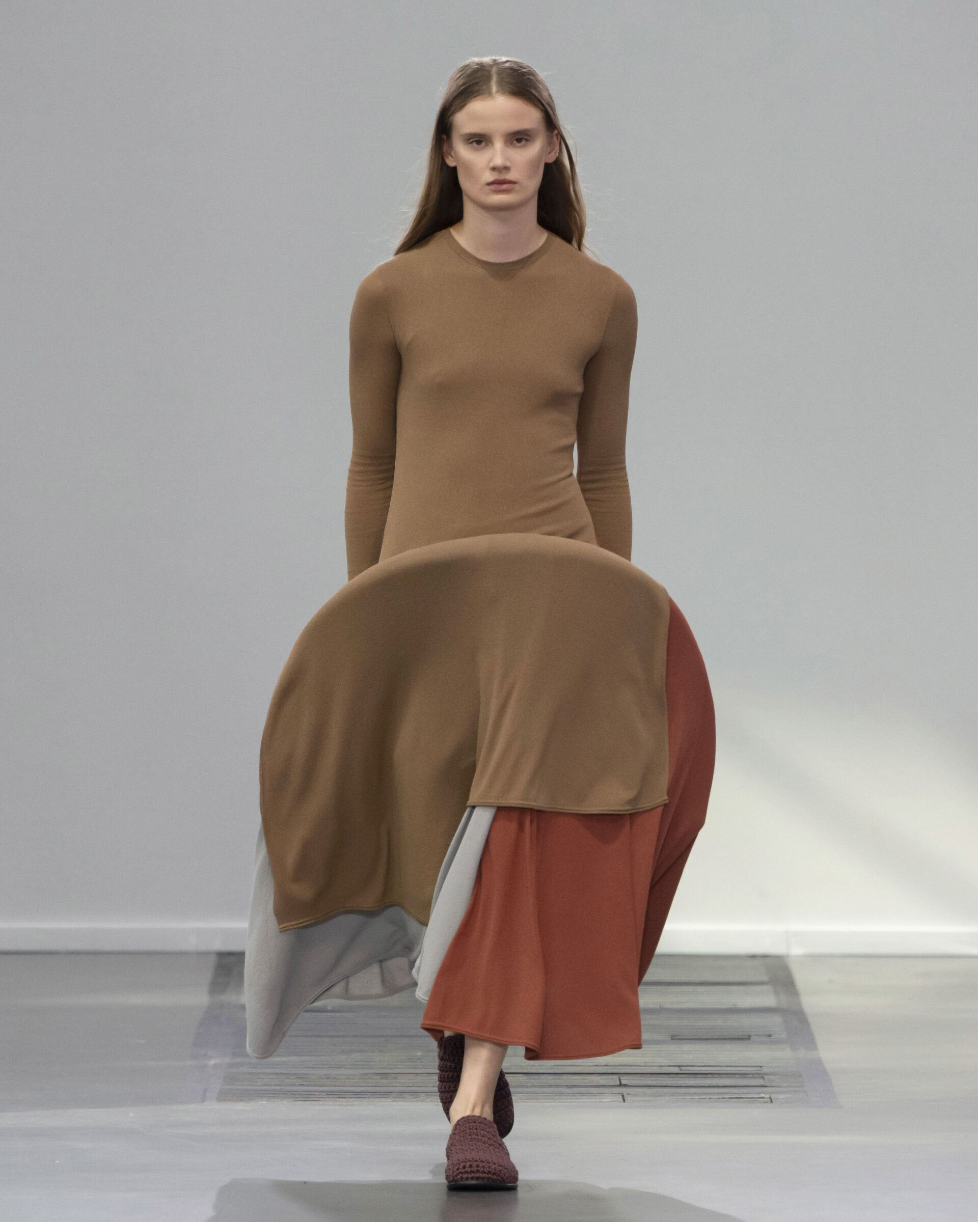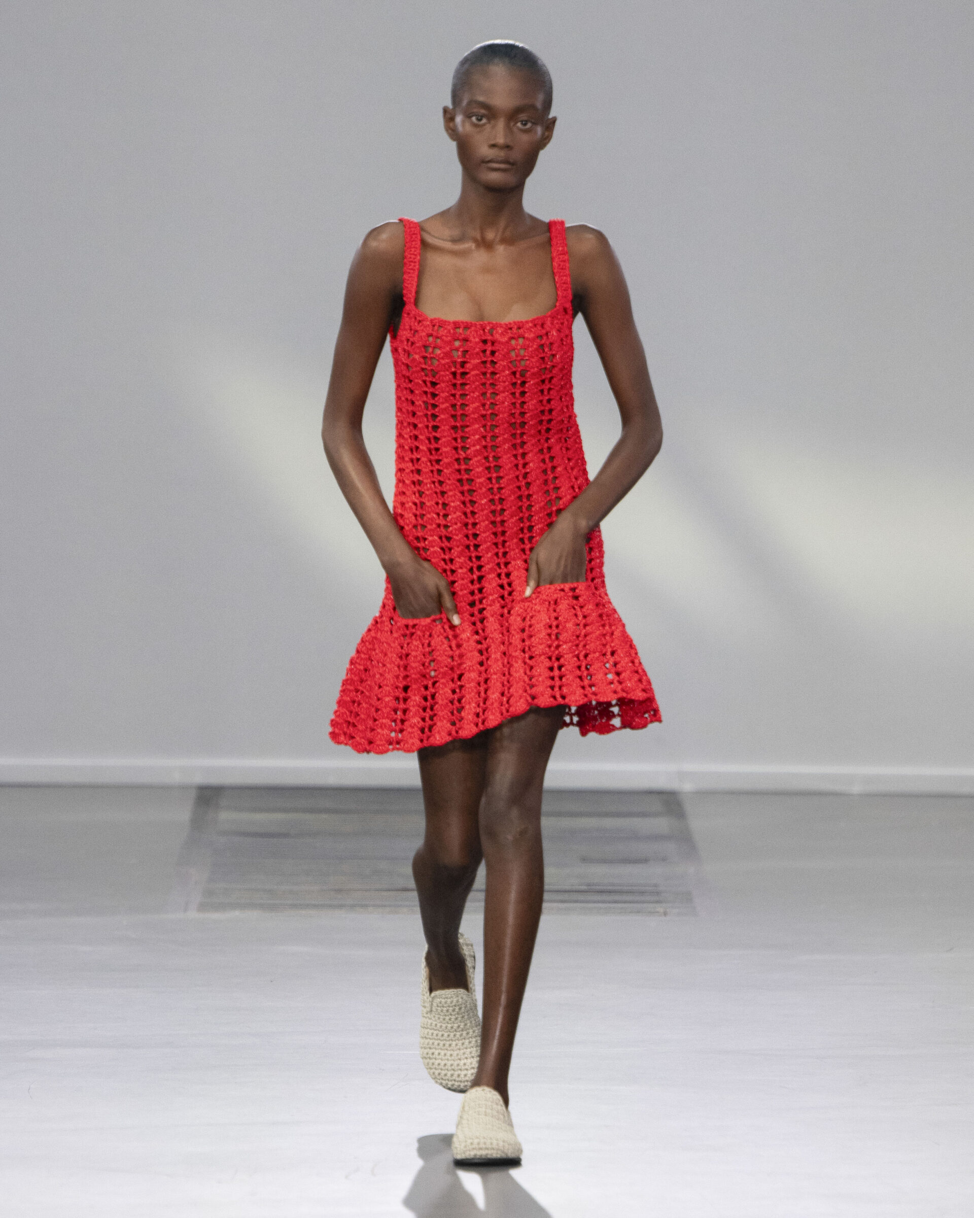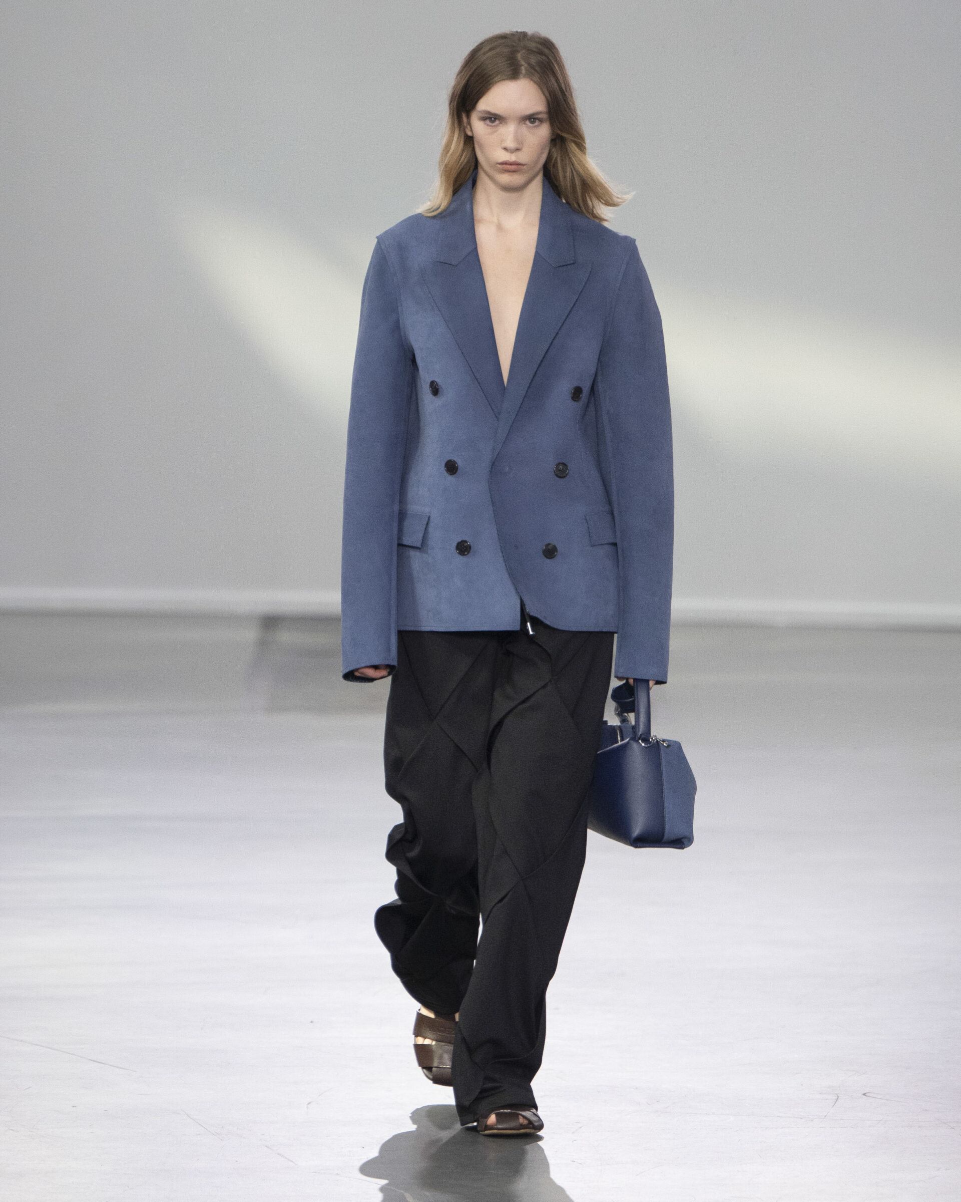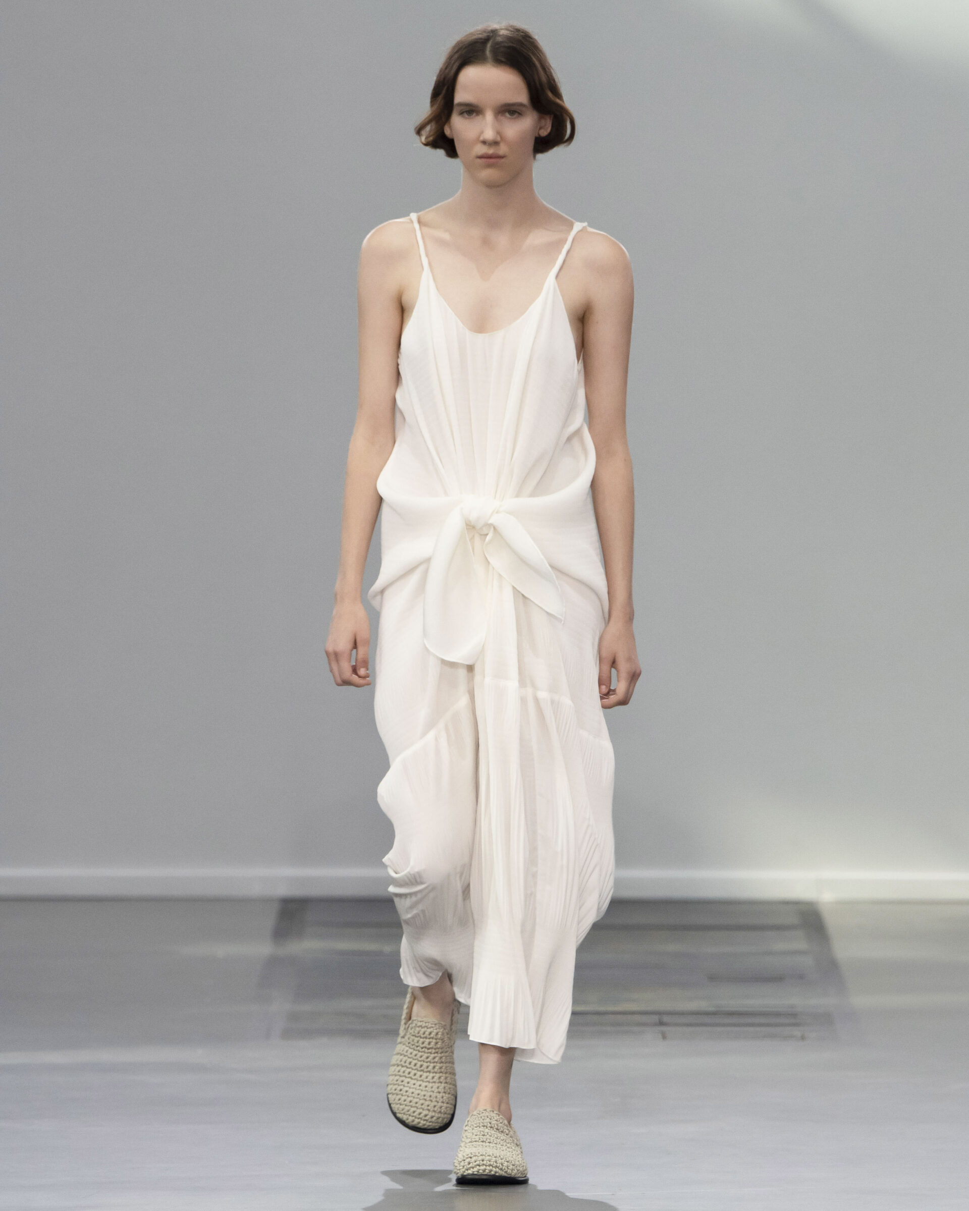 Tutti i capi portati in scena danzano e giocano, su sé stessi, si intrecciano, si imbottiscono, si riavvolgono e cadono in drappeggi morbidi e stravolti nelle forme, ma fedeli nell’essenza della propria funzionalità. La collezione SS24 quindi si pone in continuità con quanto già presentato, sulla scia dello sperimentalismo già osservato con la presentazione della FW23, dove i cartamodelli hanno assunto dimensioni favolistiche, fortemente strutturate, tanto da sembrare finti.