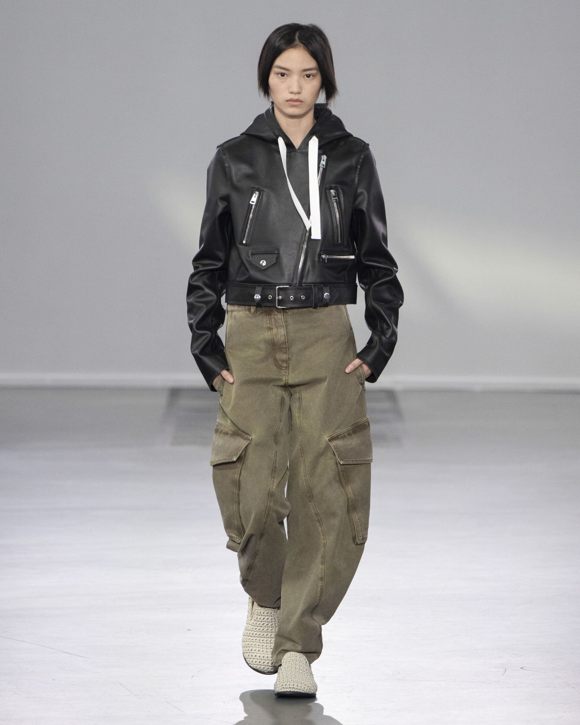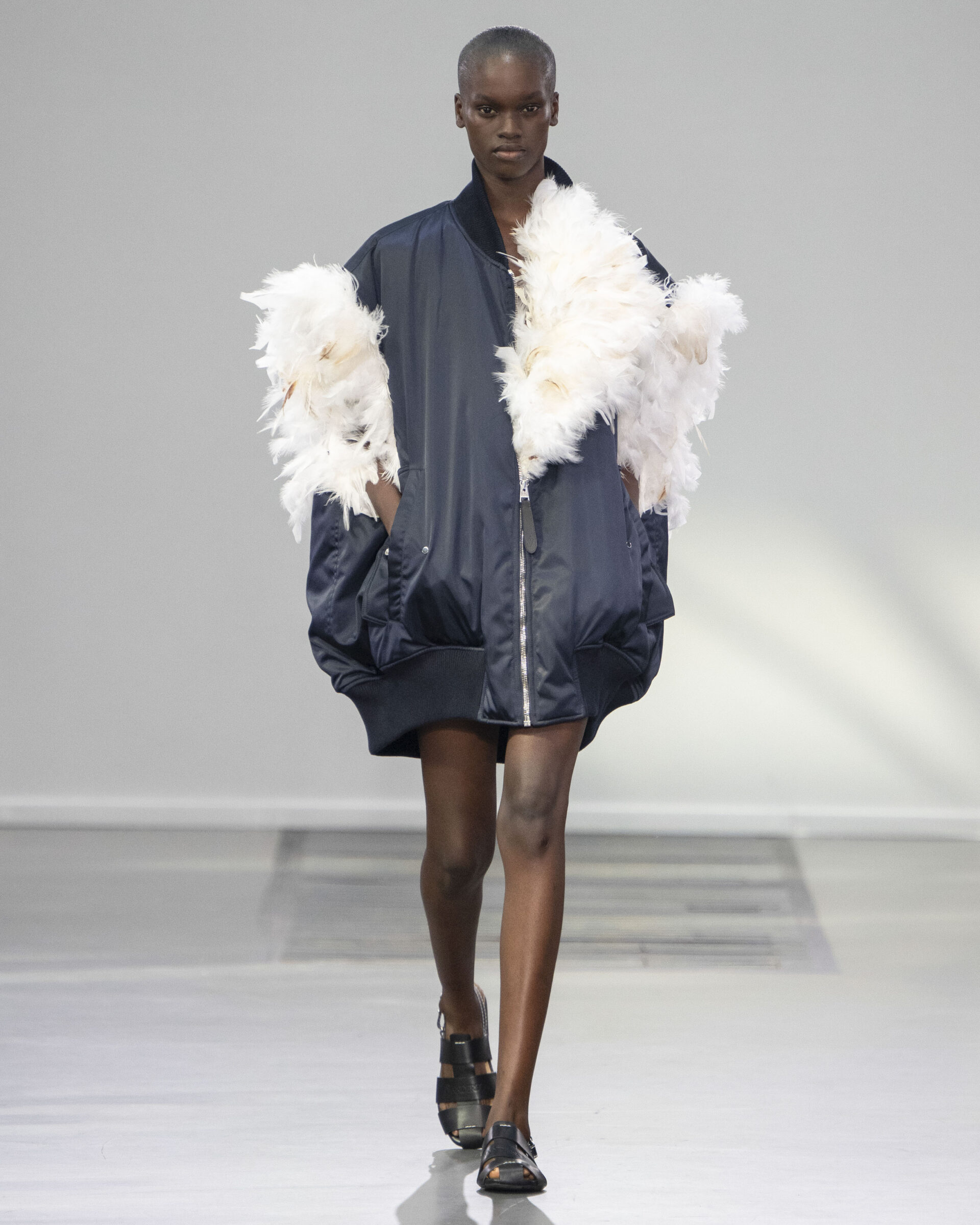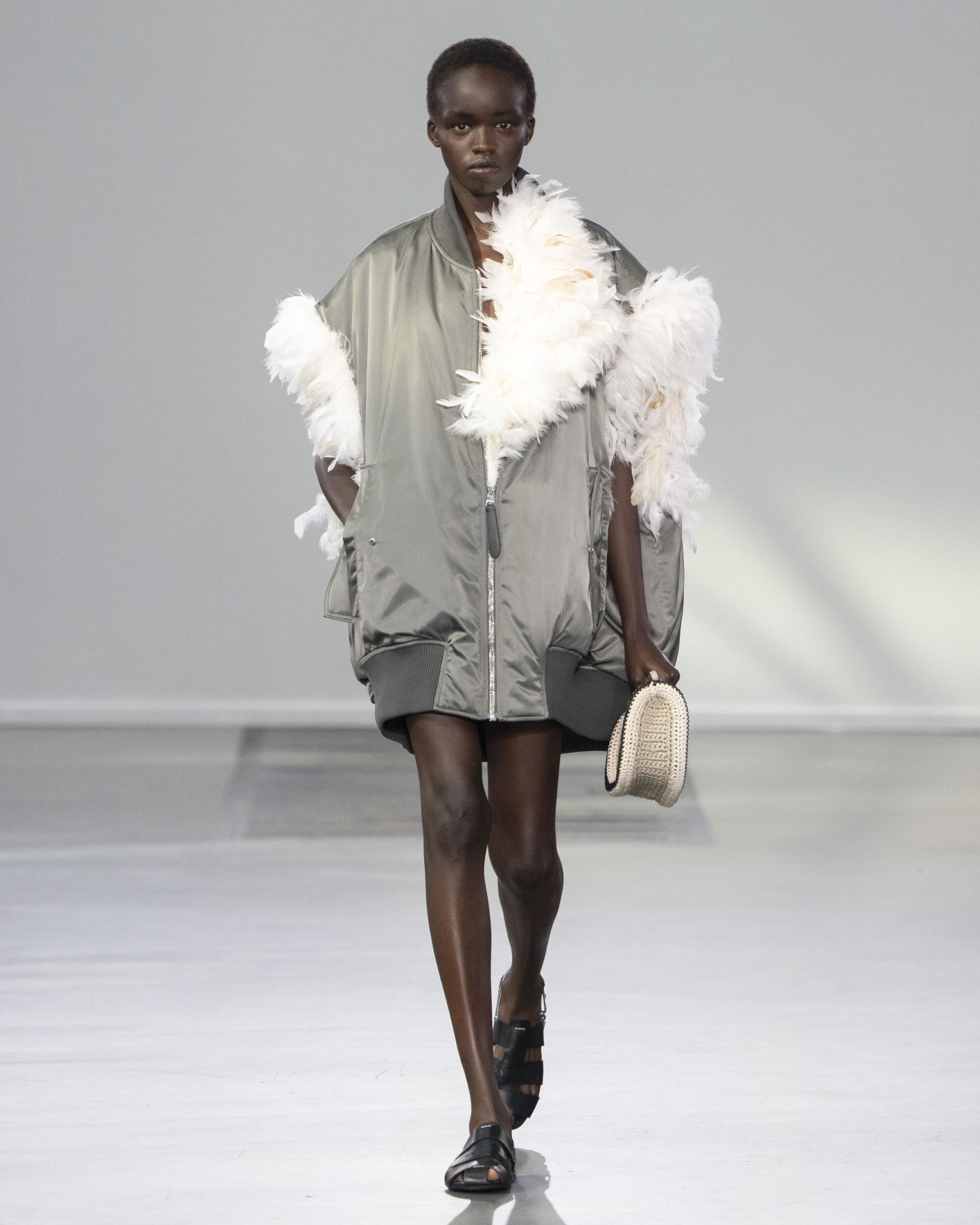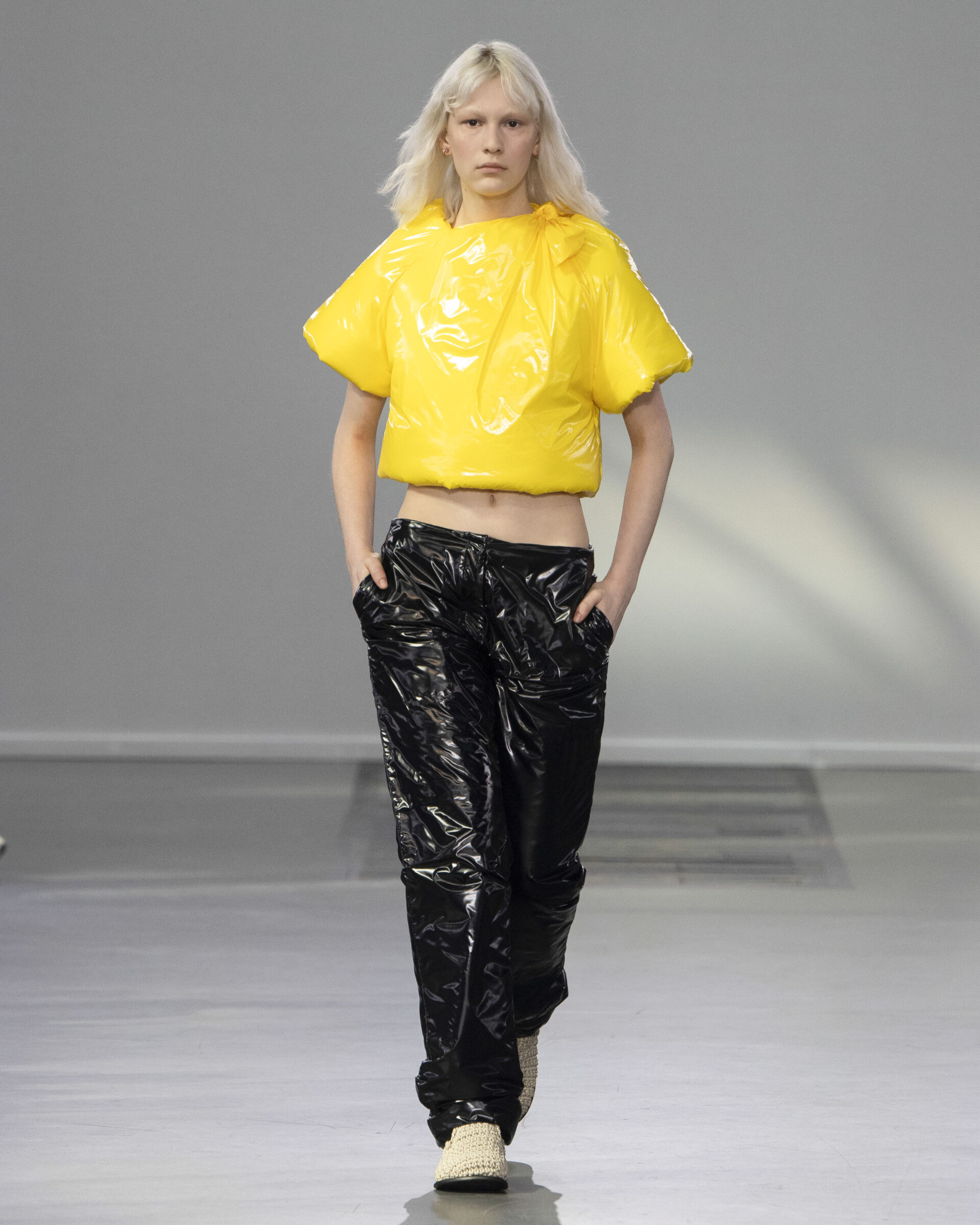 Contrapposto a ciò, sacchetti di plastica sono stati utilizzati per realizzare altri look, gonfi e colorati, con un nodo all’altezza del collo, in una semplicità mai banale ma anzi, molto ricercata. La leggerezza è stata donata anche dagli accessori che hanno impreziosito la collezione, come nel caso delle perline, o delle piume applicate sui giubbotti. Ampio spazio anche ai capispalla, che spaziano dai trench classici, alle motorbike con coulisse, ai bomber così ampi da formare dei pantaloni sporgenti e buffi.