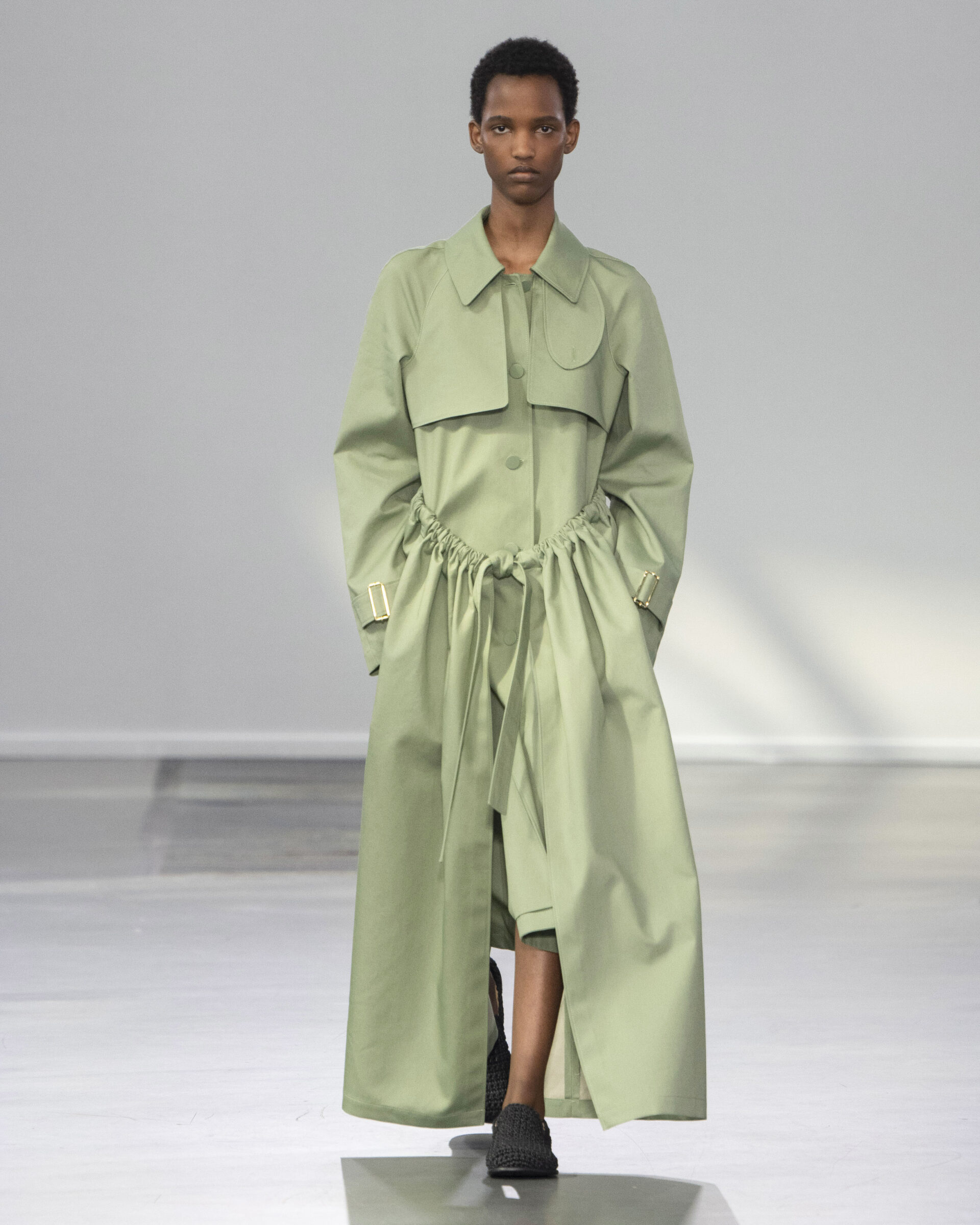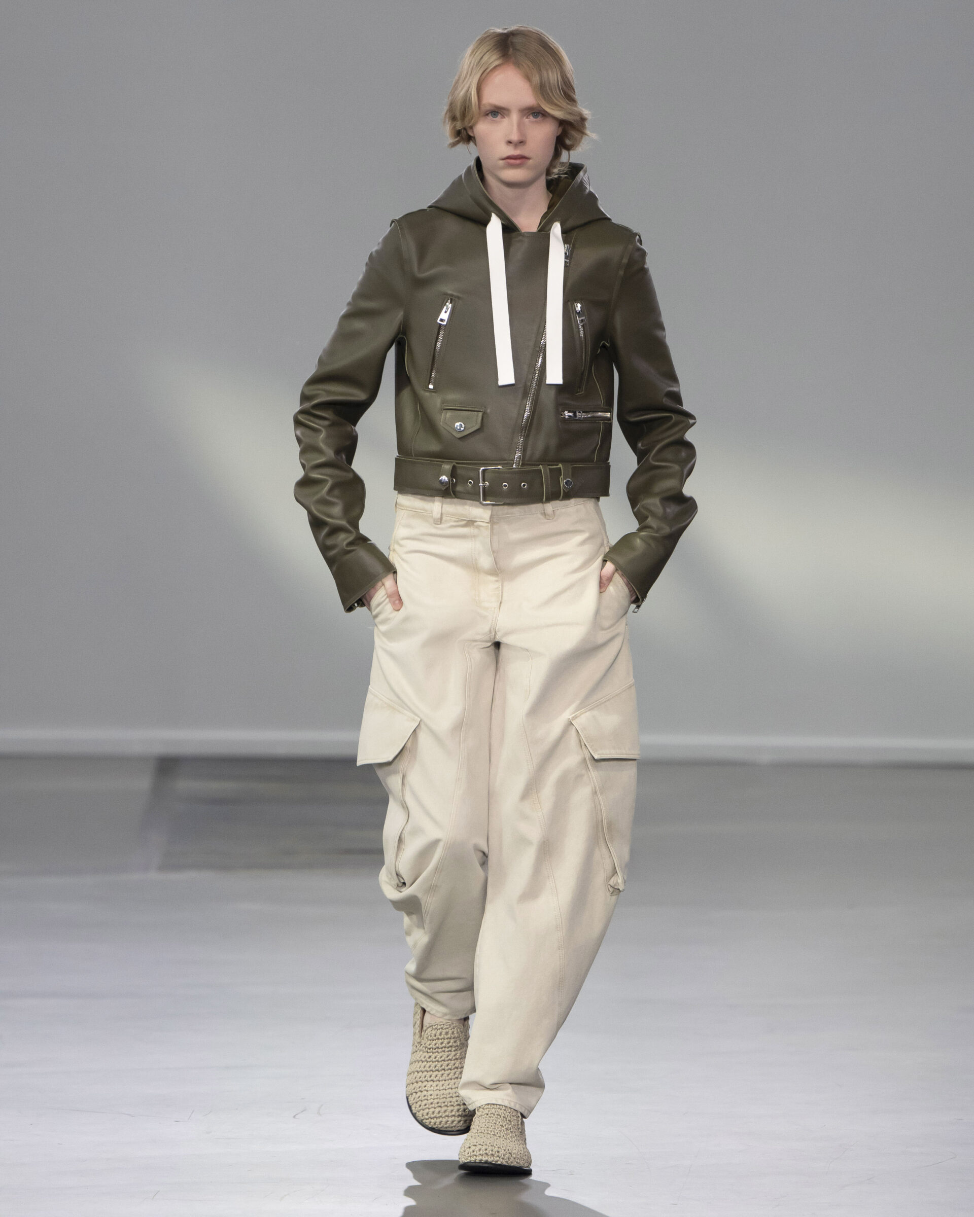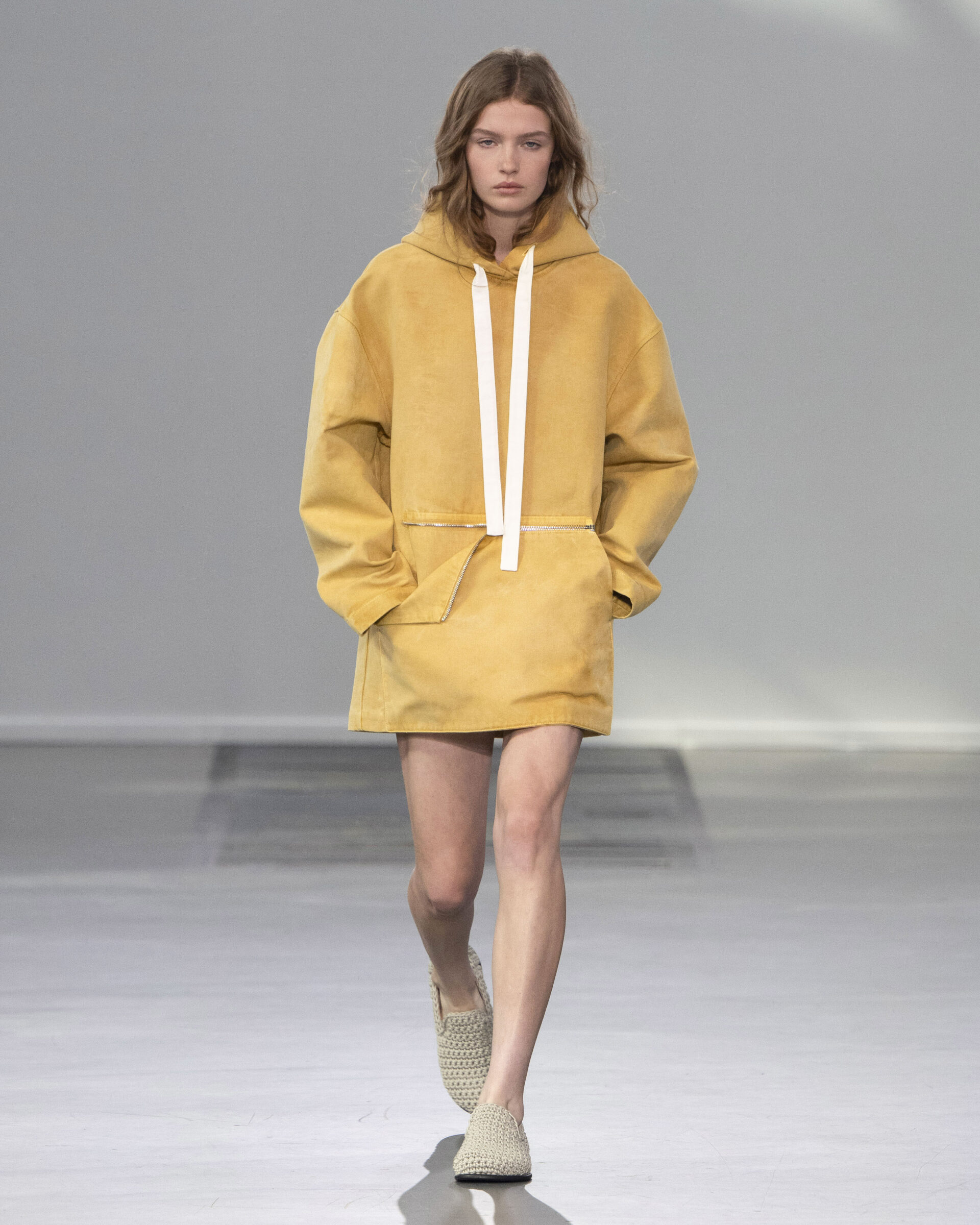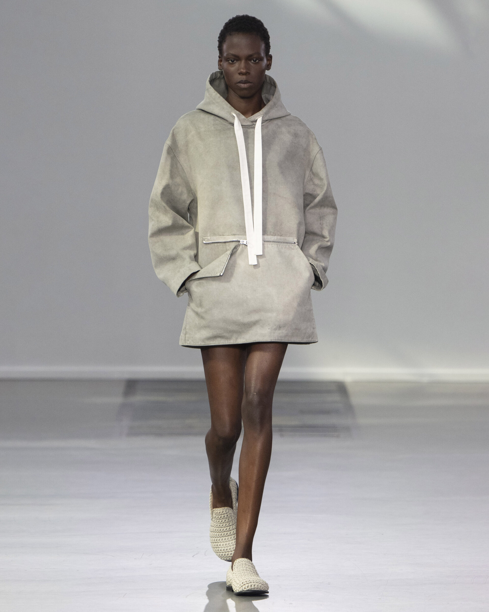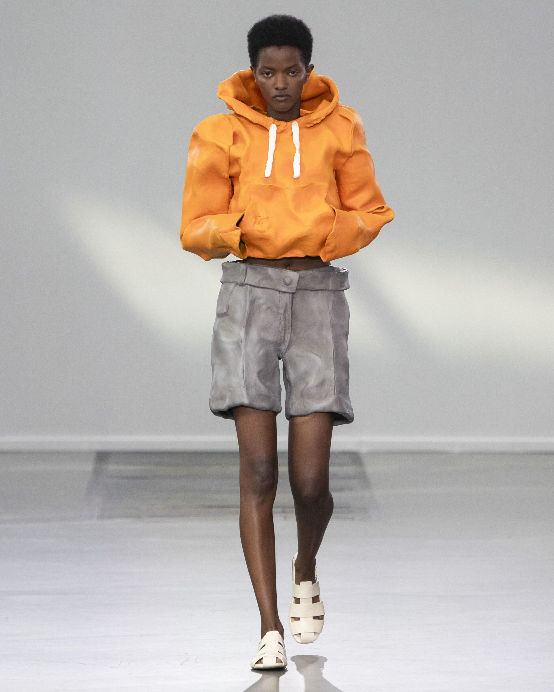 Le forme scelte da JW Anderson sono, ancora una volta, quelle consacrate dalla tradizione, come ad esempio i classici trench britannici o le minigonne, che vengono rivisitate e destrutturate, ma il vero pezzo forte sono le hoodie e gli short. In un abbinamento tanto caro alle mezze stagioni, casual e sportivo, i capi in questione, ovvero felpe con cappuccio e pantaloncini sopra al ginocchio vengono modellati con pongo e argilla, offrendo un allure di maggiore pesantezza, caratterizzati da un finto gioco di chiaroscuro.