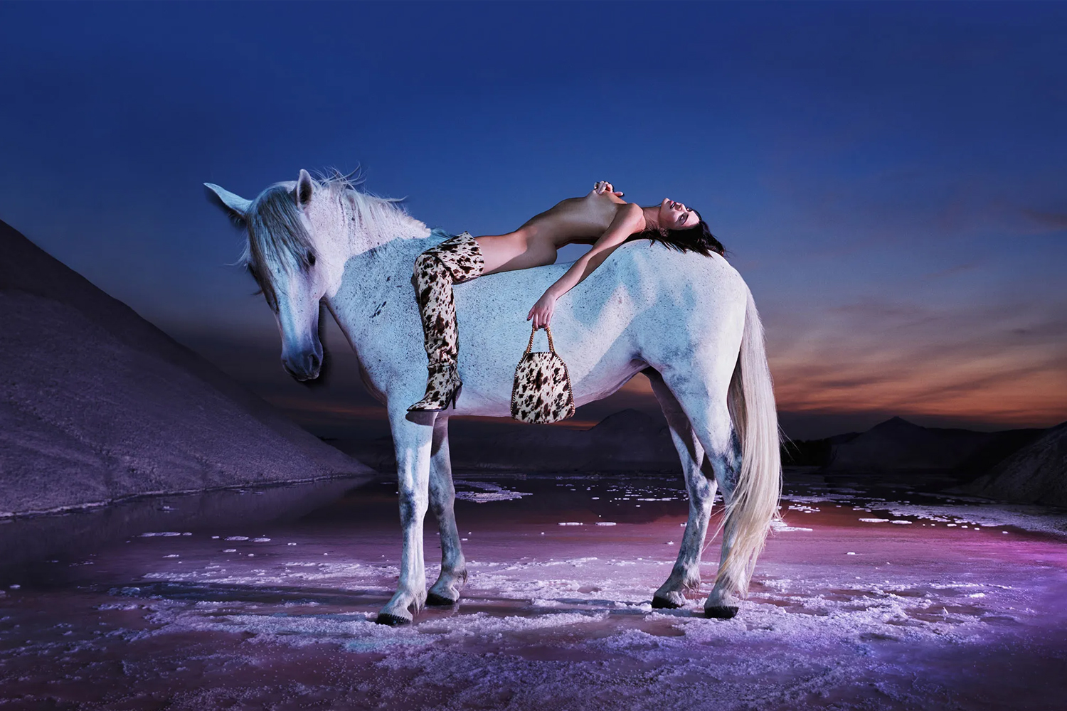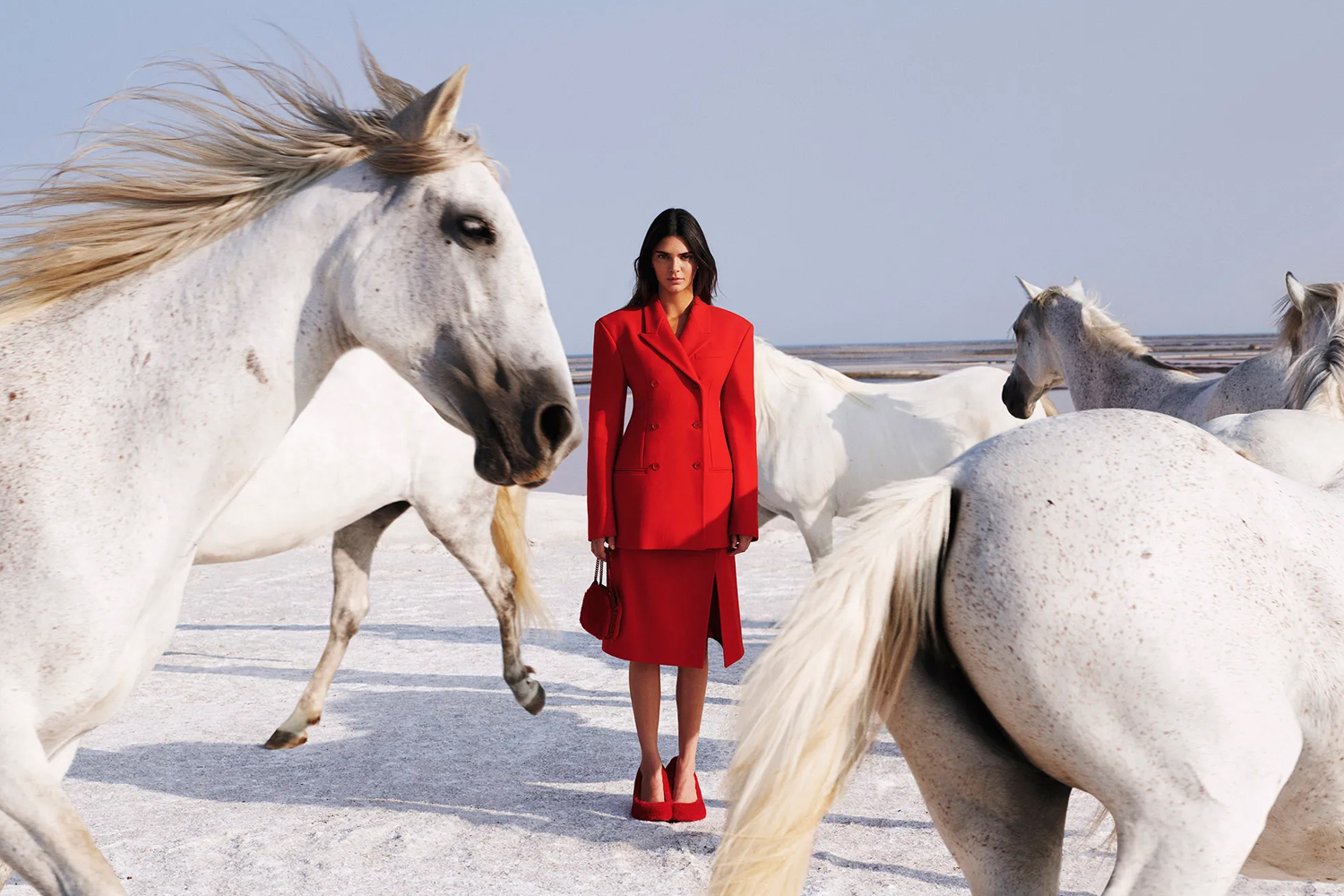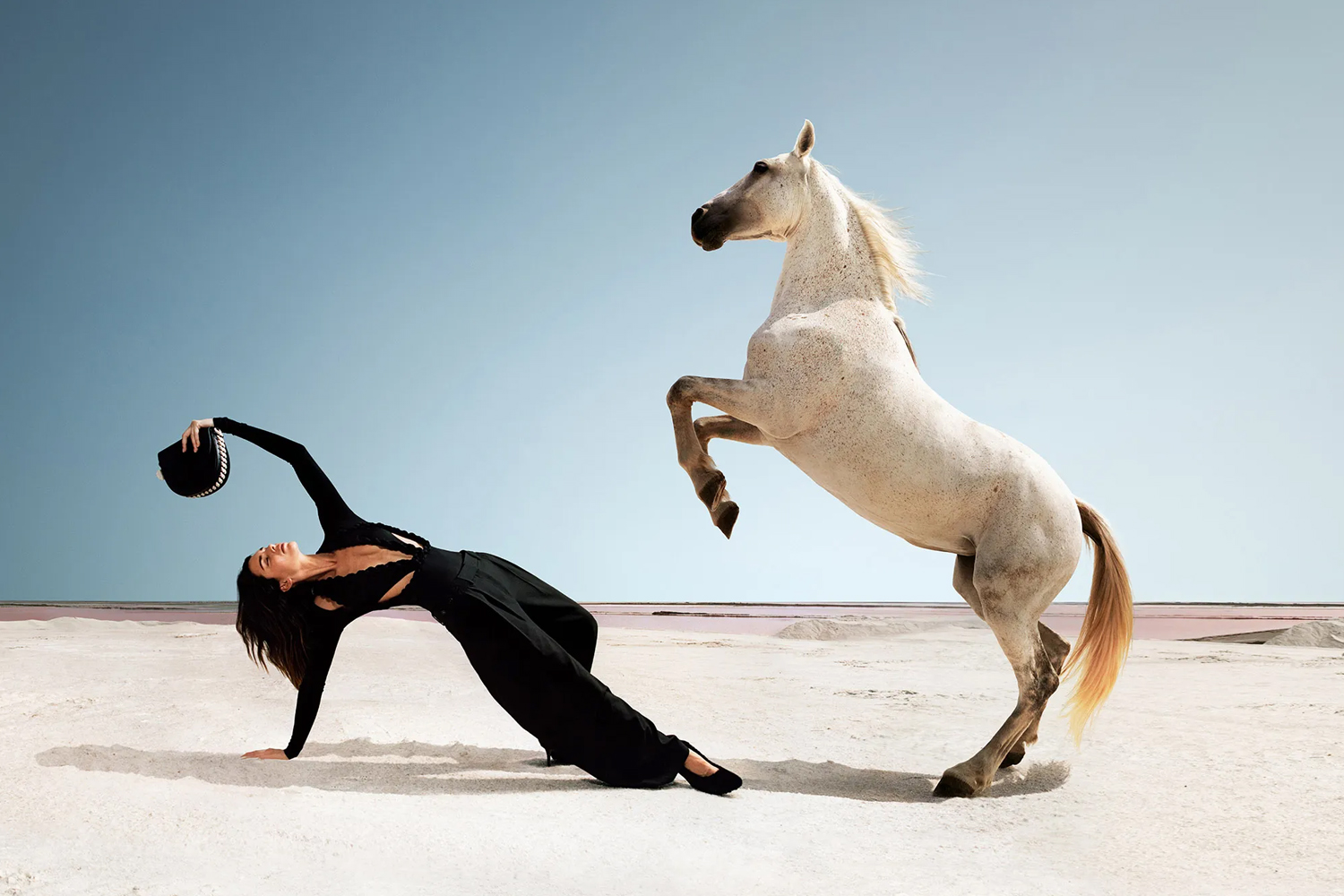Per l’occasione, la supermodella è stata immortalata dall’obiettivo del fotografo Harley Wei tra i pony bianchi delle Saline della Camargue in Francia.