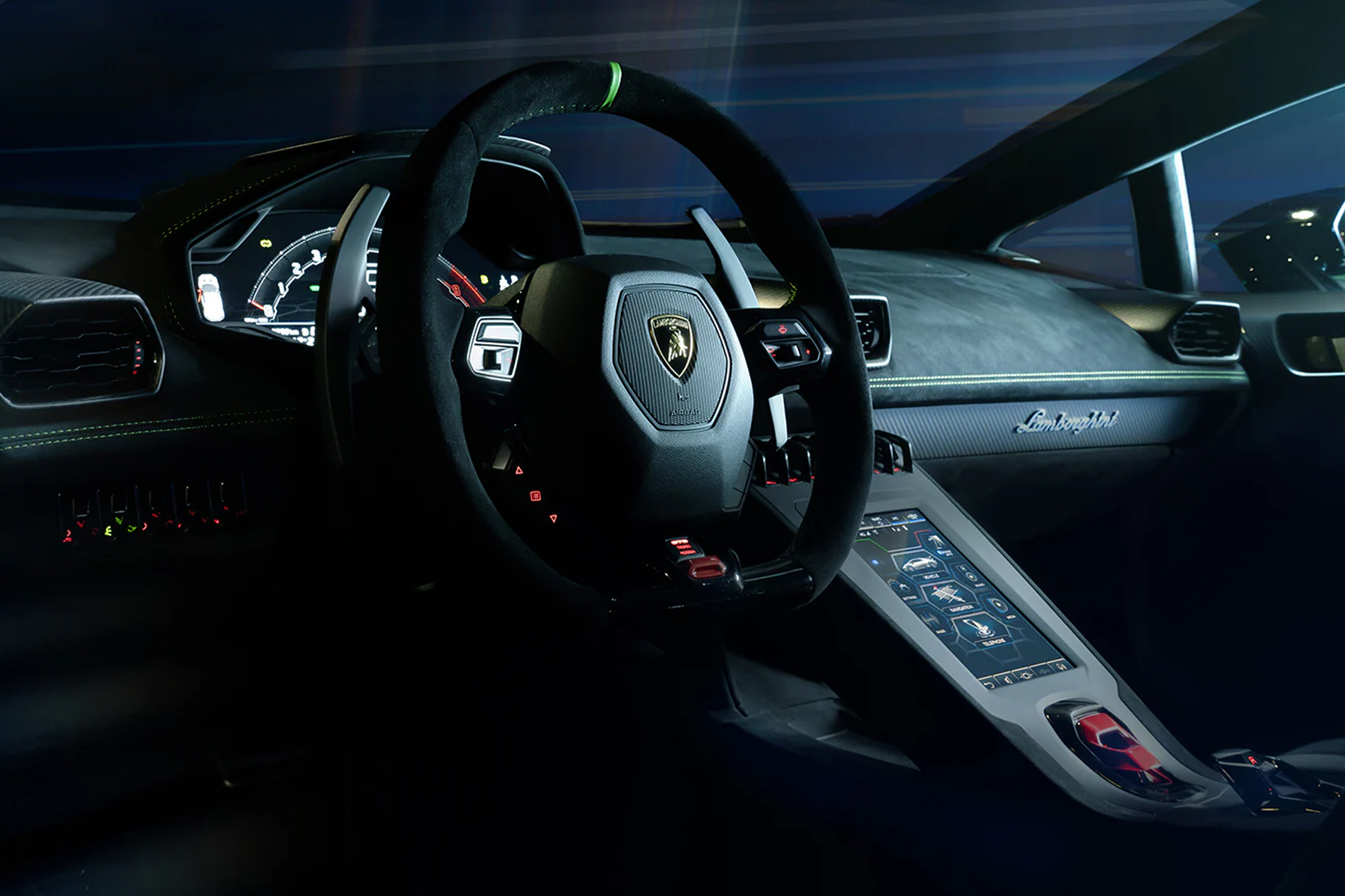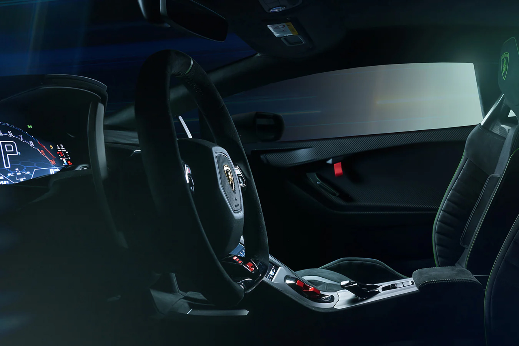 Lo speciale rivestimento esterno, invece, è ispirato alla Lamborghini SC63, il prototipo ibrido di classe hypercar/GTP che competerà per la casa di Sant’Agata nella 24 Ore di Le Mans. Il contrasto tra le tinte “Nero Noctis” e “Verde Mantis” dona infatti all’automobile un aspetto deciso e aggressivo, enfatizzato dalla sottile linea color “Rosso Mars” che percorre la parte inferiore di tutta la carrozzeria, mentre la fascia tricolore che attraversa cofano e tetto rimarca le origini dell’azienda. I loghi “10° Anniversario Squadra Corse” sulle portiere ricordano infine il significato celebrativo della vettura.