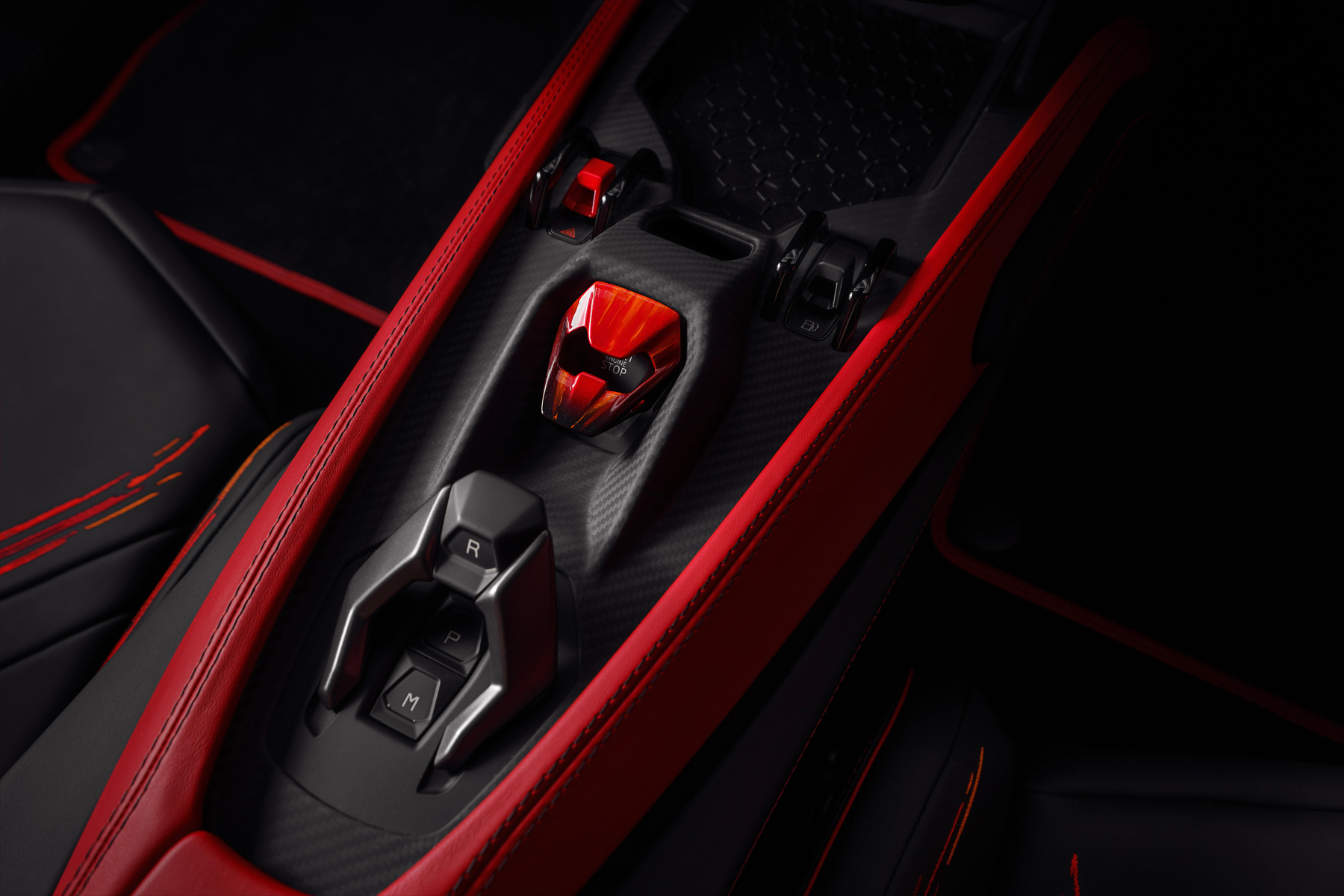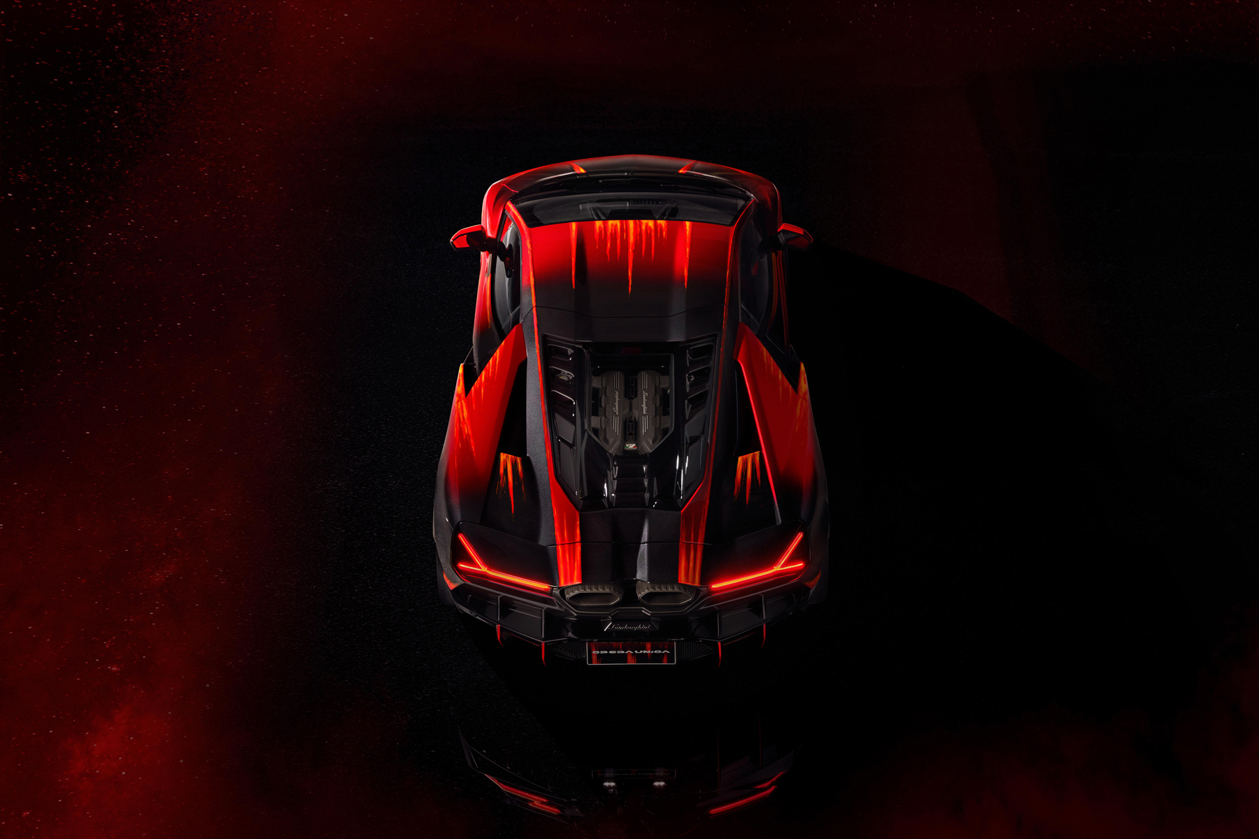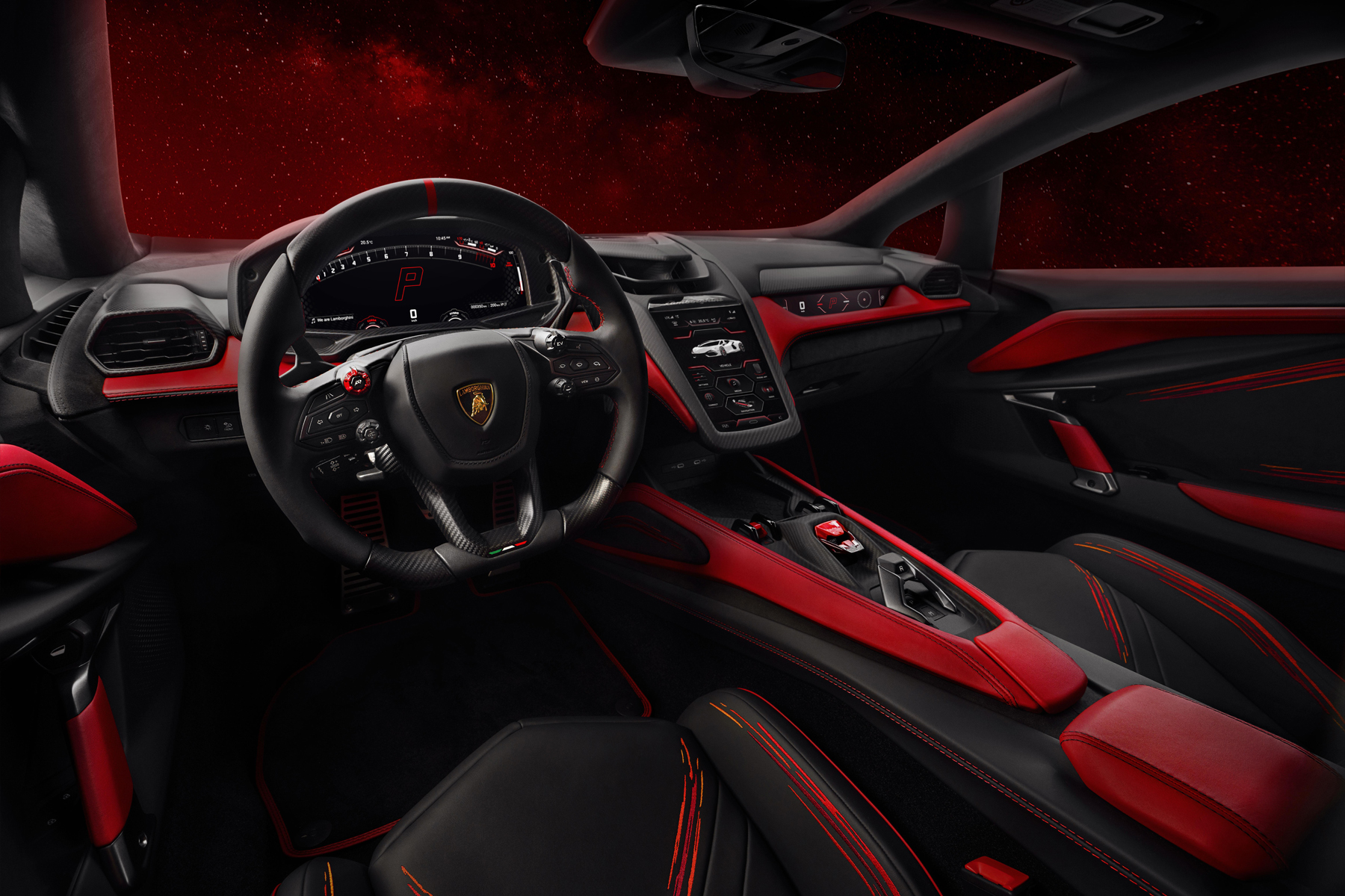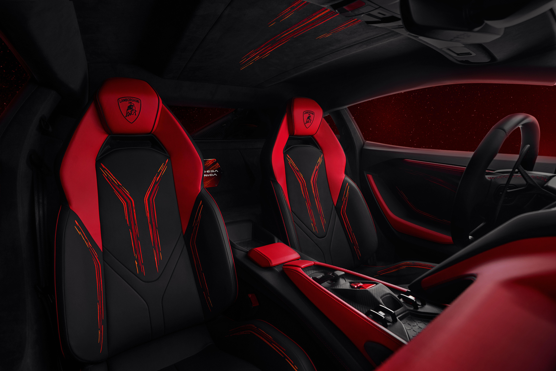 All’interno dell’abitacolo, la nuova Opera Unica prosegue la trama cromatica mostrata sulla carrozzeria, con eleganti rivestimenti in Nero Ade intervallati da dettagli in Rosso Efesto; gli spazi sono ulteriormente impreziositi da particolari come cuciture invertite ed elementi in tessuto Corsatex, che hanno richiesto altre 53 ore di lavoro al team Lamborghini. L’immancabile targa in carbonio certifica poi l’unicità della vettura.