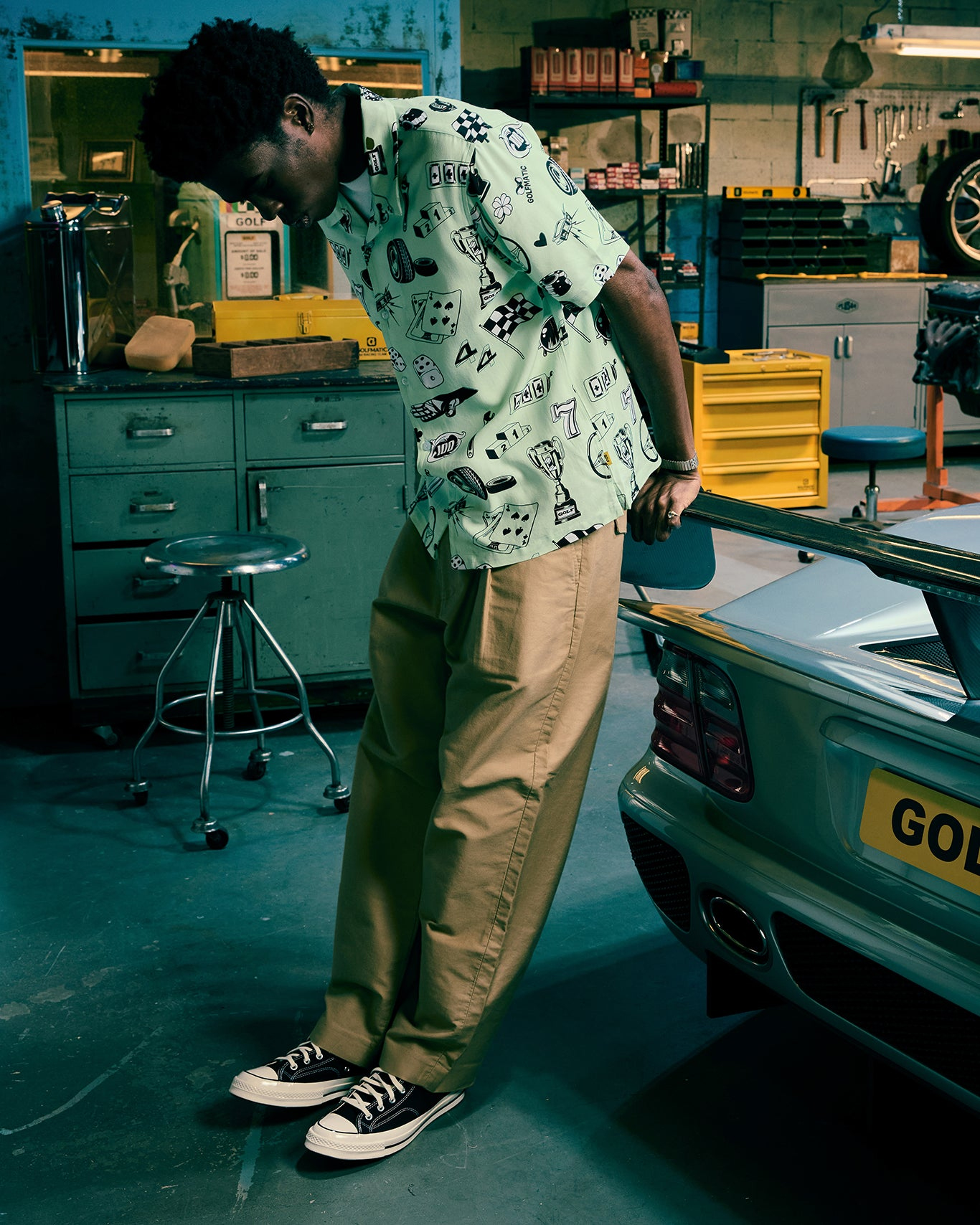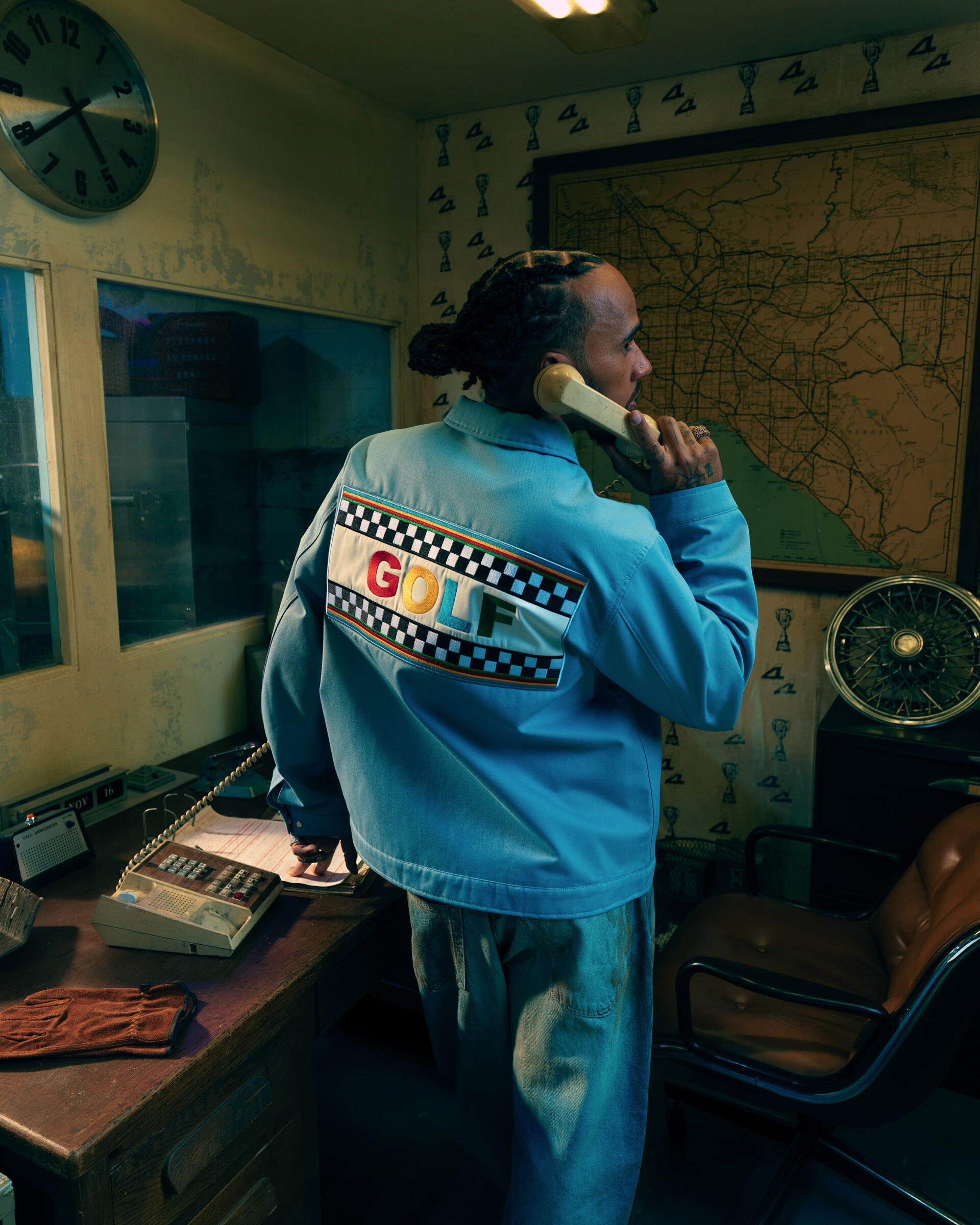 Dalle foto pubblicate vediamo motocross jacket con la scritta “GOLF WANG” sul petto e il logo +44 su entrambe le braccia, mentre in un altro scatto – dove Hamilton sembra stia parlando al telefono di un’officina – possiamo notare la giacca workwear dove la scritta “GOLF” è disegnata sulla schiena come se tagliasse il traguardo di una pista. La capsule includerà anche camicie i cui bottoni avranno il tema F1 o riporteranno immagini ed elementi legati alla città in cui si correrà in notturna il prossimo Gran Premio.
