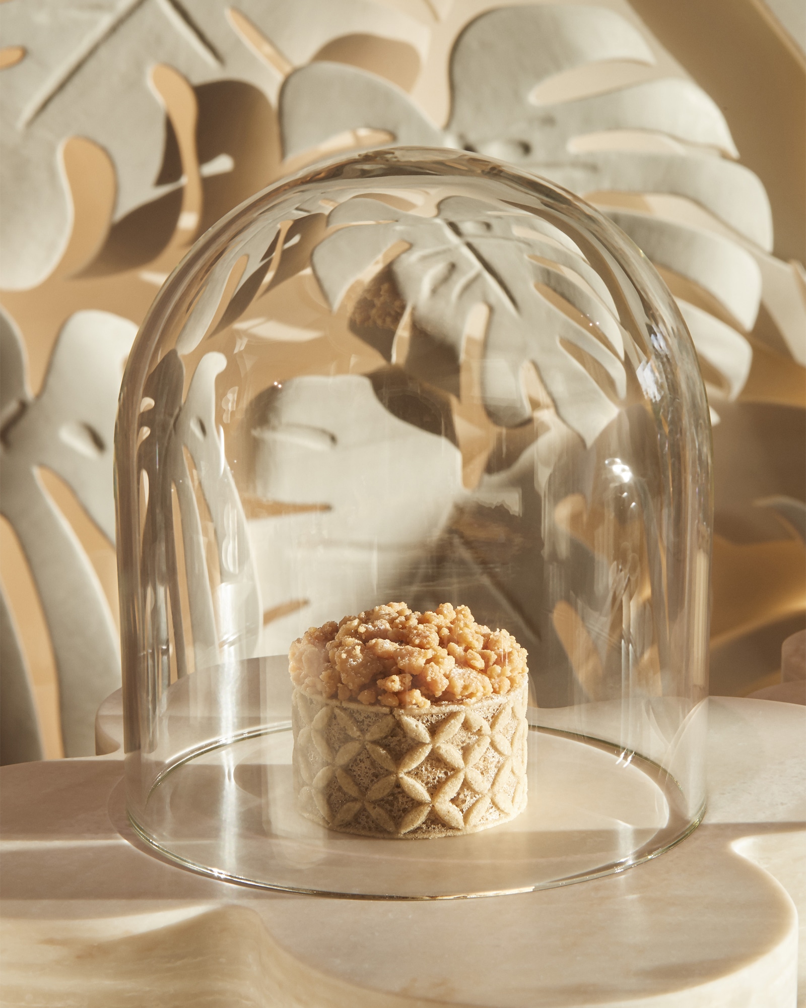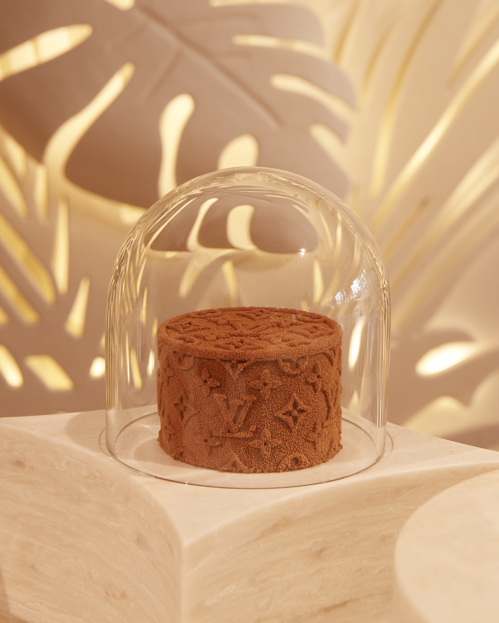 Nel menù, una selezione di cioccolatini, dolci e pasticcini unici creati per la casa e decorati attraverso il monogram Louis Vuitton caratterizzano la proposta sotto forma di entremets alla vaniglia, entremets al cioccolato con sentori legnosi, e noisette con pralina di grano saraceno.