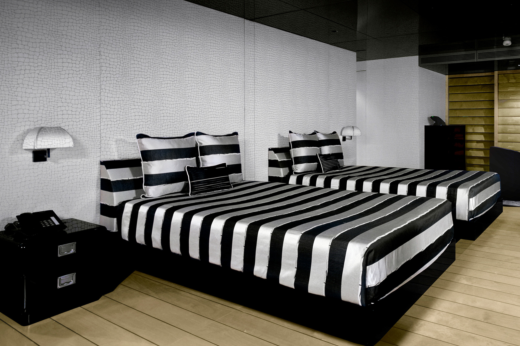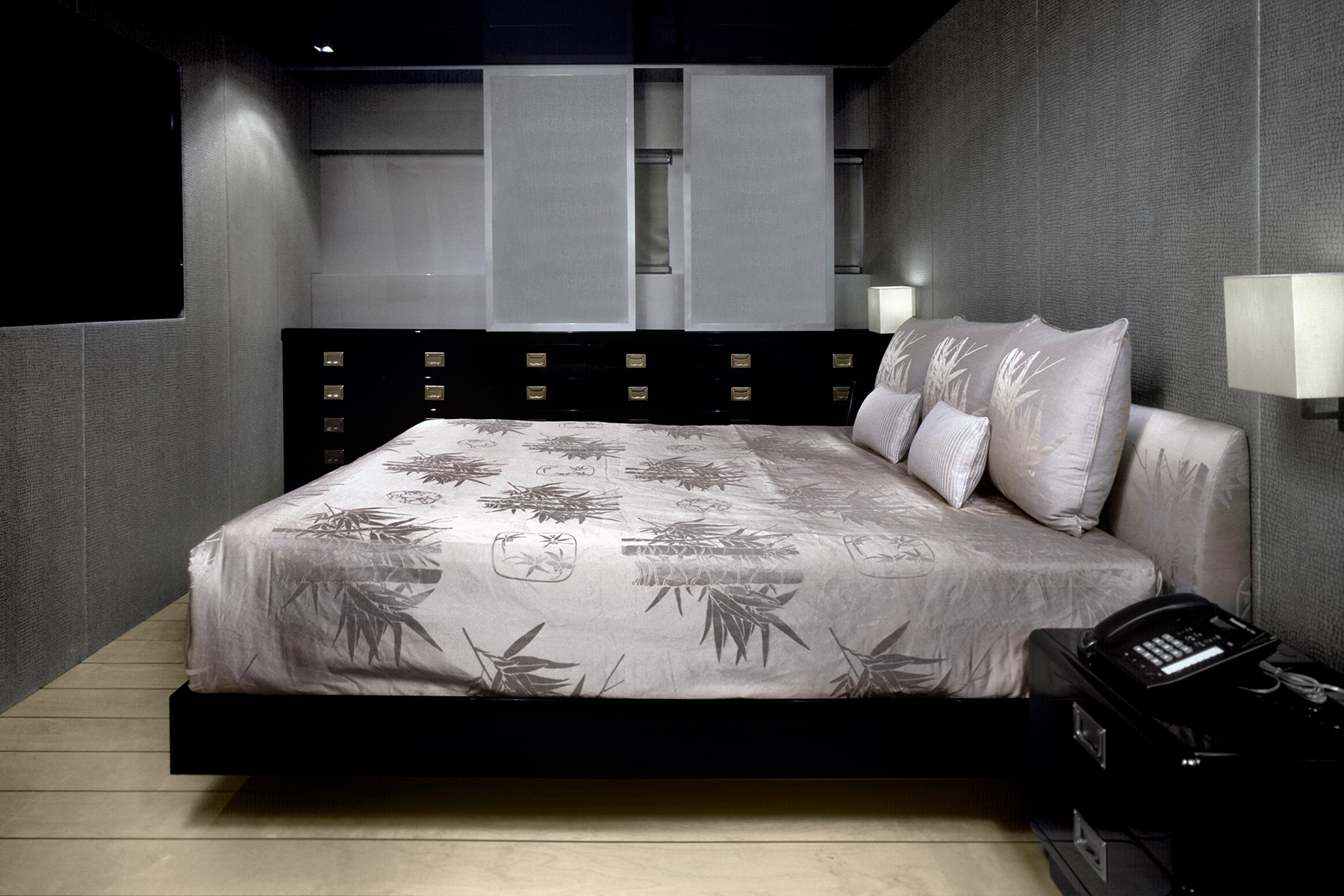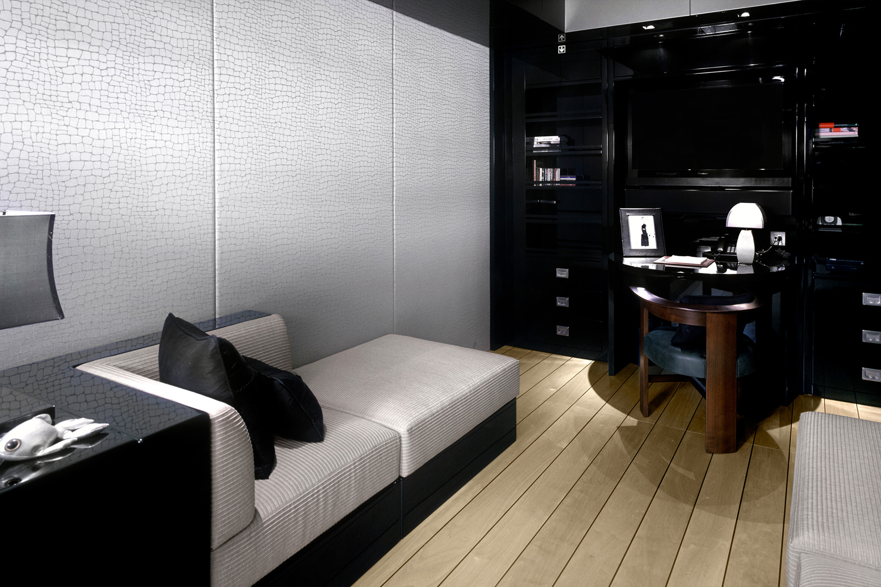 Continuando all’interno, tutti gli spazi sono decorati con la tecnica della laccatura, ma se per i soffitti è stato scelto un grigio metallo, le restanti aree presentano lo stesso verde scuro che caratterizza l’esterno. Vetri satinati retrolaccati impreziosiscono la cucina, mentre i bagni presentano un elegante arredamento in marmo. Tutte le cabine sono percorse da pavimenti in legno di betulla e allestite con mobili Armani Casa, anche se gran parte di essi è stata realizzata su misura dallo specialista di Armani Casa Interior Design Studio sotto l’attenta supervisione di Re Giorgio.