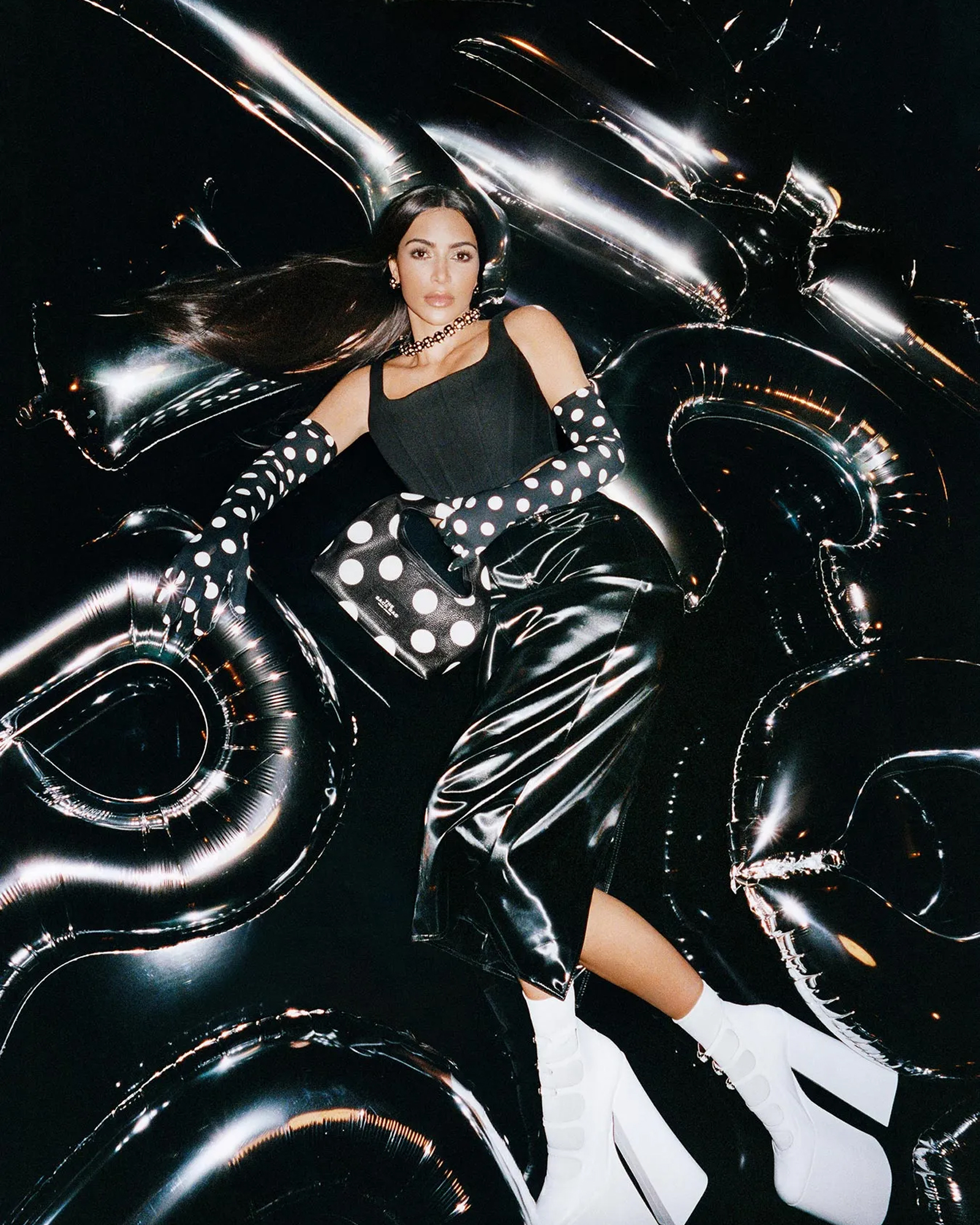 In un altro scatto, Kim sfoggia una giacca nera di jeans con maniche voluminose con una tote bag completamente bianca, e infine, sempre riprendendo il tema dei gonfiabili, la star posa accanto ad un paio di palloncini a forma di gambe, che richiamano gli stivali platform indossati nella prima foto, abbinata alla borsa Curve a forma di mezzaluna, e a una giacca nera monocromatica con motivo a pois tono su tono.