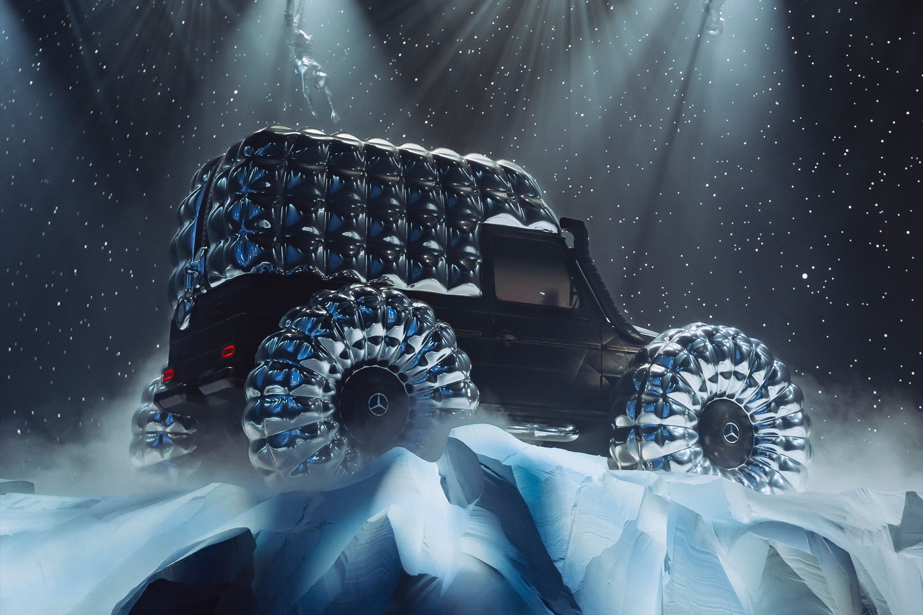 La nuova vettura viene per l’occasione rivestita con il tradizionale motivo trapuntato che caratterizza i capispalla Moncler, creando un look all’avanguardia in cui le linee morbide e fluide del piumino incontrano la struttura più spigolosa e grezza del G-Wagon.