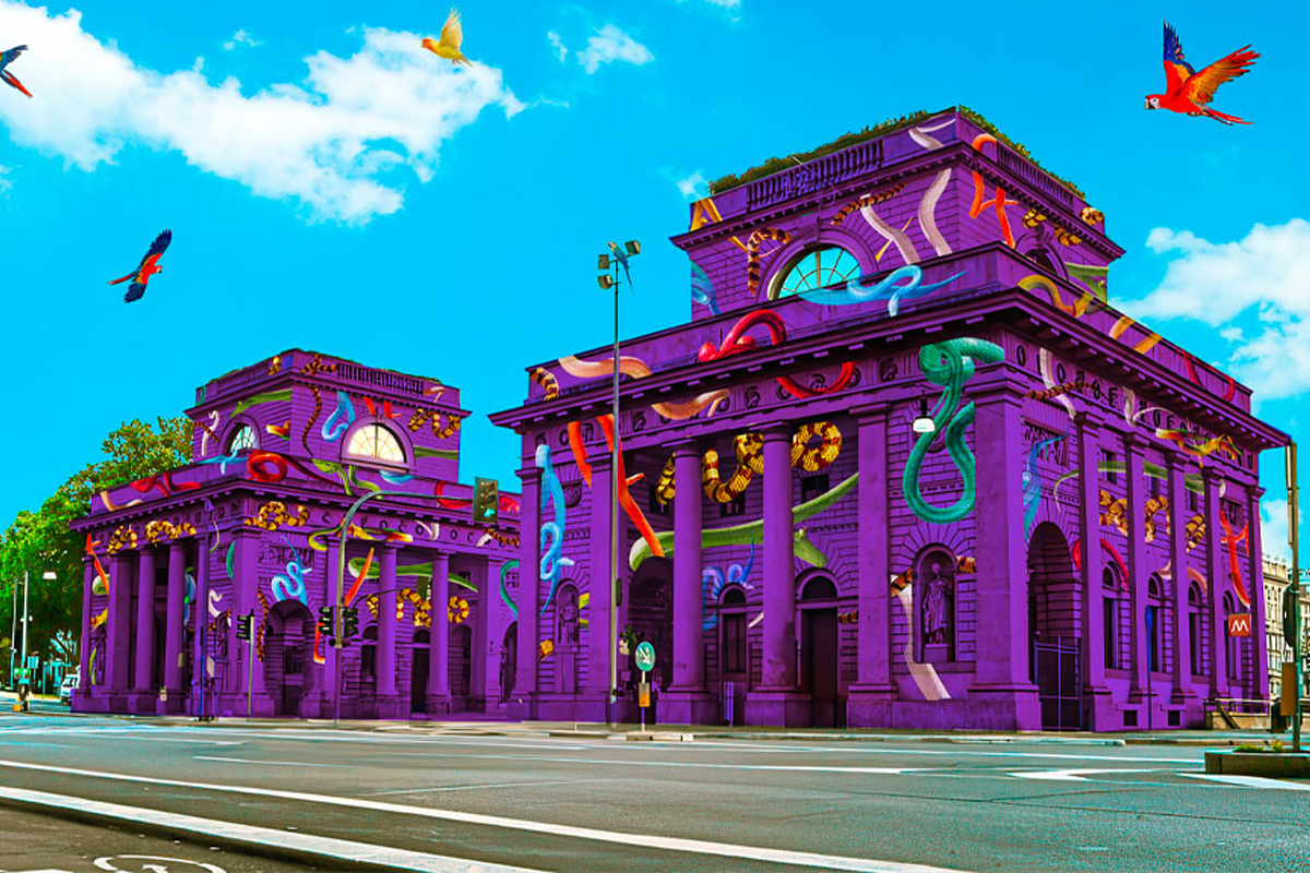 Lo studio creativo fondato da Maurizio Cattelan e Pierpaolo Ferrari veste i bastioni di Porta Venezia con gli iconici serpenti, che diventano simbolo pulsante di metamorfosi e flusso di energia in continua evoluzione.