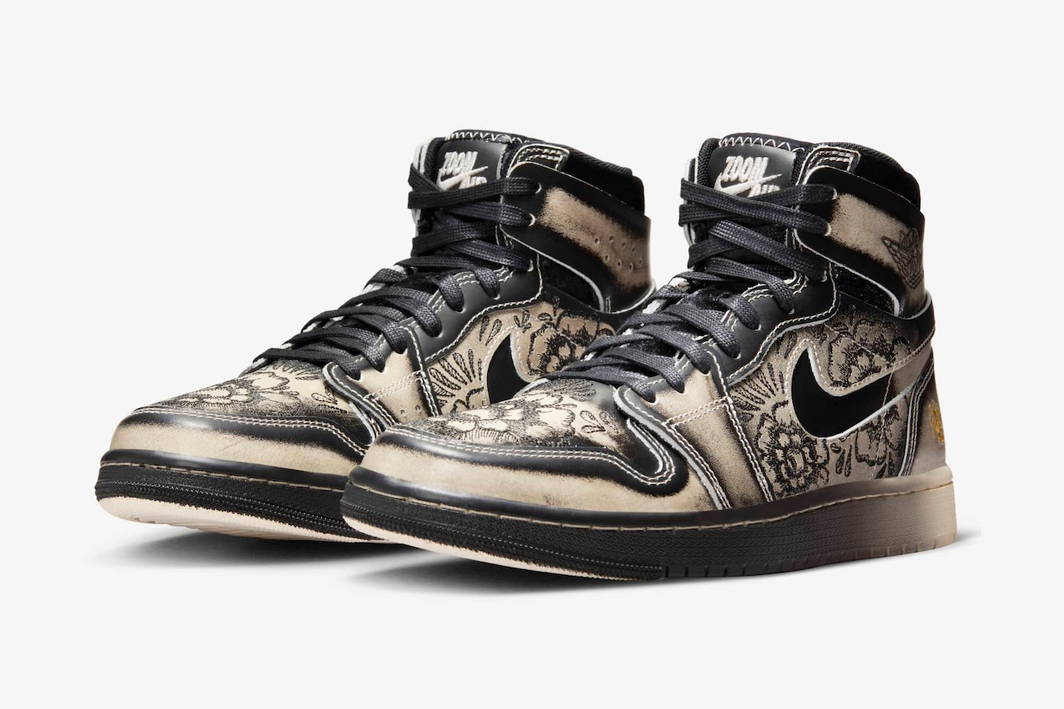 Per quanto riguarda la Air Jordan 1 Zoom CMFT 2, invece, questa si caratterizza per la presenza di una tomaia in pelle, che richiama il chiaroscuro espresso dalle ossa di uno scheletro, e viene decorato da alcuni ricami floreali. All’altezza del tallone, invece spicca un piccolo scheletro.