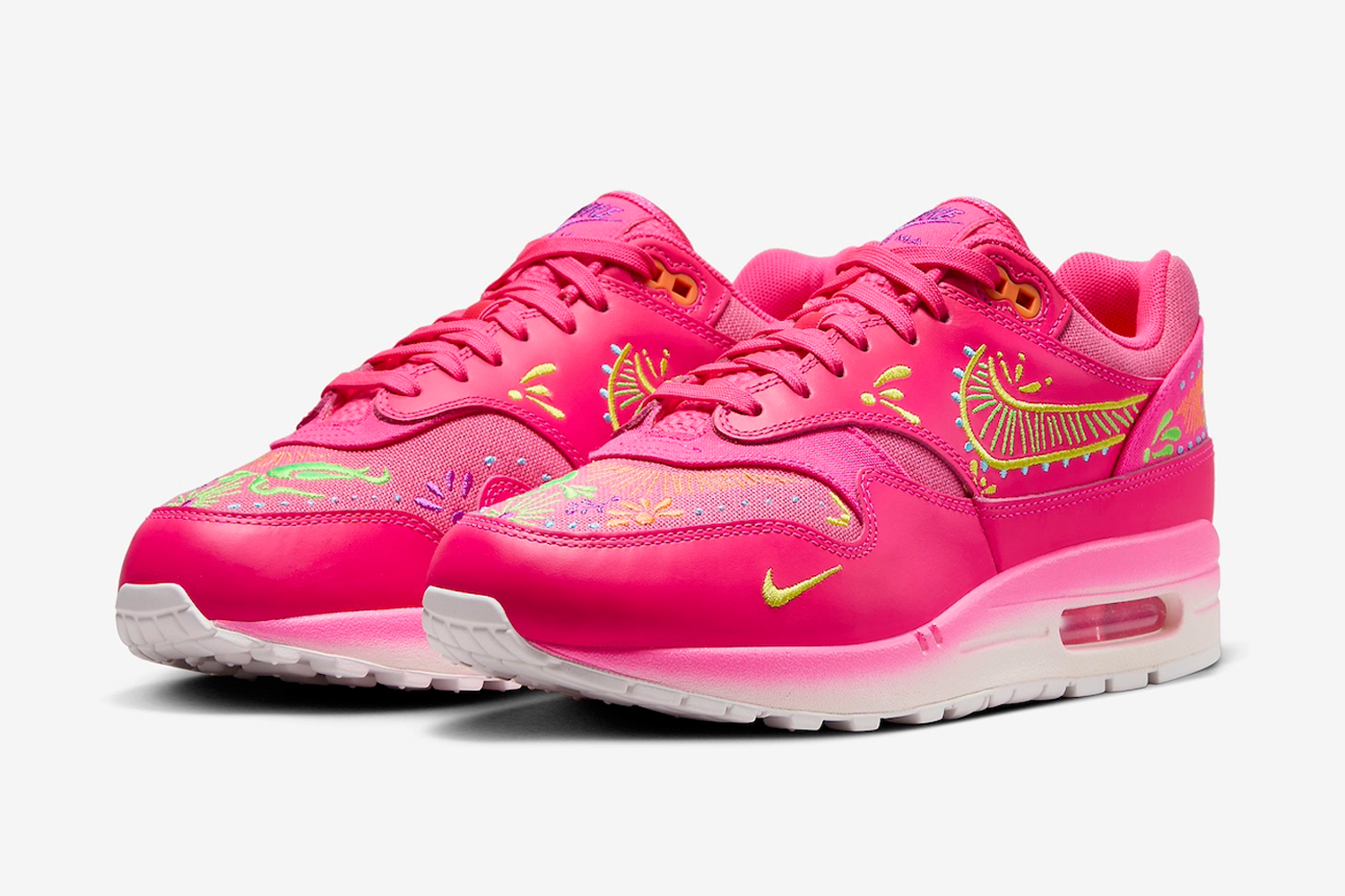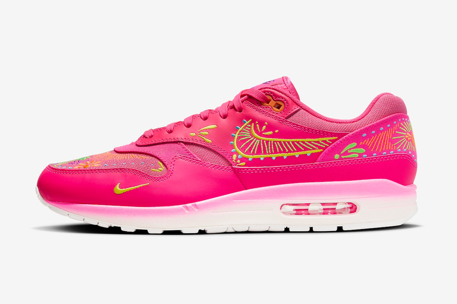 Sicuramente l’Air Max 1 è la sneaker più eccentrica di questo pack, presentandosi con una tomaia interamente rosa, impreziosita da detailing giallo, verde e blu, ricordando proprio i colori tipici di questa grande festa messicana. Per quanto riguarda il retro, ancora una volta compaiono due colibrì, simbolo leggendario di questa ricorrenza.
