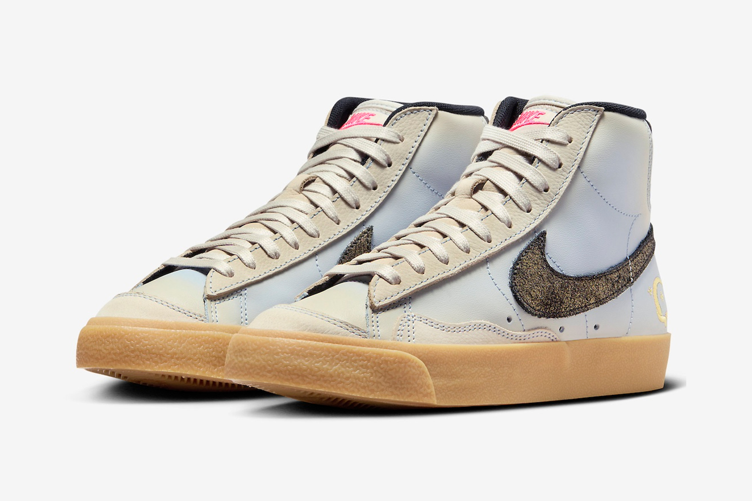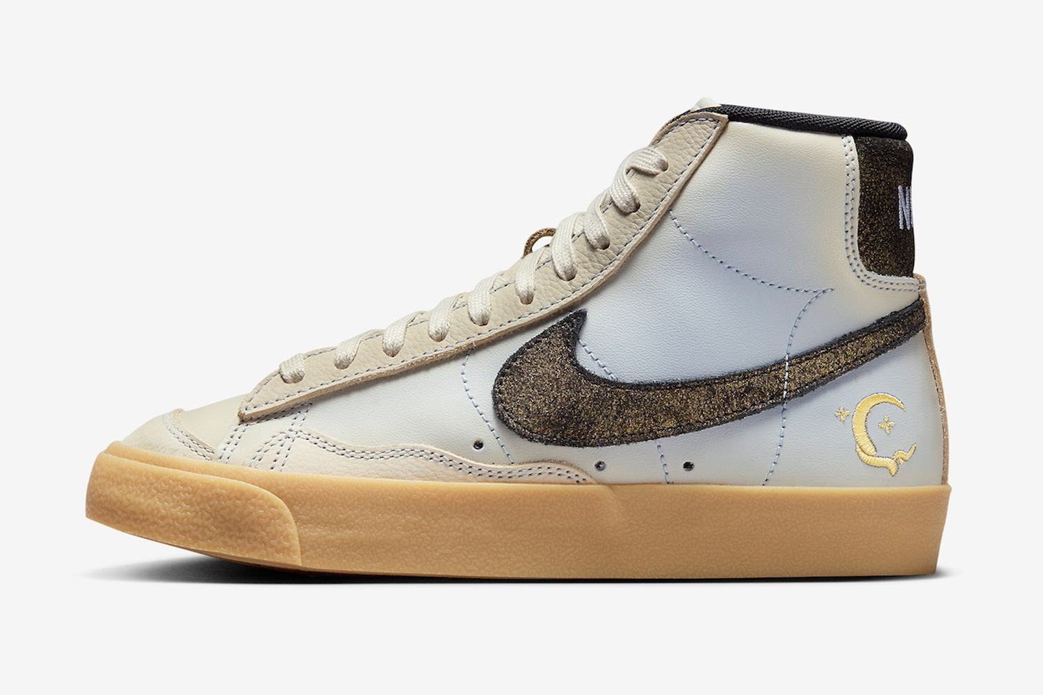 La silhouette più “quiet” della collezione, infine, è la Blazer Mid dove i principali ritocchi stilistici hanno interessato i ricami canonici della scarpa, che hanno subito un restyling più arrotondato in alcuni punti, e appuntito in altri. Le tonalità su cui si presenta la calzatura richiamano il chiaro di luna, con lo Swoosh dall’effetto “cracked”, proprio come la superficie lunare, che è il main theme della scarpa, come espresso dal ricamo posto sul tallone.