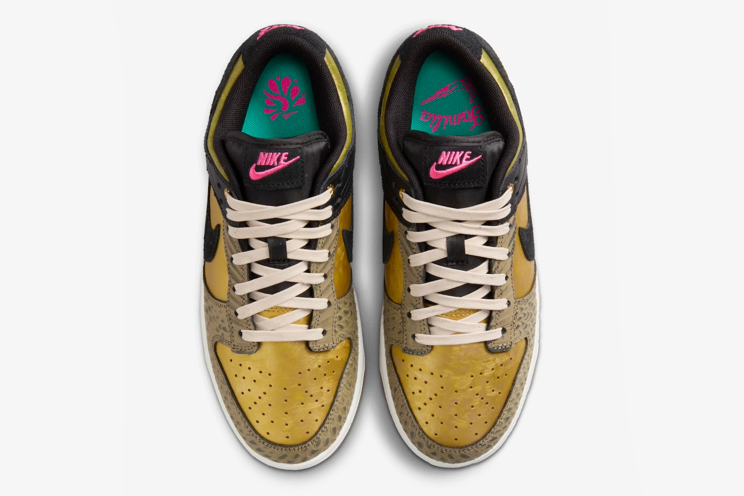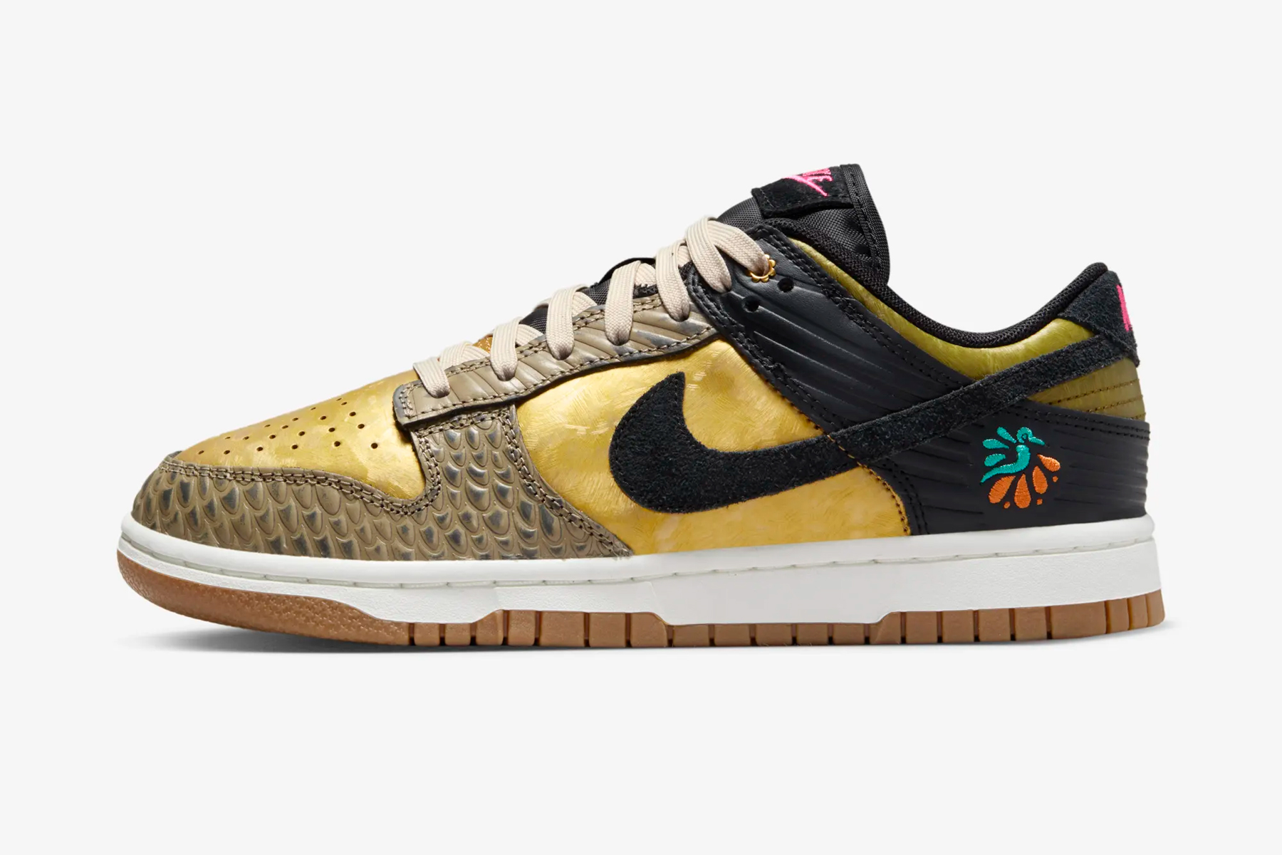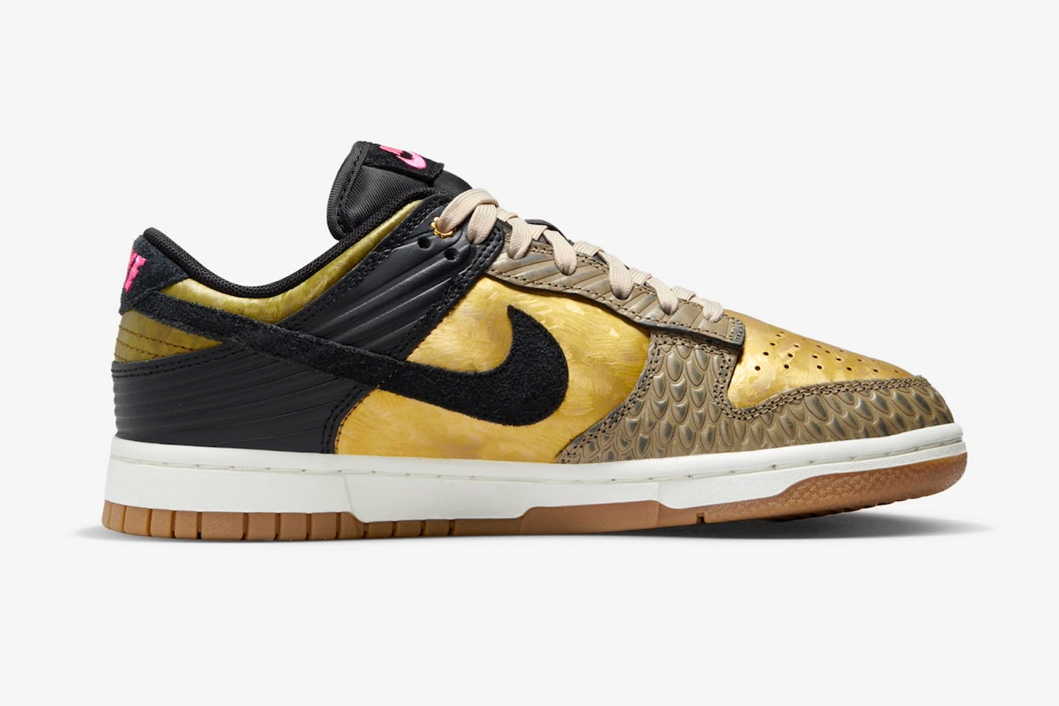 Iniziando con la variante Dunk Low, questa vede un mix di materiali accuratamente selezionati, come finta pelle di serpente, morbida pelle scamosciata e nylon, che esprimono eleganza e attenzione per i dettagli. Eccentriche sfumature dorate adornano la punta, il pannello laterale e il colletto, mentre la tipologia premium della fake snakeskin color oro impreziosisce gli occhielli e crea contrasto con i sobri lacci color crema e la linguetta nera.
