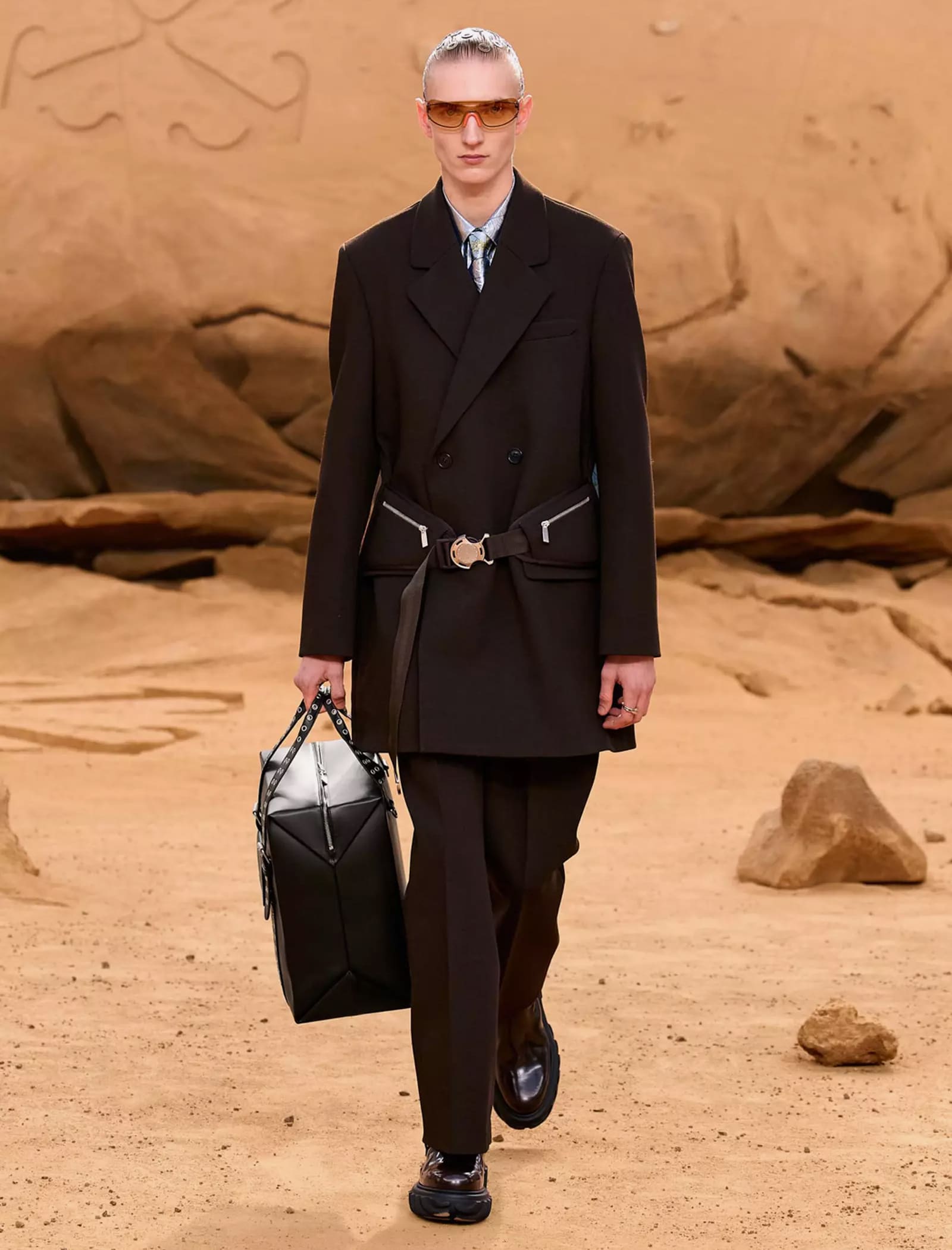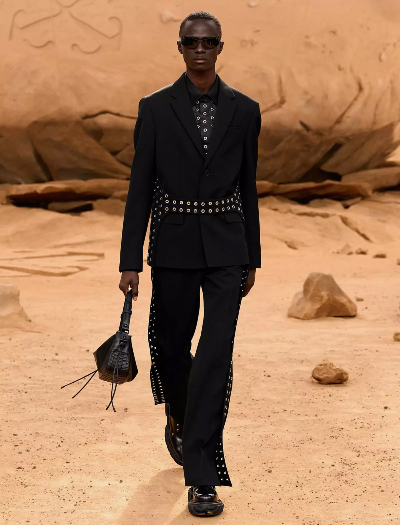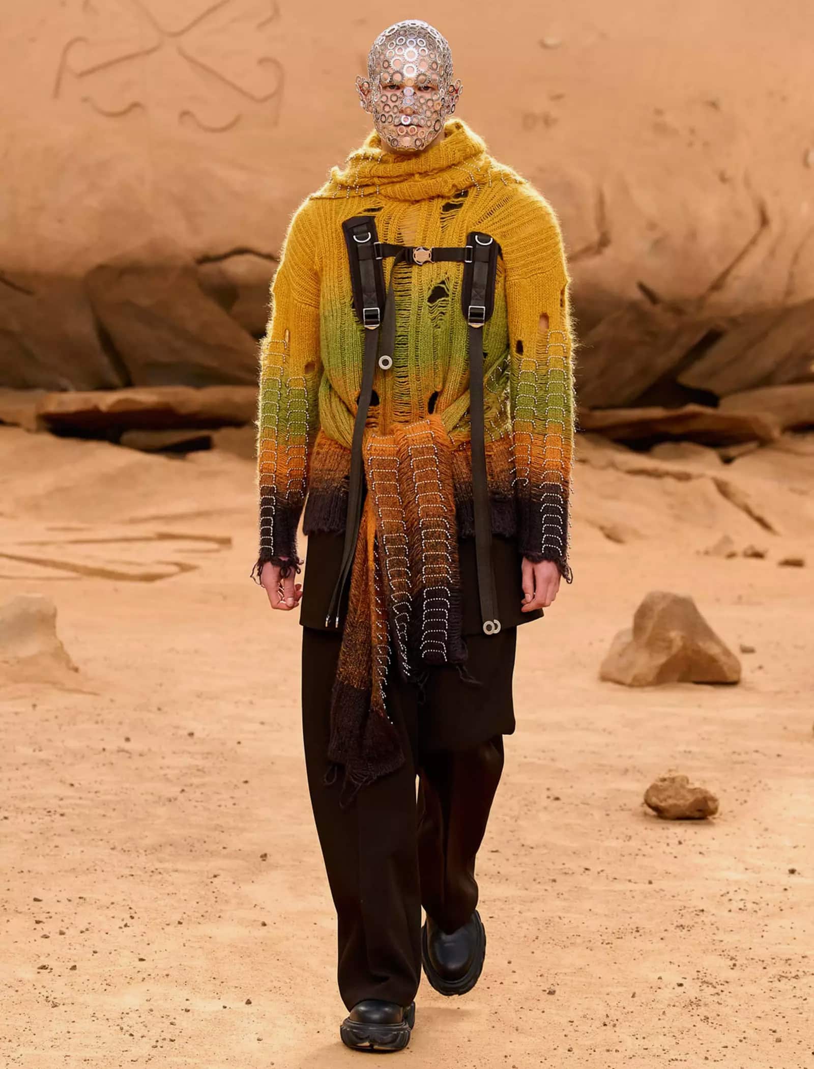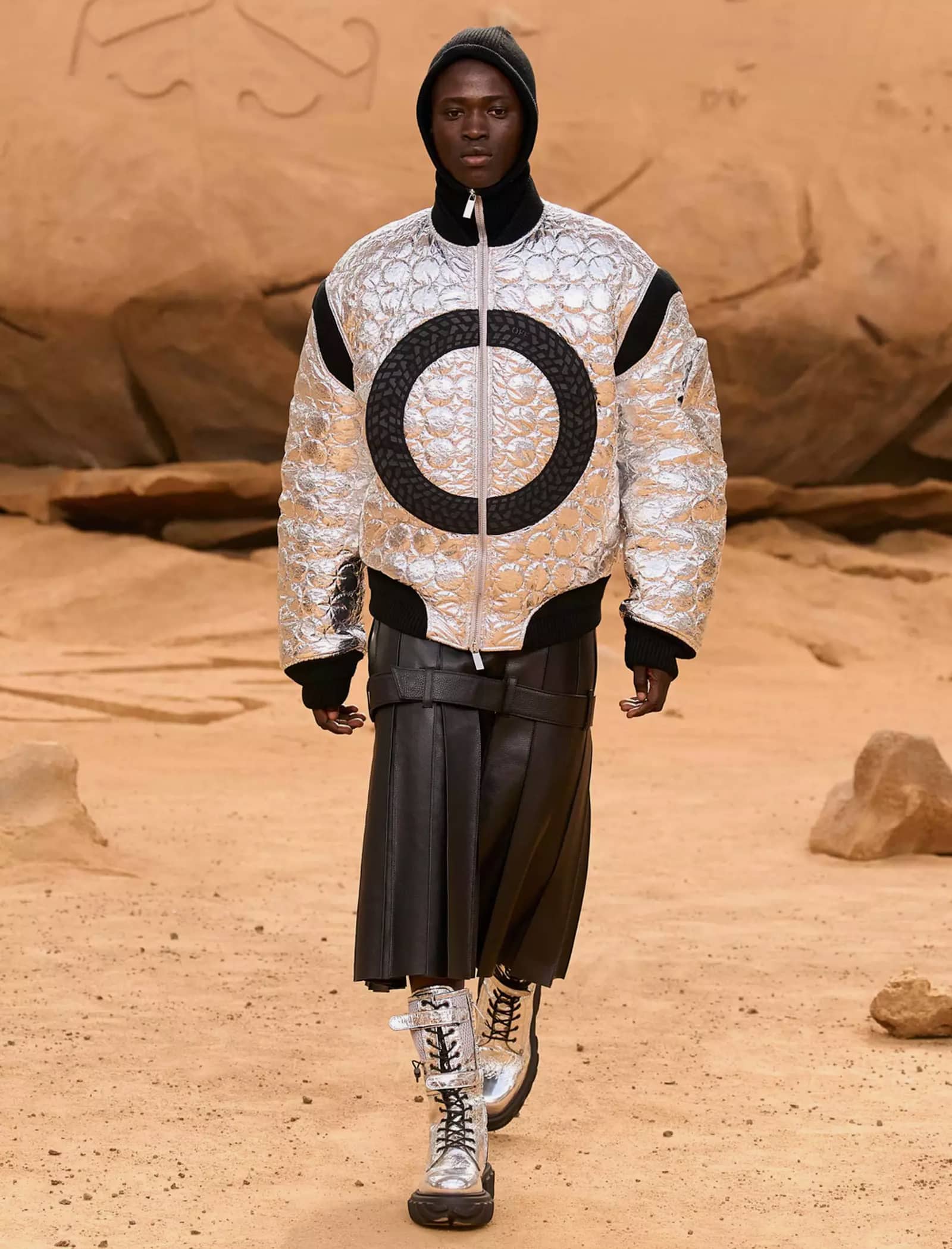 I capi svelati per la FW23 “LUNAR DELIVERY“ potrebbero tranquillamente rappresentare abiti di scena per il sequel di Interstellar, indossati da uomini e donne che tornano sulla Terra dopo un lungo vagare extraterrestre portando con sé look audaci e dai forti echi metal e steampunk: tute e completi decostruiti trovano la loro dimensione sulla sabbia post-apocalittica, calcata da modelli asettici e freddi, in linea con gli indumenti borchiati, con fibbie e ingranaggi che indossano. È un essere umano futuristico, a tratti irriconoscibile, ma che incarna l’evoluzione naturale del metro stilistico di Off-White rimaneggiato da Kamara.
