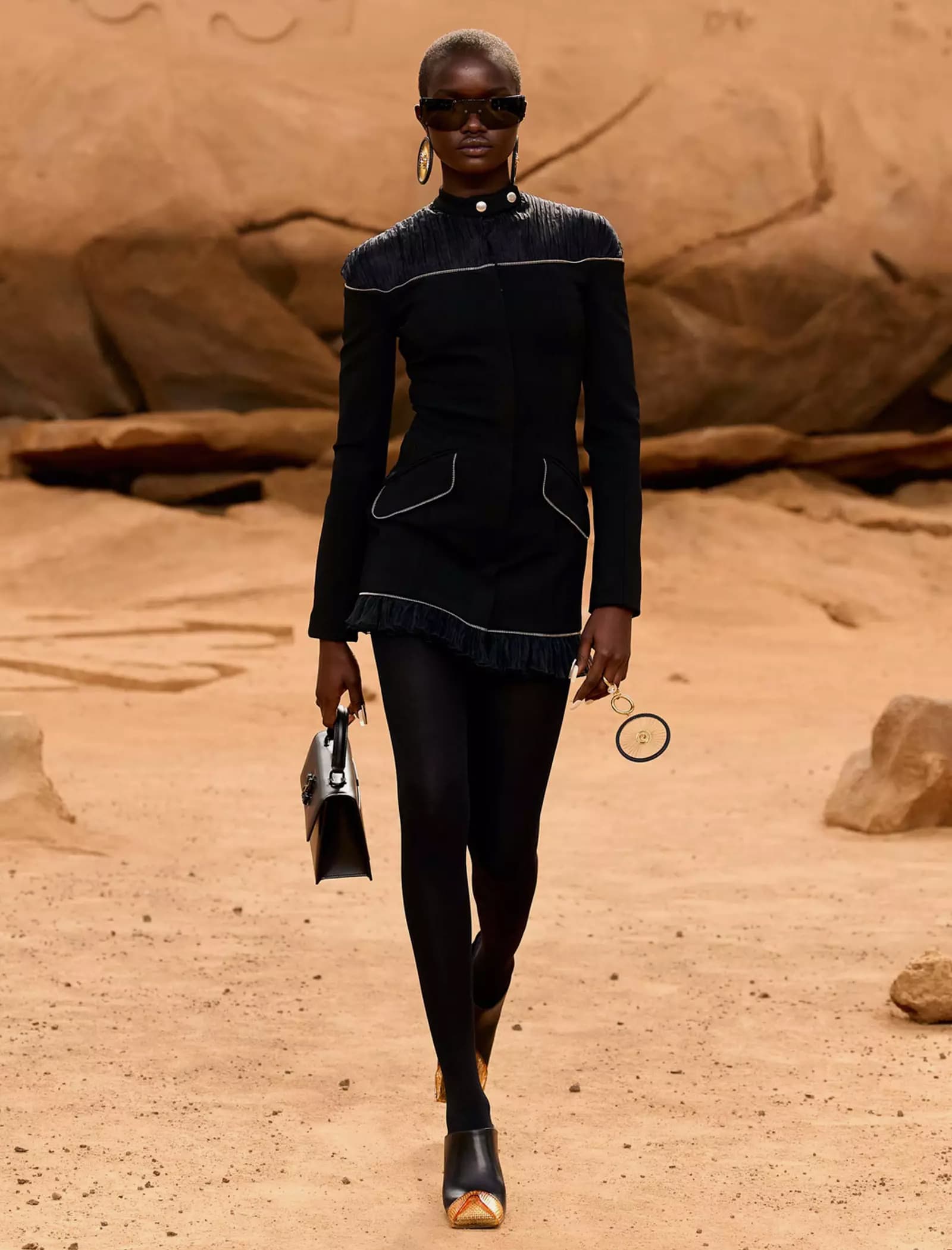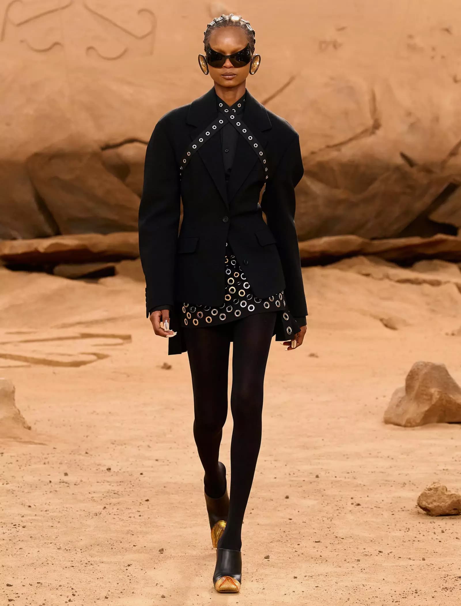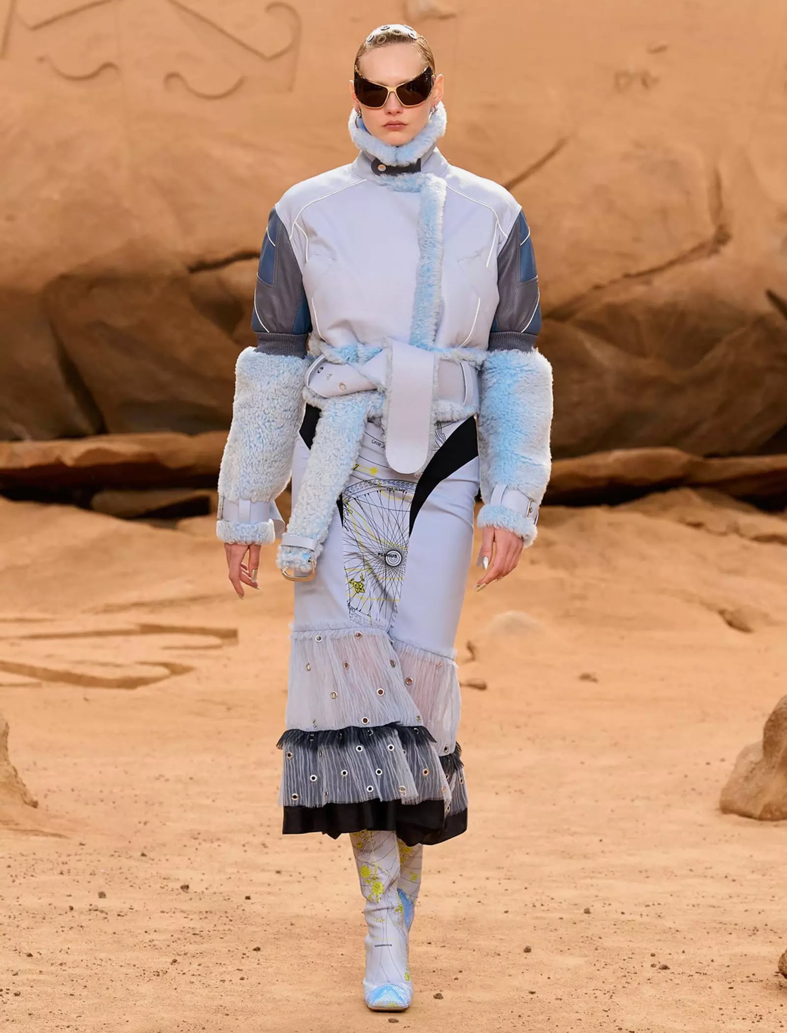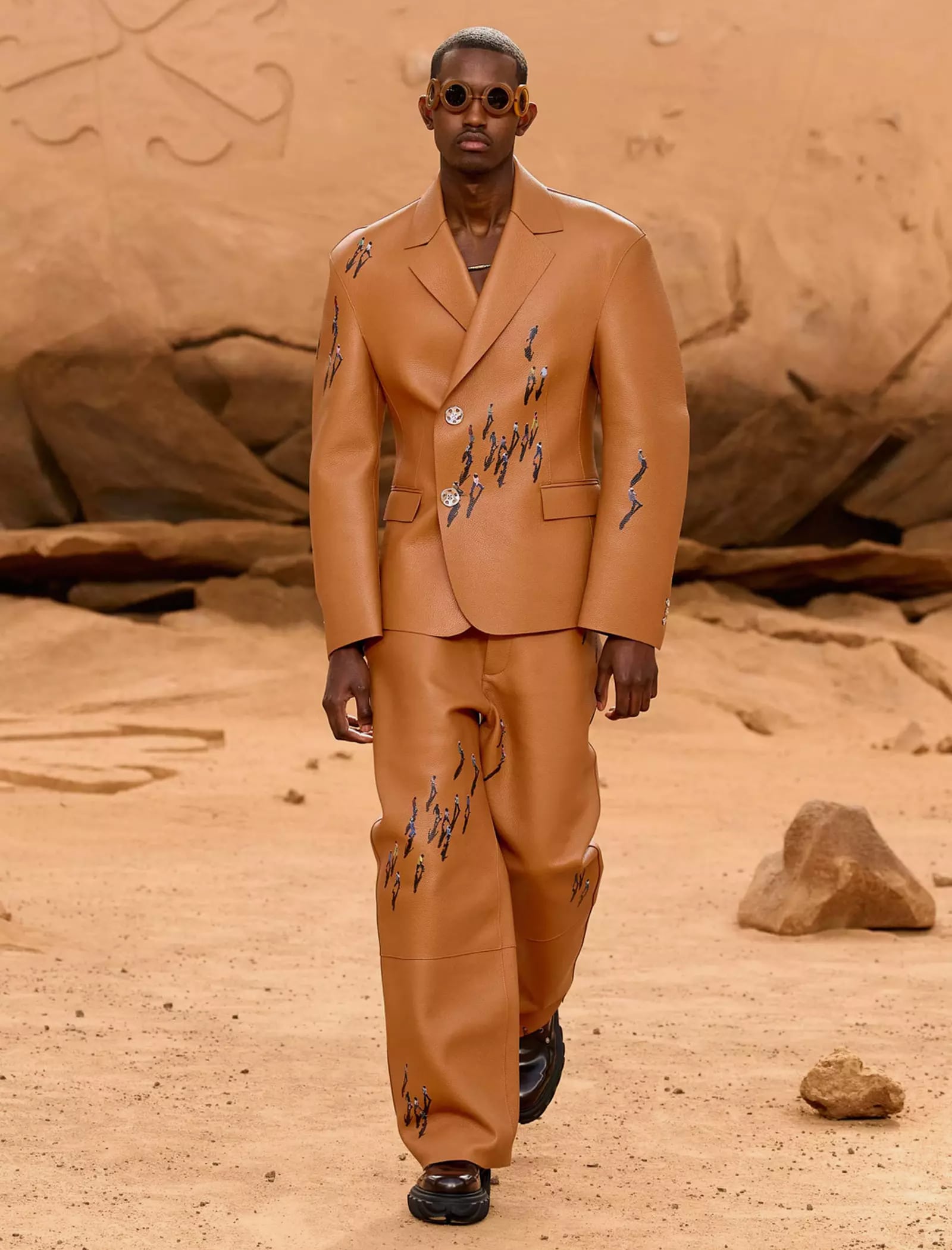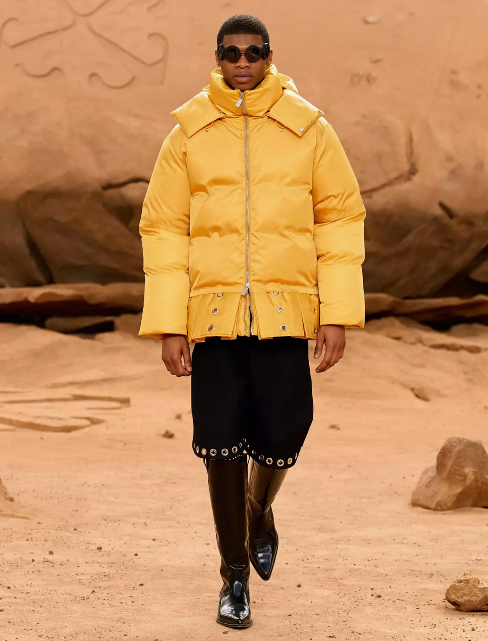 I capi svelati per la FW23 “LUNAR DELIVERY“ potrebbero tranquillamente rappresentare abiti di scena per il sequel di Interstellar, indossati da uomini e donne che tornano sulla Terra dopo un lungo vagare extraterrestre portando con sé look audaci e dai forti echi metal e steampunk: tute e completi decostruiti trovano la loro dimensione sulla sabbia post-apocalittica, calcata da modelli asettici e freddi, in linea con gli indumenti borchiati, con fibbie e ingranaggi che indossano. È un essere umano futuristico, a tratti irriconoscibile, ma che incarna l’evoluzione naturale del metro stilistico di Off-White rimaneggiato da Kamara.
